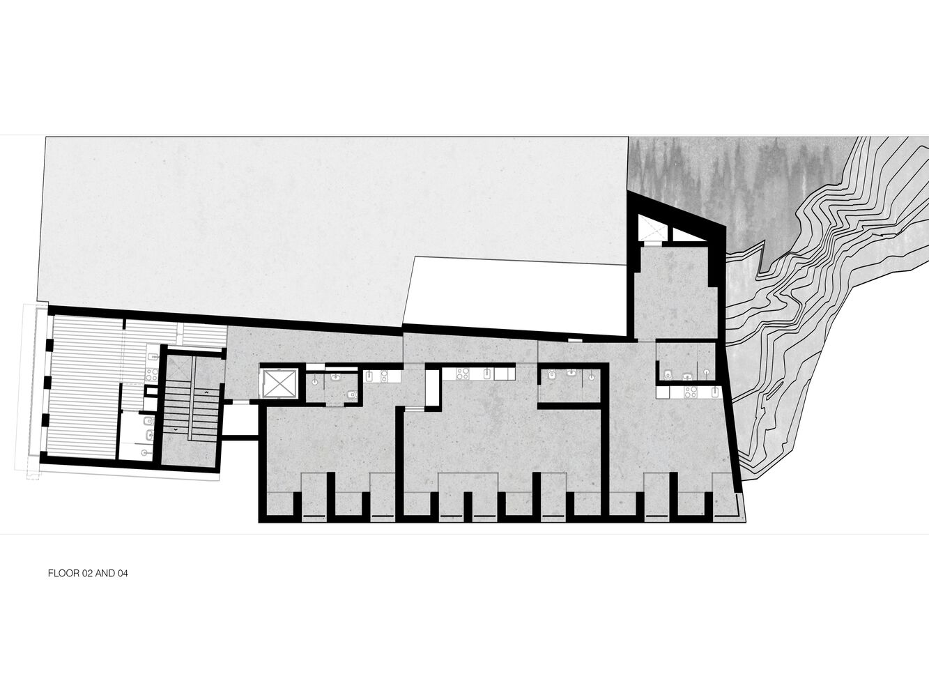 The urban 1940’s demolition generated an open "wound" in the city centre, an urban void that exposed the mentioned granite escarpment, presently maintained and requalified by the municipality as a landscape fragment. The project links those “artificial” and “natural” pre-existences, but also the “monumental” and “residential” scales which surround them. A monolithic block, built in exposed concrete, hammered “in situ”, conforms itself to those prevailing shapes and scales.