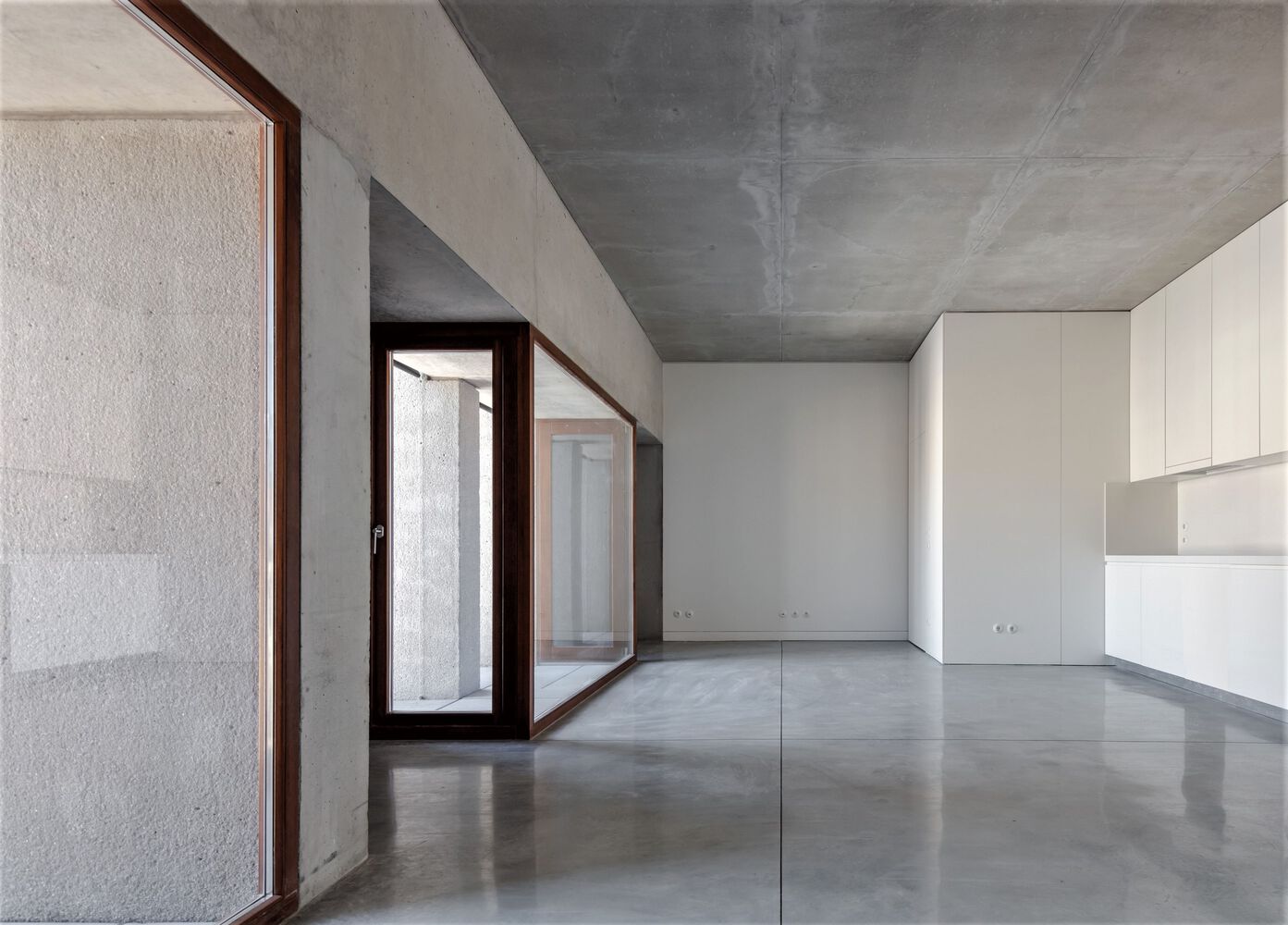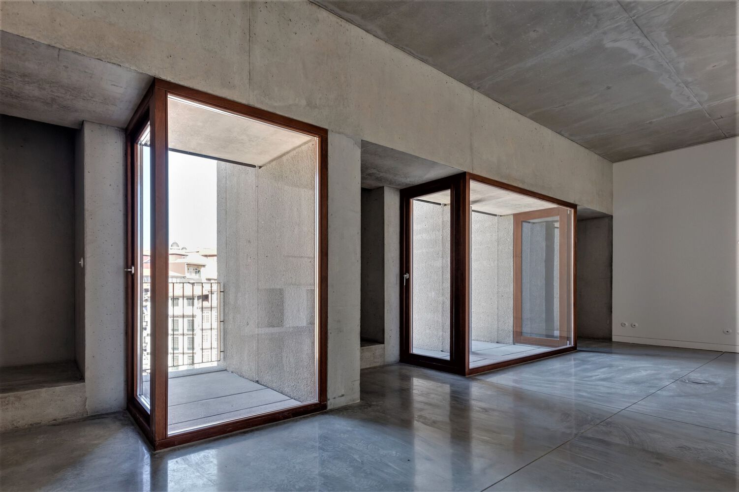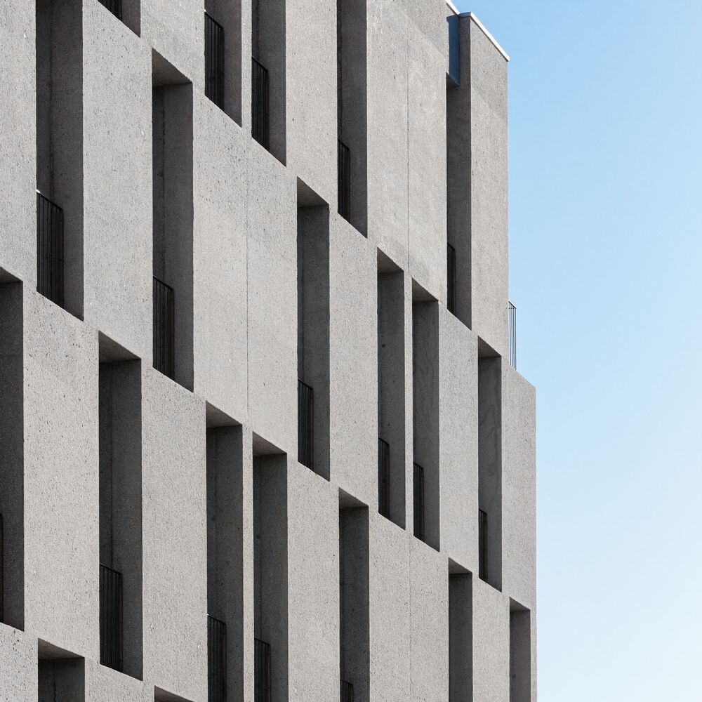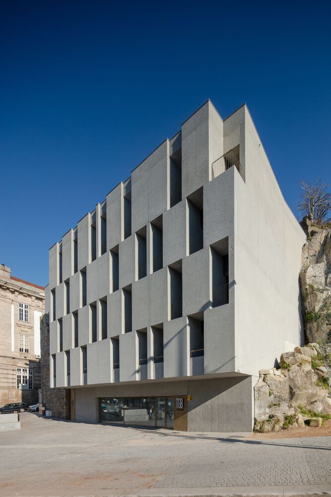 In response to the program required by the client – sixteen apartments, mainly studios –the concrete block accomplishes two purposes, translated into two distinct volumes: one of them absorbs and complements, by affinity, the 18th Century stone façade; the other inaugurates a new front on the Modern avenue. A "gap” between the two volumes marks the entrance, reception and vertical accesses to the different apartments. Four of those apartments fill up the volume that contains the granite corner façade; the other apartments are distributed in the new volume, in which interior spaces are marked by concrete niches, but also by different views of the urban surroundings, observed through the new windows and balconies. On the ground floor, a restaurant space relates both volumes.