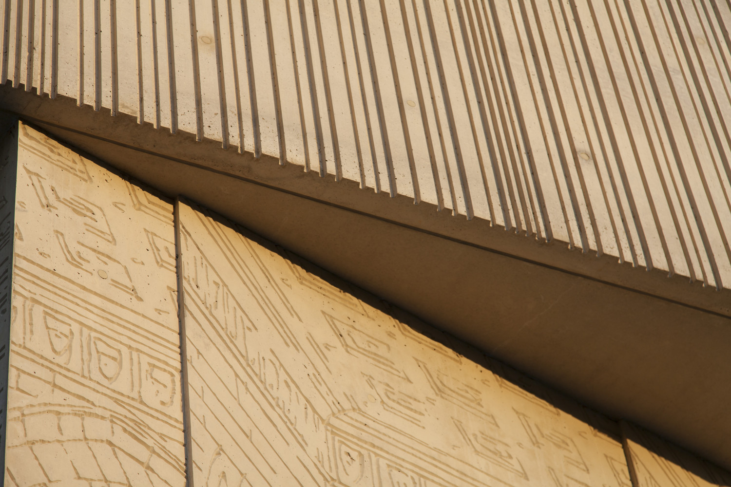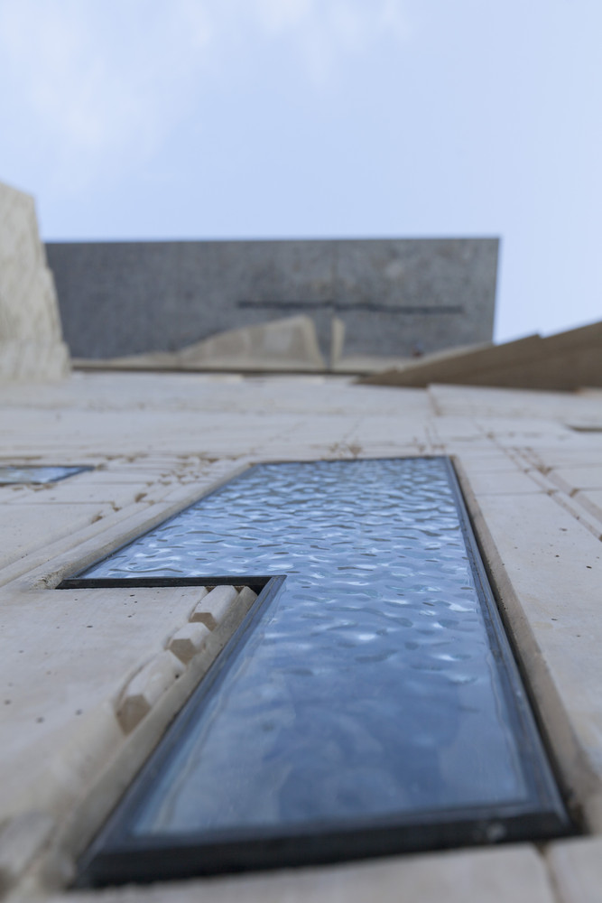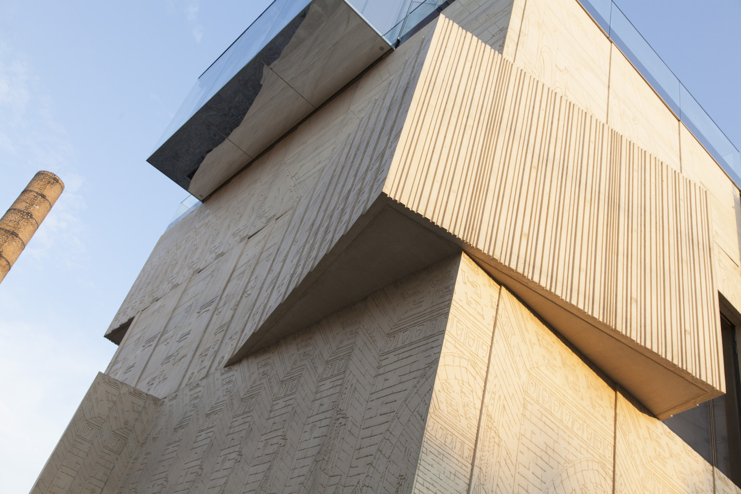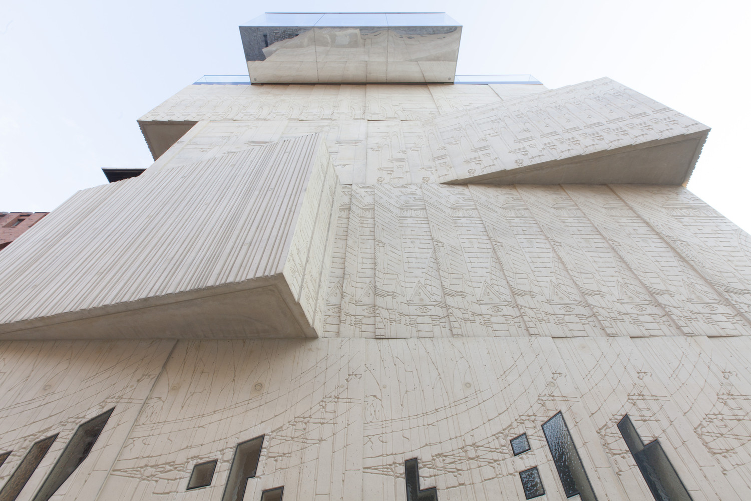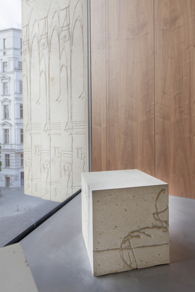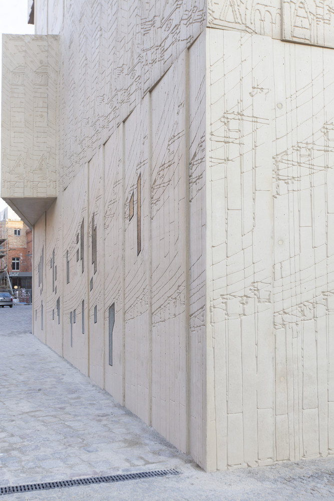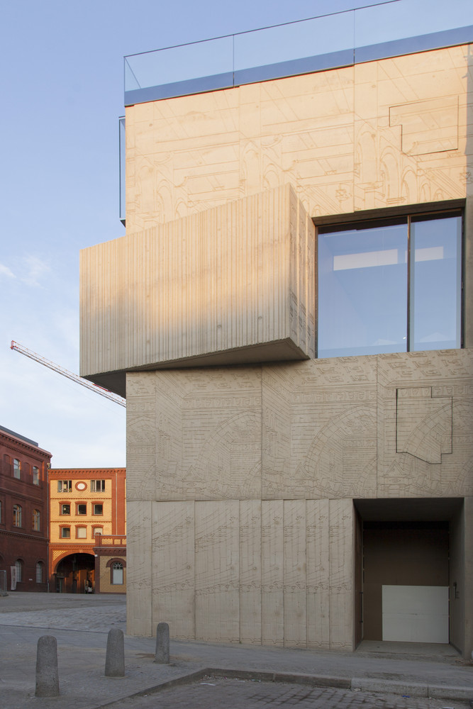 The Museum for Architectural Drawing is an exceptional example of contemporary architecture in its construction, design and choice of materials. The powerful expression of its formal language cannot be overlooked though it still responds sensitively to its surroundings. The coloured concrete and glass façades of the building are rich in contrast and layers. Its closed surface is detailed with strong magnified fragments of architectural sketches in relief form. The museum has a floor area of approximately 490 square metres, and contains an entrance area, two exhibition rooms, the museum depository and a conference room.