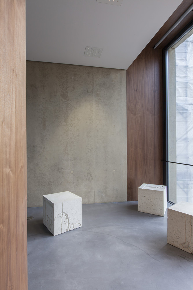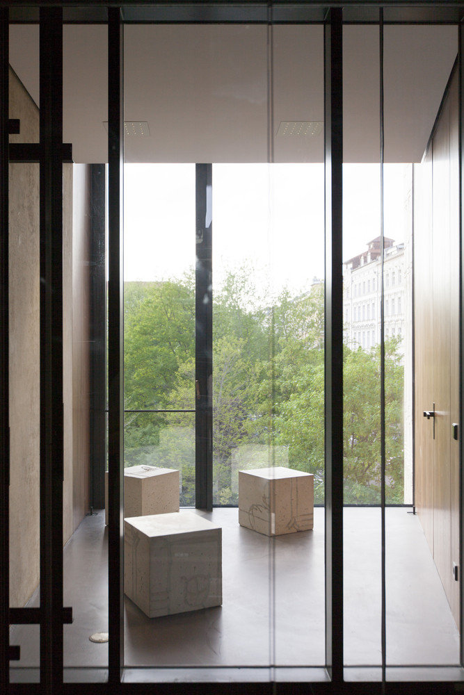 The striking construction is extended from a fire-wall and latches onto a row of typical old Berlin houses. The Museum for Architectural Drawing is a four-storey solid corpus with a glass floor stacked on top. The profile of the four floors is reminiscent of casually piled up blocks. The building’s silhouette is created by a regression and progression of façade elements, and demonstrates a freedom of form that relates to the conventions of the neighbouring historic Berlin buildings and yet is unorthodox and minimalist in its gesture.