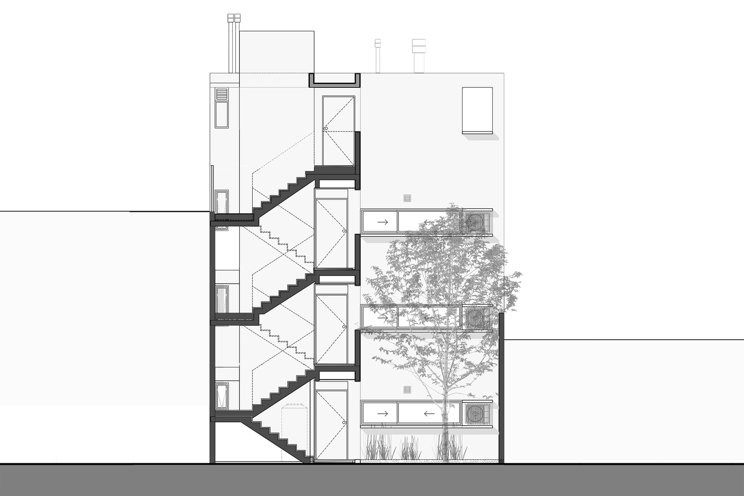 The ground floor is free to the front for pedestrian access and garages and is completed with a flat with its own backyard. The stairs and the hallways are related to the patio. The third floor allows each unit to have its individual terrace with a barbecue to reformulate its own patio in height.