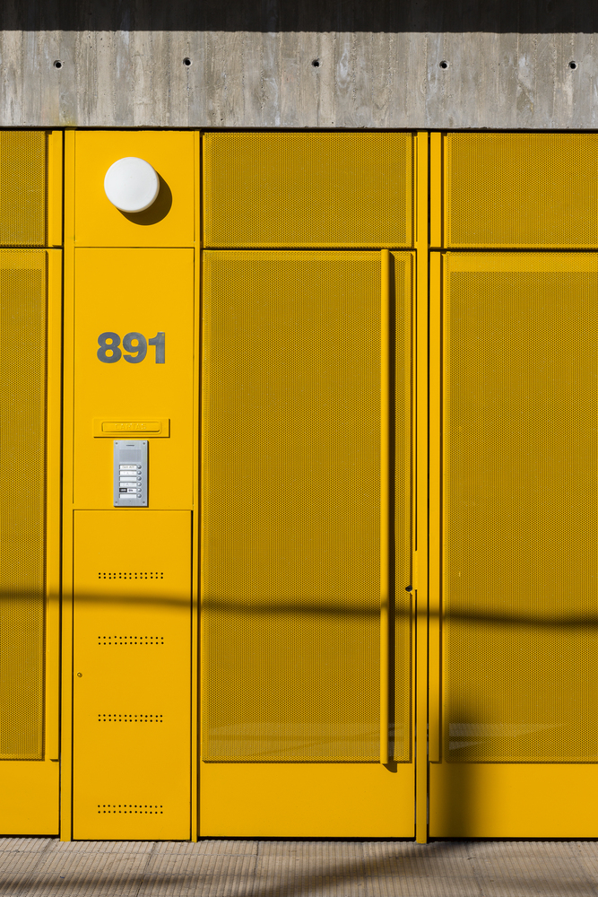 The exposed concrete, the large edge-to-edge windows, the textured white walls, and the linear space generated by the tensioners that will receive vegetation, give the whole a contemporary and stripped-down aesthetic. The yellow microperforated sheet metal gate illuminates and stands out by contradiction, provides privacy as well as visual permeability depending on the time of day. The material continuity of the pavement of the sidewalk dissolves the limits reinforcing the idea of prolonging the public over the private, improving the pedestrian experience of the neighborhood.