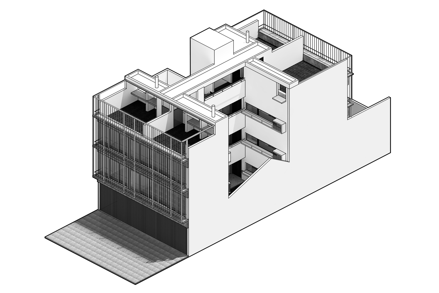 Two functional units are defined per floor, which take the entire width of the lot, both in the front and in the back part of the building, separated by the Avocado Patio and the stairs on the north side. This arrangement allows multiple visual continuities, cross ventilation, and lighting.