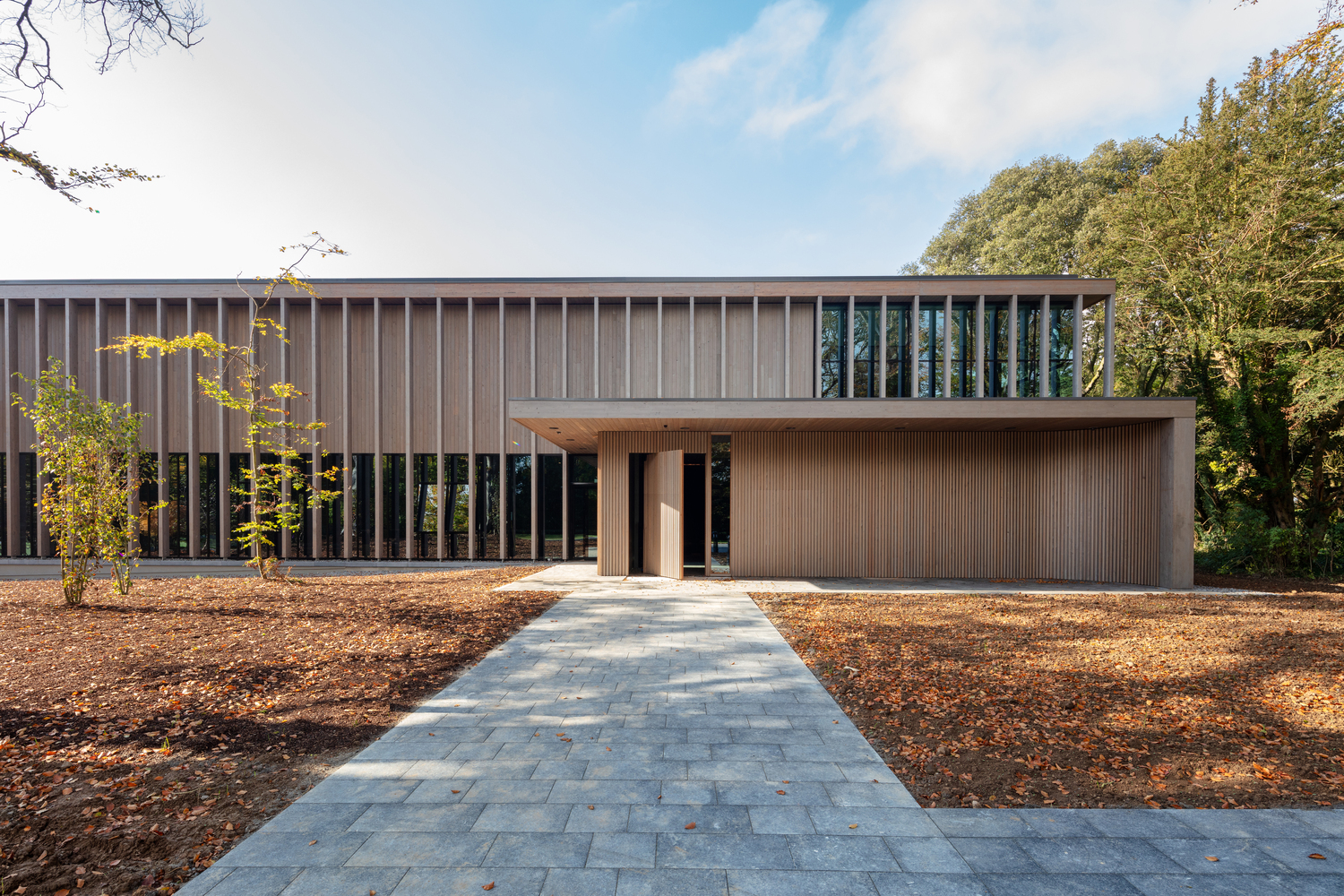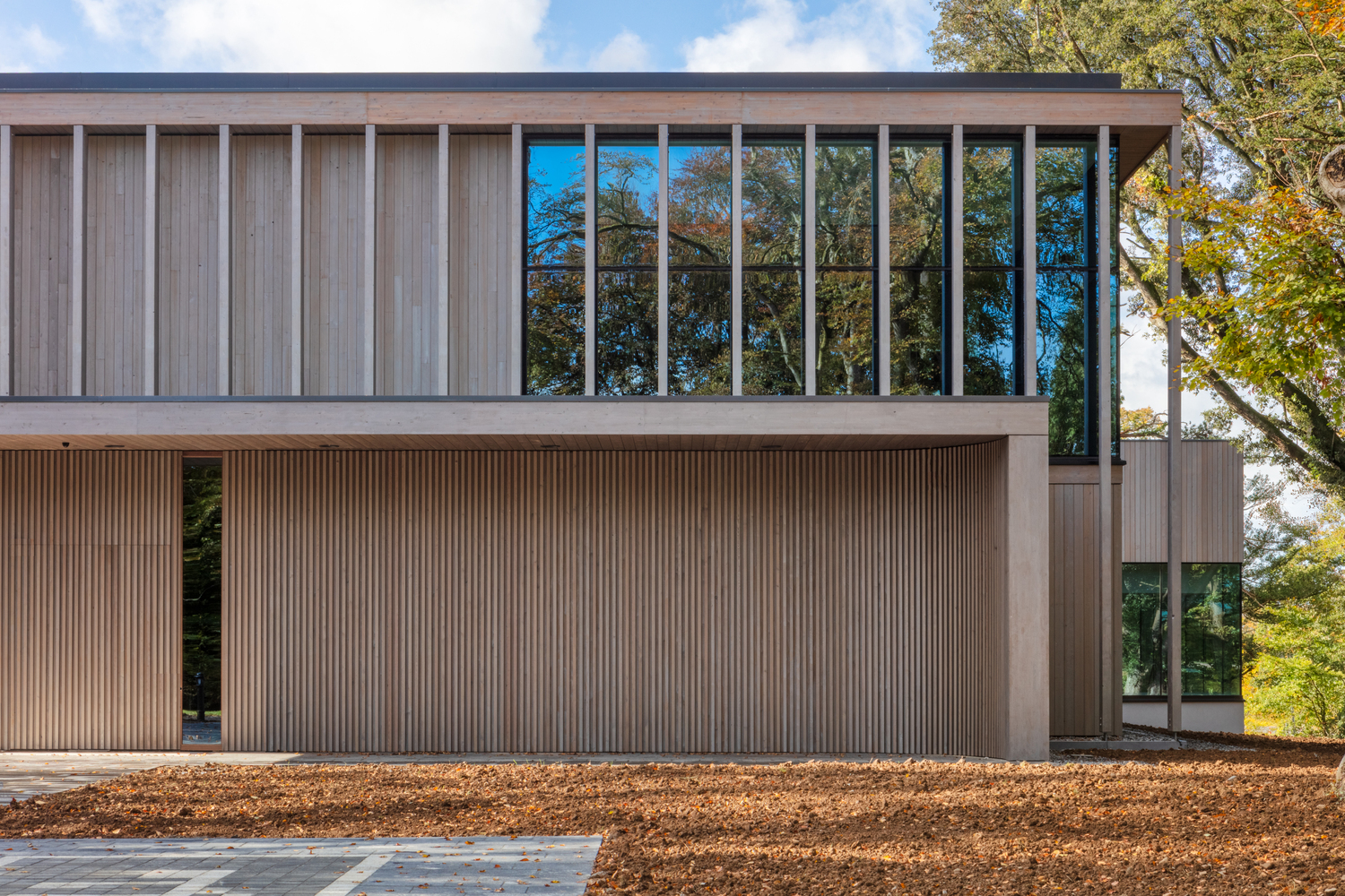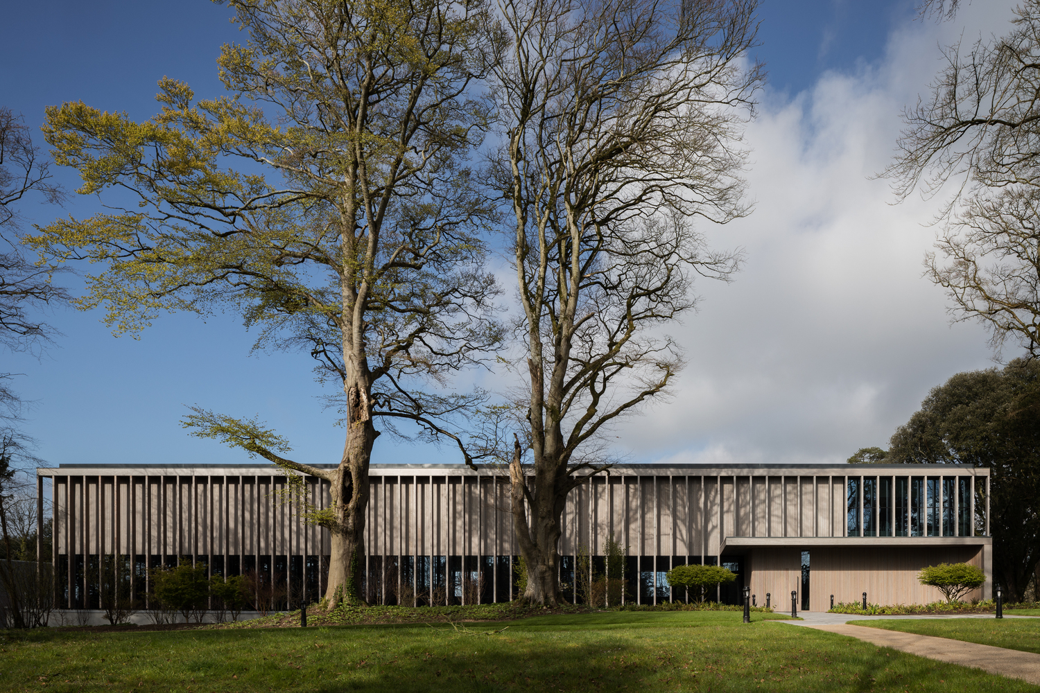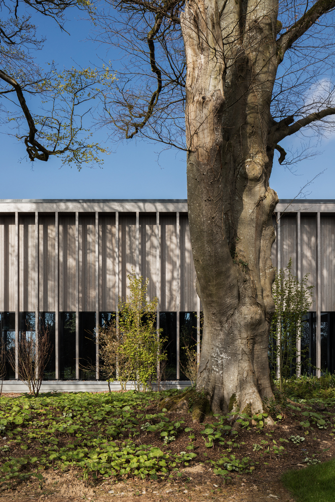 Materials such as wood, glass, and limestone were carefully chosen to ensure that the building and site context would be seamlessly integrated. The design approach was to nestle the building into a mature woodland setting.