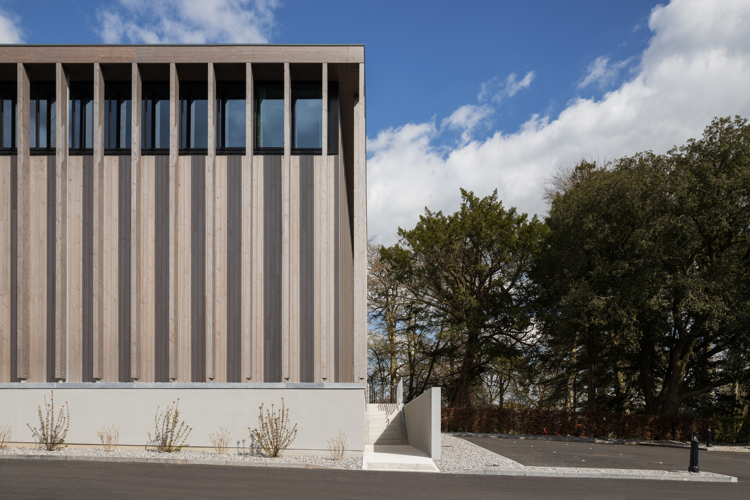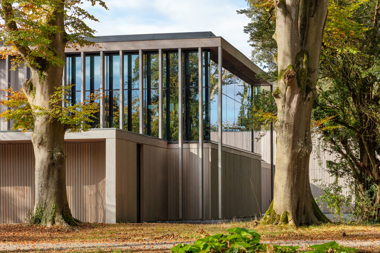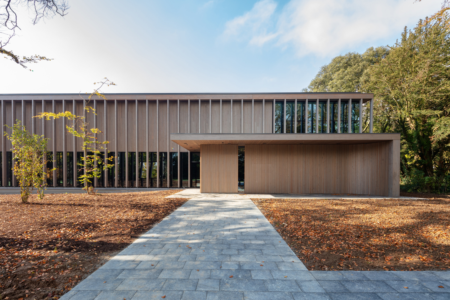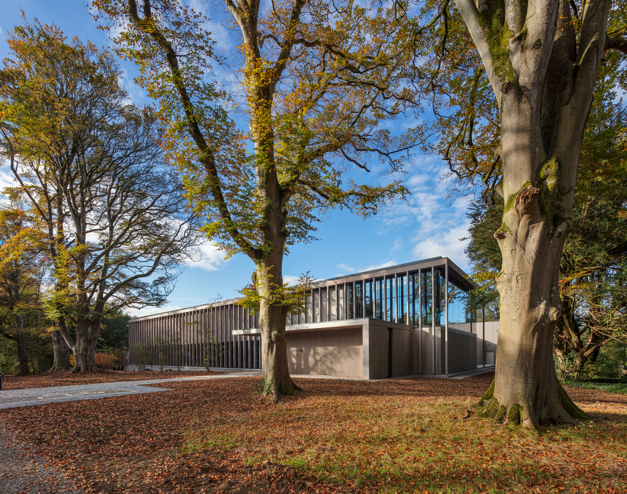 Materials such as wood, glass, and limestone were carefully chosen to ensure that the building and site context would be seamlessly integrated. The design approach was to nestle the building into a mature woodland setting.