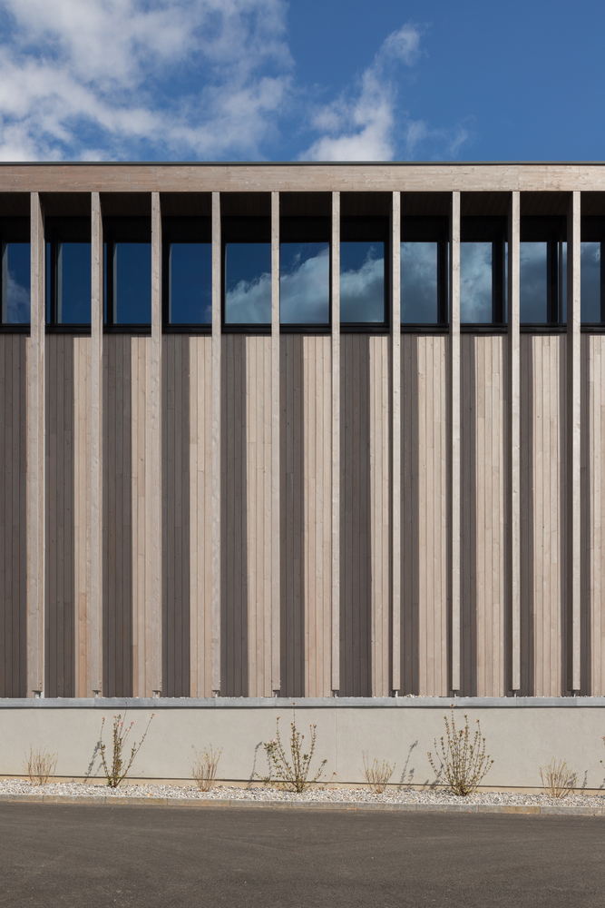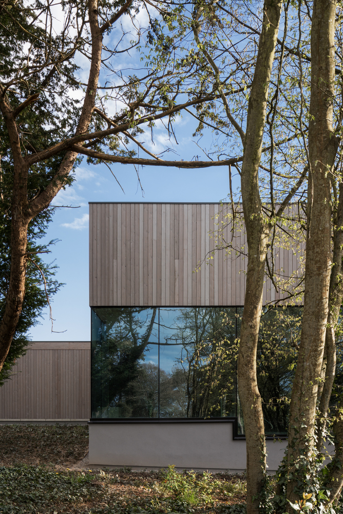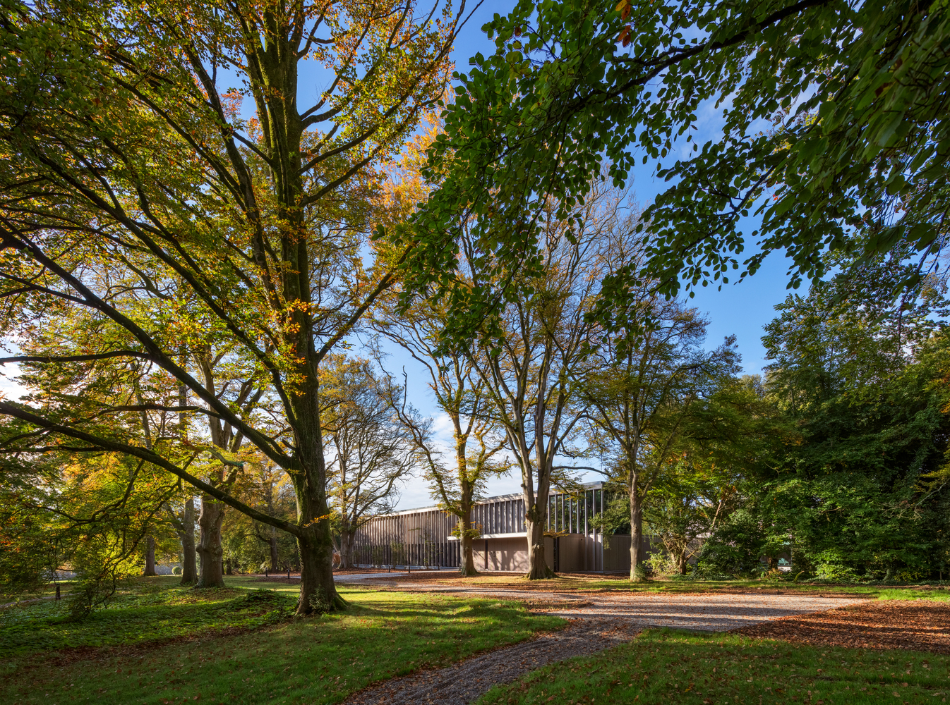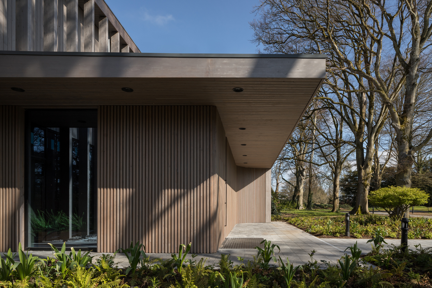 Materials such as wood, glass, and limestone were carefully chosen to ensure that the building and site context would be seamlessly integrated. The design approach was to nestle the building into a mature woodland setting.