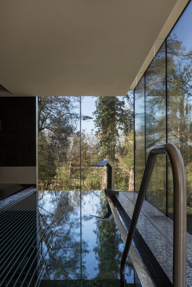 The pavilion-like building sits on a low-lying plinth that unifies the building with the surrounding topography while giving a sense that the structure is floating above the protected landscape. The plinth occupies the basement level and is semi-submerged to take advantage of a natural fall of more than 2500mm across the existing site. This level difference is used to accommodate the services required for the operation of the building and the pool.
