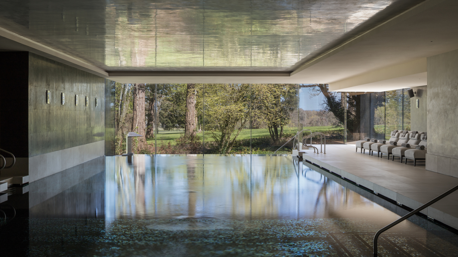 The main volume addresses Beechwood Avenue and is parallel to the existing axis of the historic estate. This volume accommodates the main reception, a golf simulation space, two padel tennis courts, a gym, and a yoga/pilates studio. The volume is orientated East/West to avail of solar gain. The padel courts open to the east at a low level bringing the filtered morning light through the trees of Beechwood Avenue.