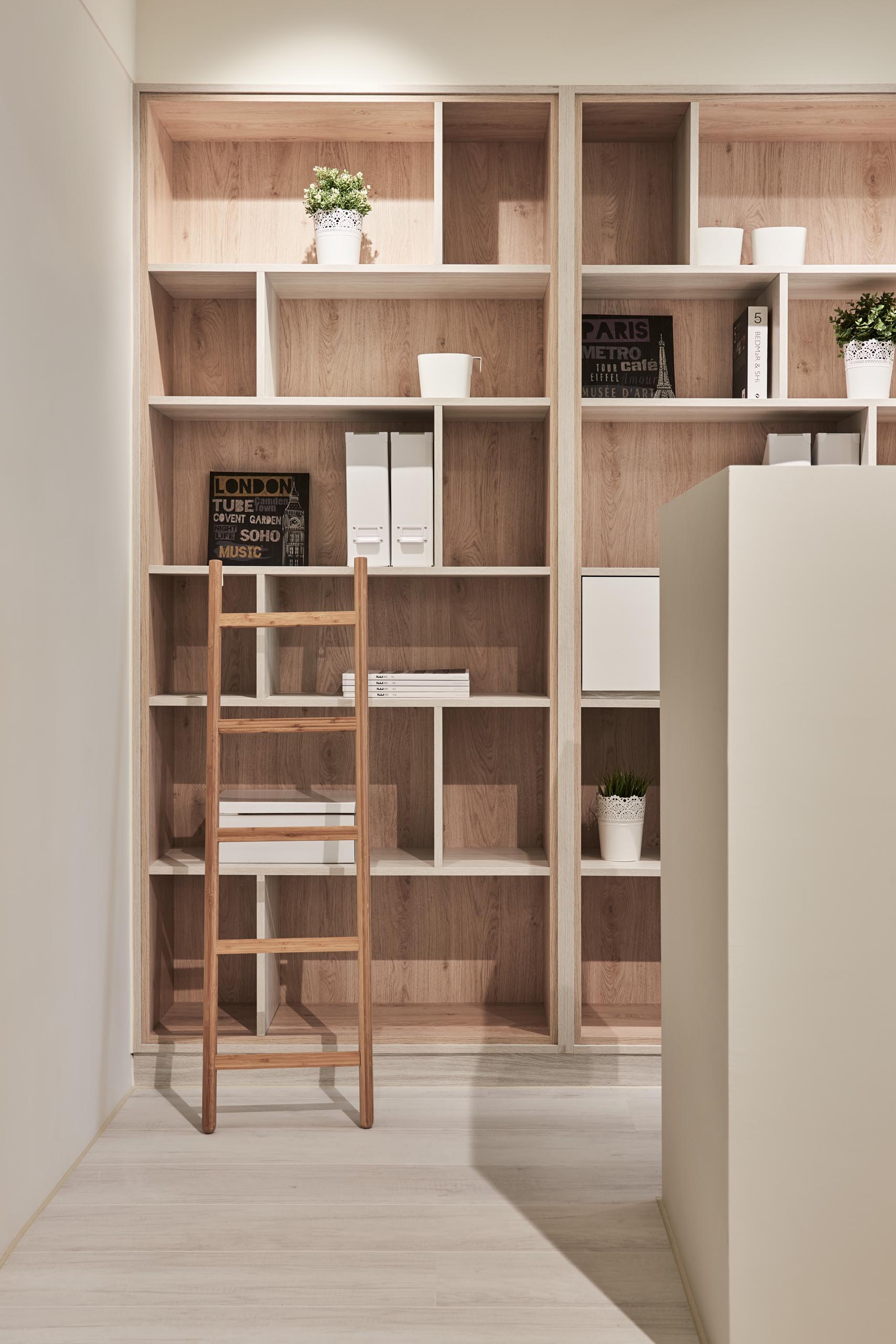 Visible from the living room are floor-to-ceiling built-in wood-lined bookshelves that provide an abundance of storage for books, folders, plants, and decor items. There’s also a small ladder that makes it easy to reach the top shelves.
