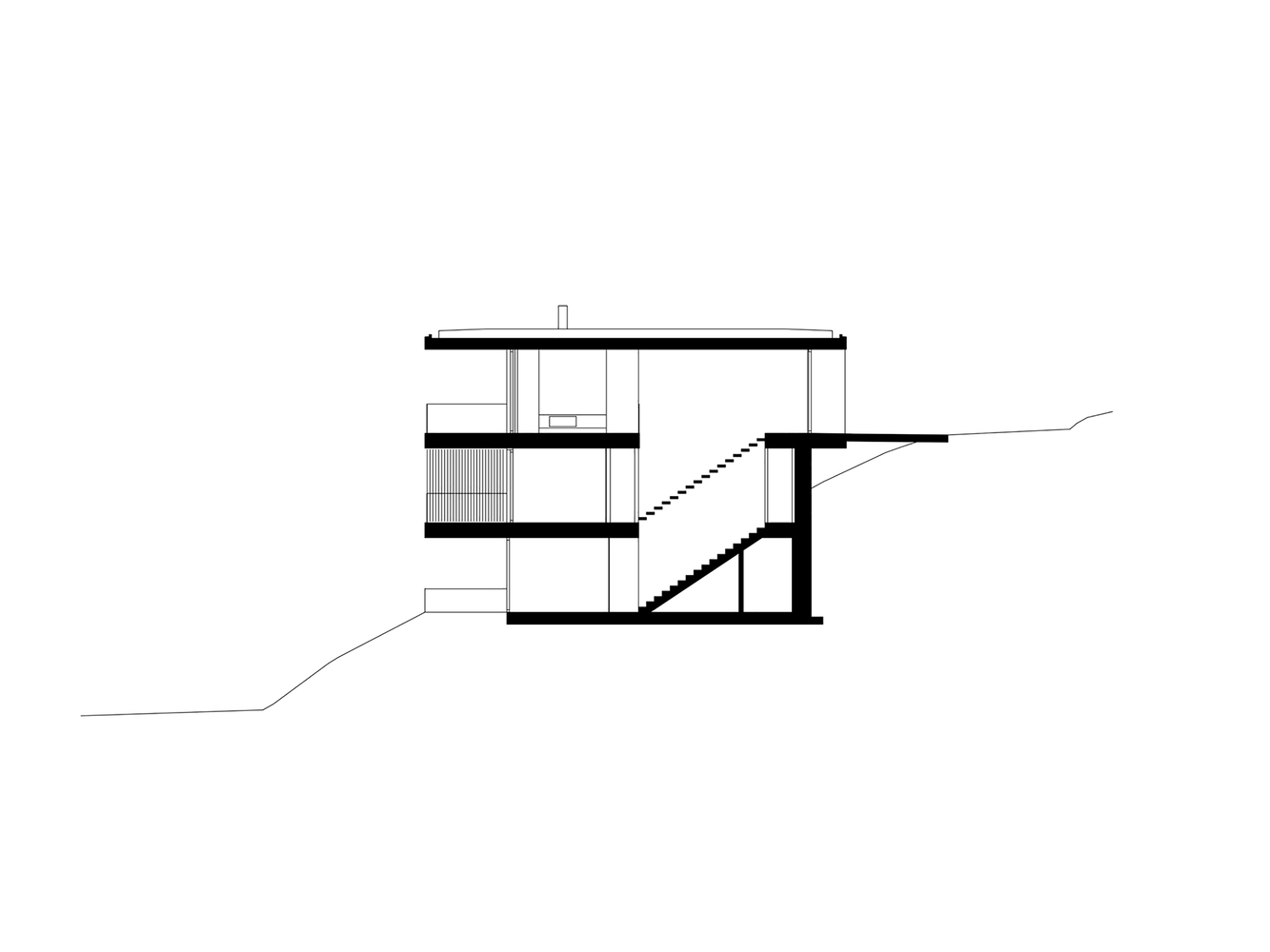 집으로 들어가기 위해서는 도로에 면해 있는 넓은 브릿지를 건너, 건물의 최상층에 있는 현관으로 가야 합니다. 현관이 위치한 최상층에는 차고와 게스트룸, 그리고 넓고 개방된 거실이 배치됩니다. 최대한의 개방감과 투명성을 지향하도록 설계되었으며, 이에 따라 독립적인 주방도 개방감 있는 공간으로 구현되었다. 남측 전체는 통유리로 설치되었으며, 테라스가 배치, 경사면 아래로 펼쳐지는 환상적인 전망을 제공합니다.