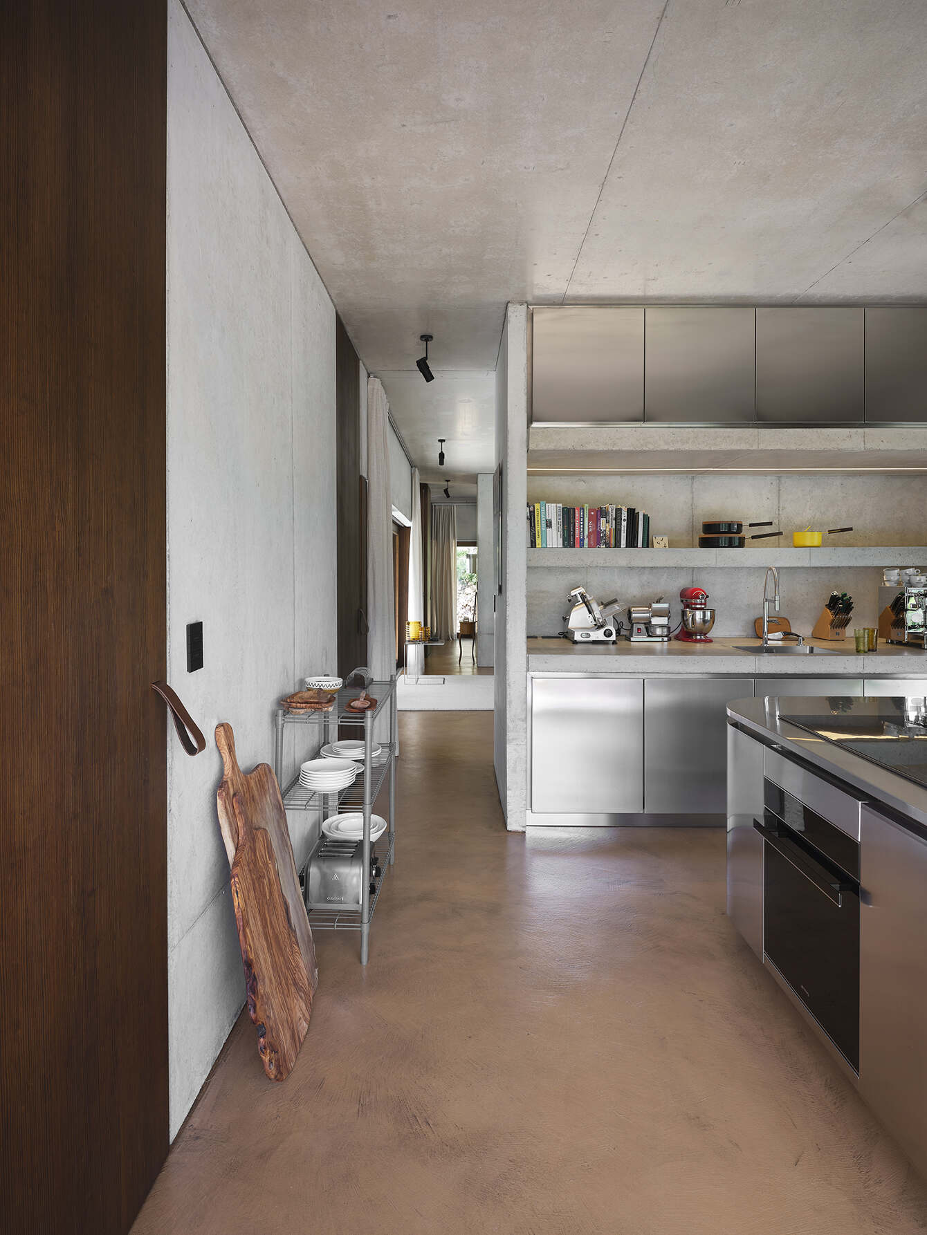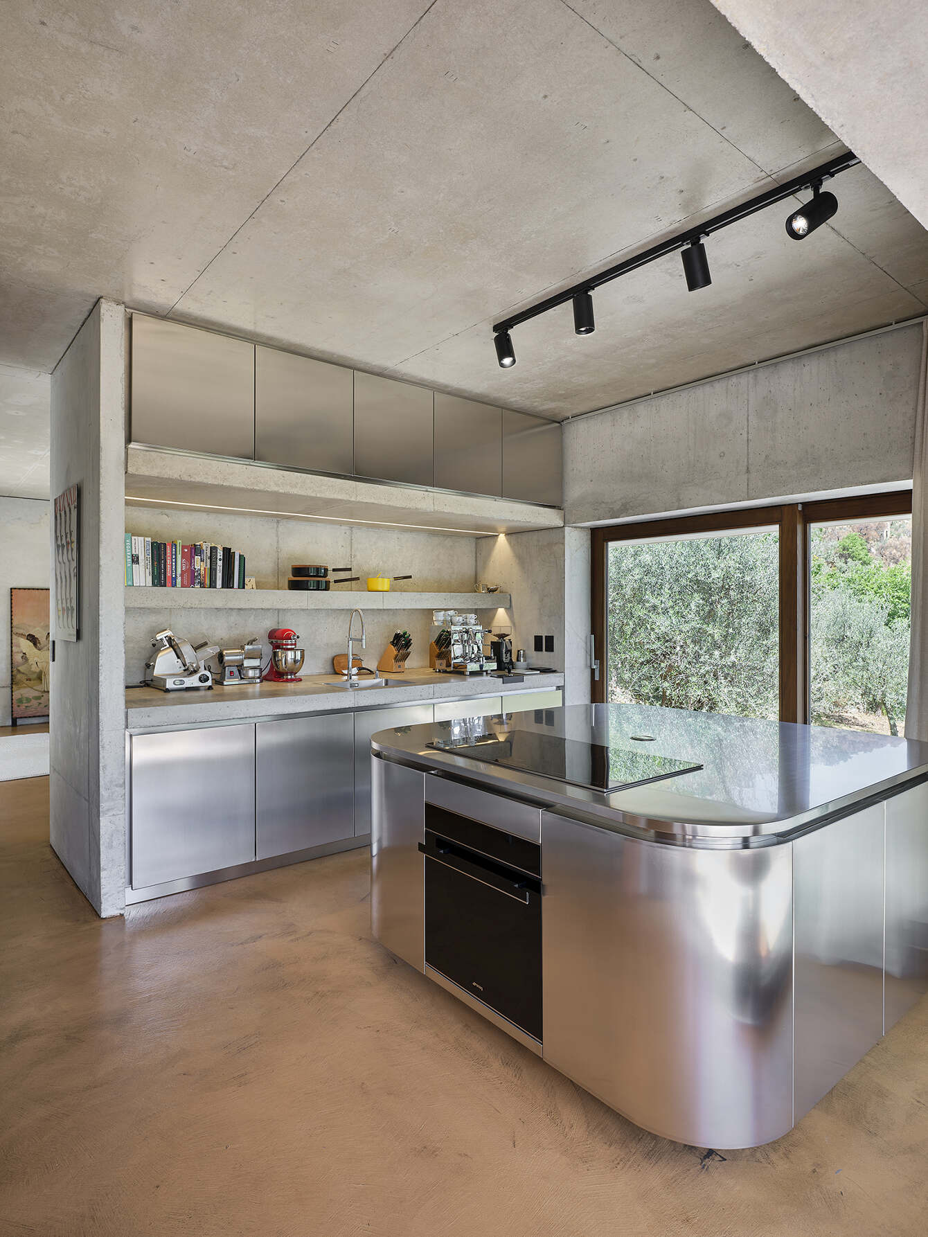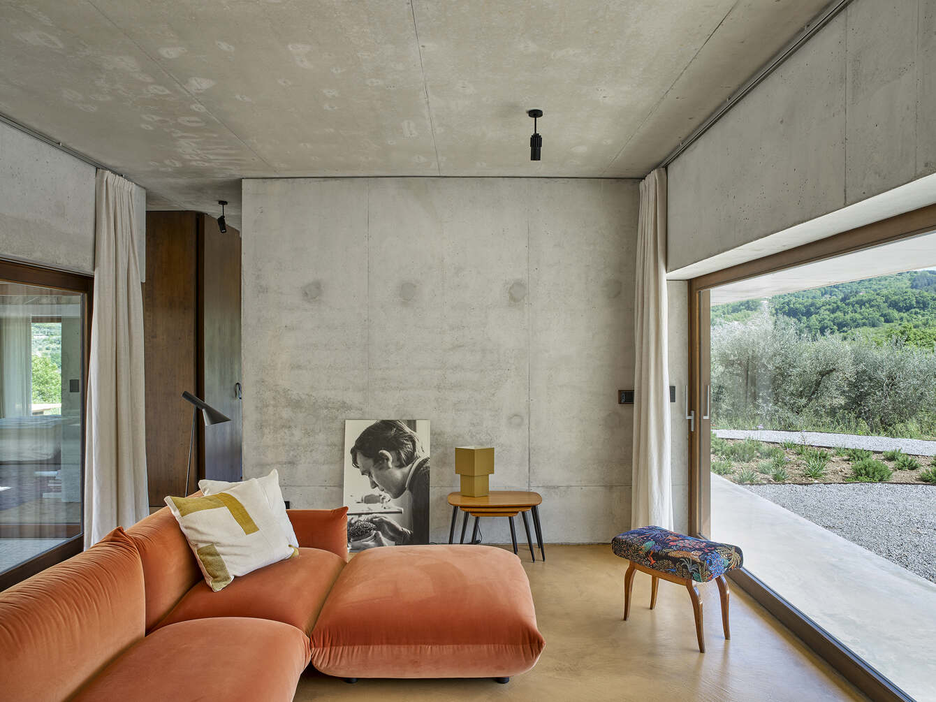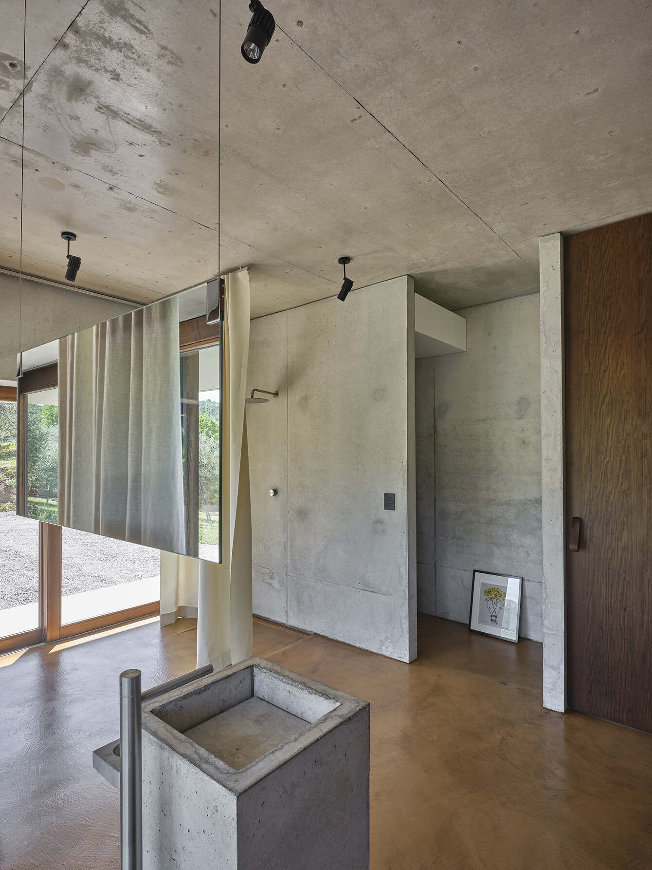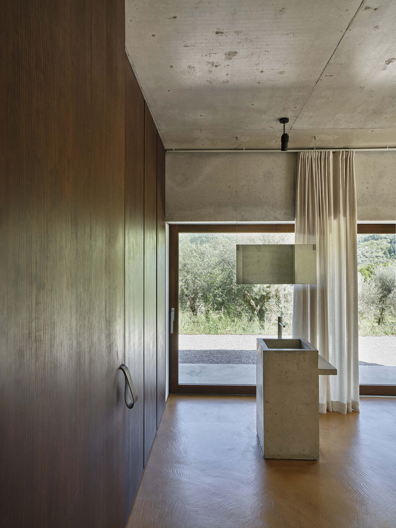 The spaces in the house are geometrically configured around a central patio of Roman-Italic reminiscence: “Atrium Tusculanum”. The interior is just structure and raw materials aimed at celebrating the contemporary approach to detail solutions. The floor is made of cementitious resin and it has the color of sun-scorched grass in the warmer months and chestnut leaves in autumn. Natural wood completes the volumes and all the furnishings are customized. A steel kitchen island and a monumental cast-in place cement table celebrate the rite of good Italian cuisine emphasizing the convivial character of the house.