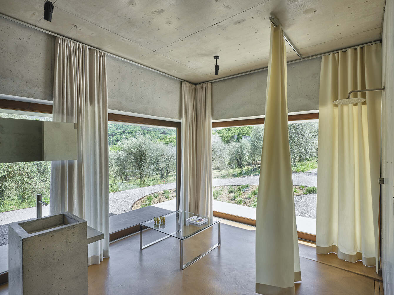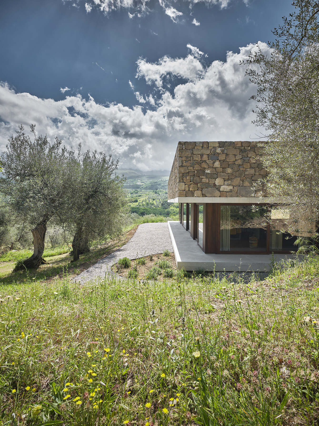 The table is the secular altar in the centre of the visible scene from every room in the house. The facility is a spatial continuum between the intimate hearth and the olive grove without blackout filtering elements except the light linen curtains. Outside the rigor of geometry is compact and cohesive in proportions and it honors the local country building tradition of “dry stone” walls on anthropized soil, whereas the wood infills recall the locking elements of the amiatini traditional rural buildings called “seccatoi” –dryers for chestnuts -. In this way, the building merges with the landscape and ties it profoundly into its own history.