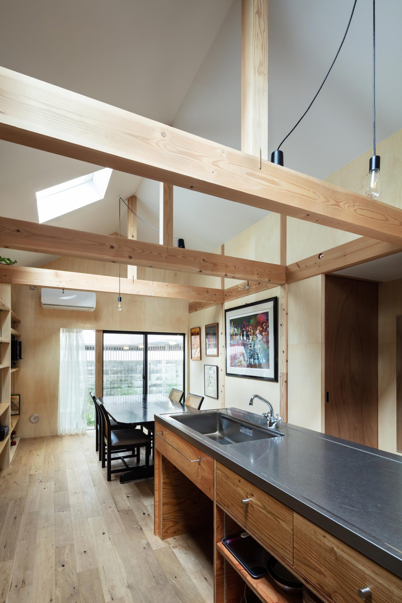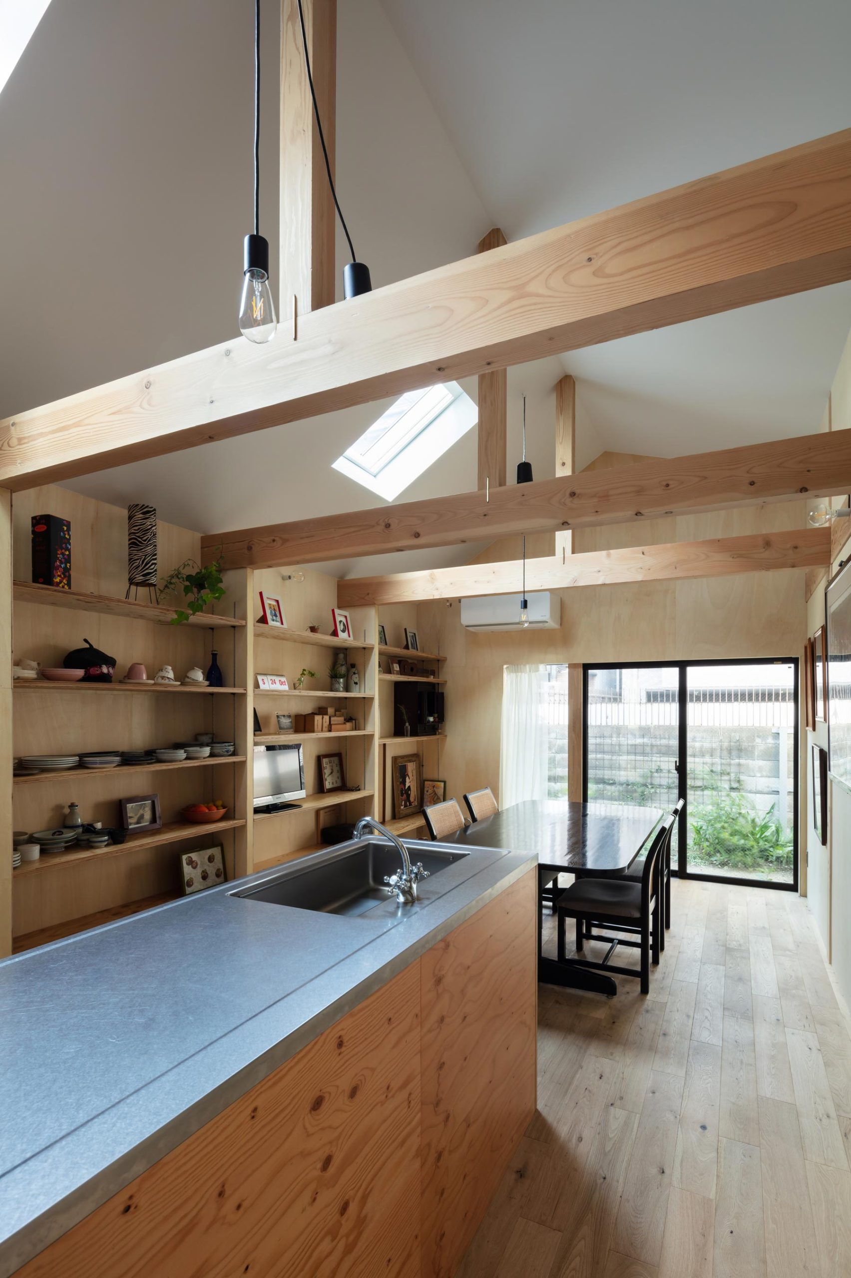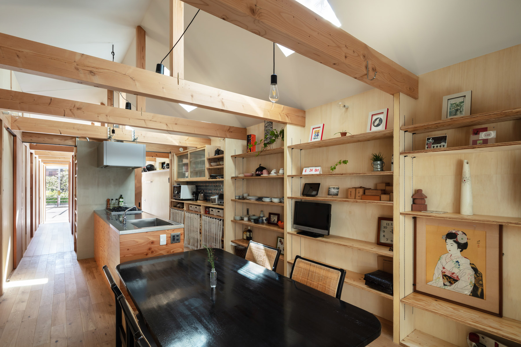 The elongated floor plan is divided into a public space on the east side and an office on the west side, each connected to the dining kitchen. The simple kitchen made of plywood is large enough to work with family and friends, and the dining area faces a small garden on the north side. The mother’s room is located close to the sanitary, and she can live a little distance from the couple. The new home for families, who have a good understanding of the lifestyle that suits them, has once again become a vitality building, like weeds sprout from asphalt crevices. In the middle of the city, a grounded dwelling may be more luxurious than a condominium.