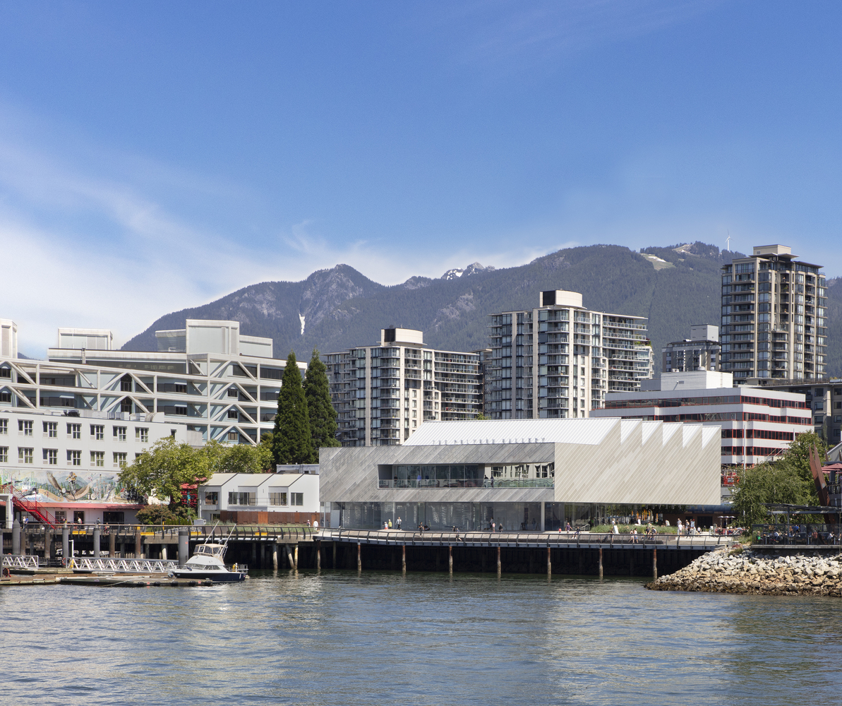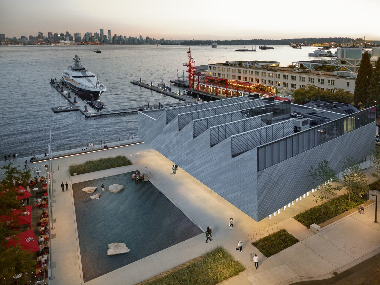 The main mass of the building is lifted from the ground plane to provide open access to both a new public plaza and a wide view of the Vancouver skyline across Burrard Inlet. Its iconic saw-toothed profile is clad in layers of mirrored stainless steel beneath expanded aluminum decking. The interplay between the two materials gives the singular mass an ephemeral depth that shifts with seasonal sunlight and evening atmosphere.