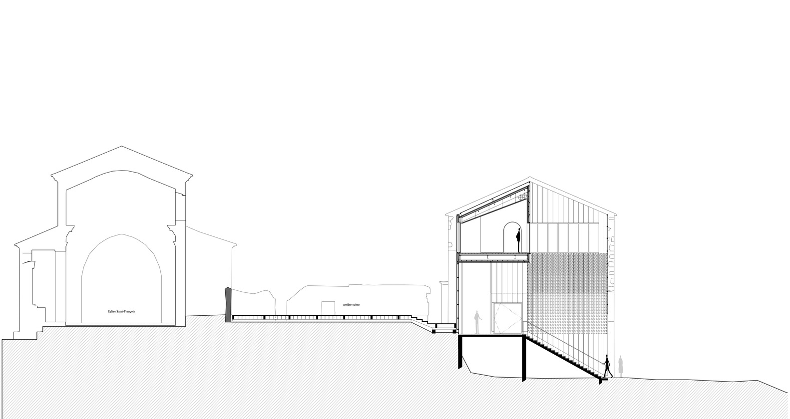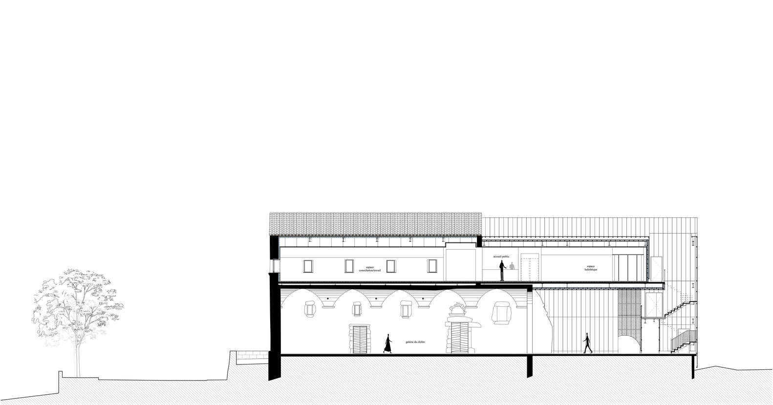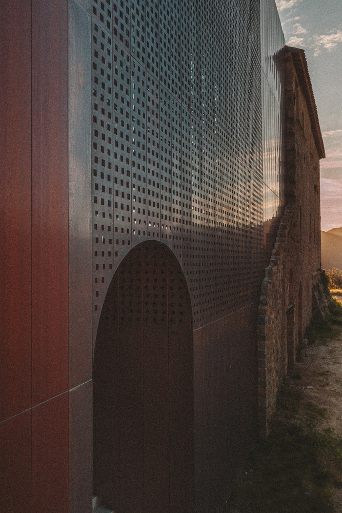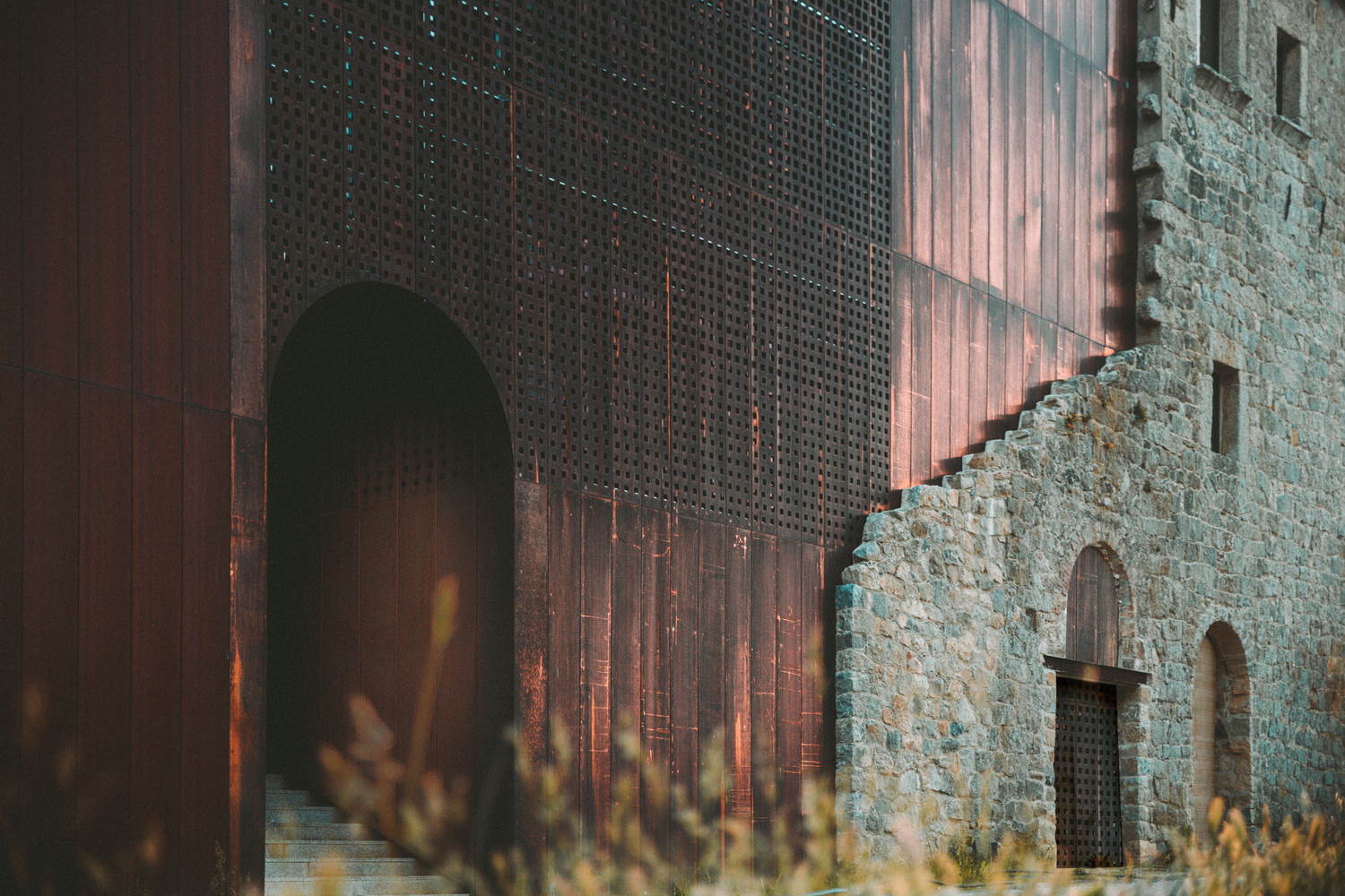Nature has grown inside the building, Siamese nature slipped between the stones and then transformed into plant armor that protects against erosion and collapse. A fig tree is included in the facade. The wood, the roots become structural replaced the lime. An essential component of the historic monument, we have honored this nature which will have long protected the dormant building before its resurrection. Amelia Tavella has chosen to keep the ruins and replace the torn part, the phantom part, in copper work which will become the House of the Territory.