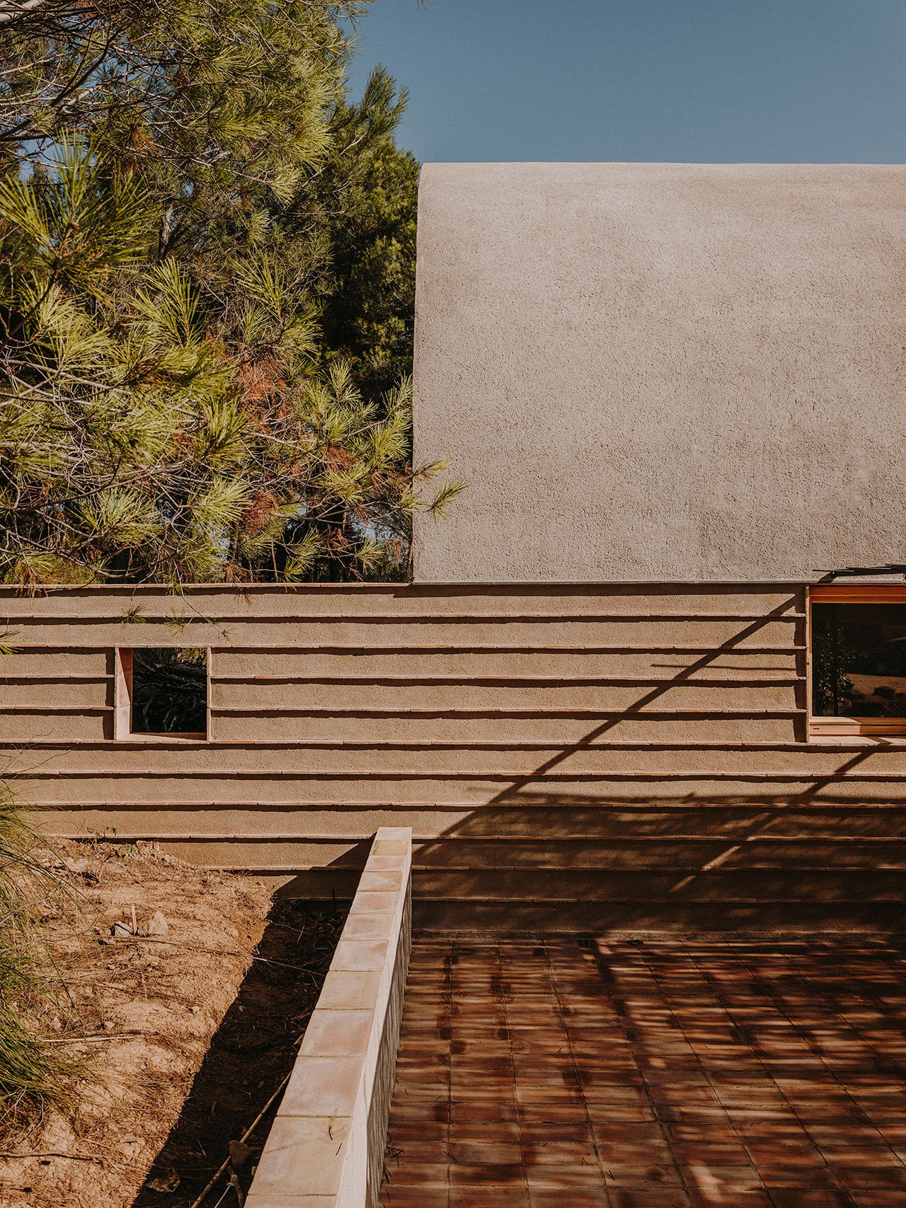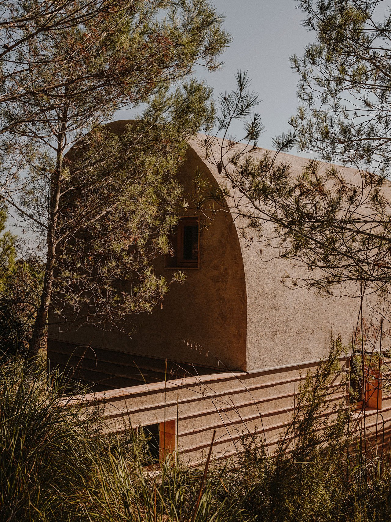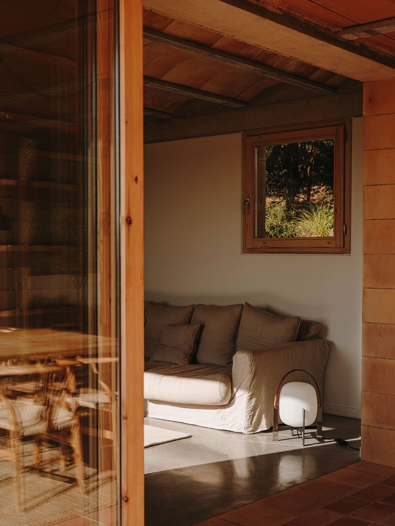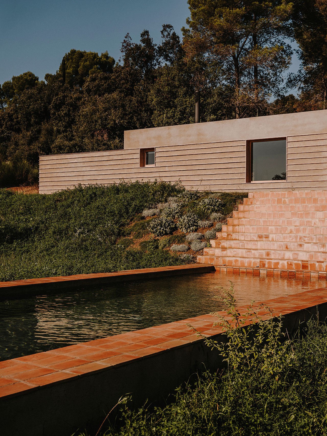 Aiming for a light footprint, the house is comprised of two low-slung rectangular volumes in an L-shaped configuration, one of which is topped by a Catalonian-style barrel vault. Constructed out of sandy-coloured concrete with ceramic insets forming horizontal streaks, the volume’s earthy tones and natural textures echo the surrounding landscape, harmoniously anchoring the house in its natural setting and imbuing the building with a sculptural sense of craftsmanship. Sourced from La Bisbal, one of the leading pottery centres in Catalonia, ceramic tiles have also been used to line the pool terrace which extends out to the fields, as well as the vaulted ceilings that dominate the interiors.