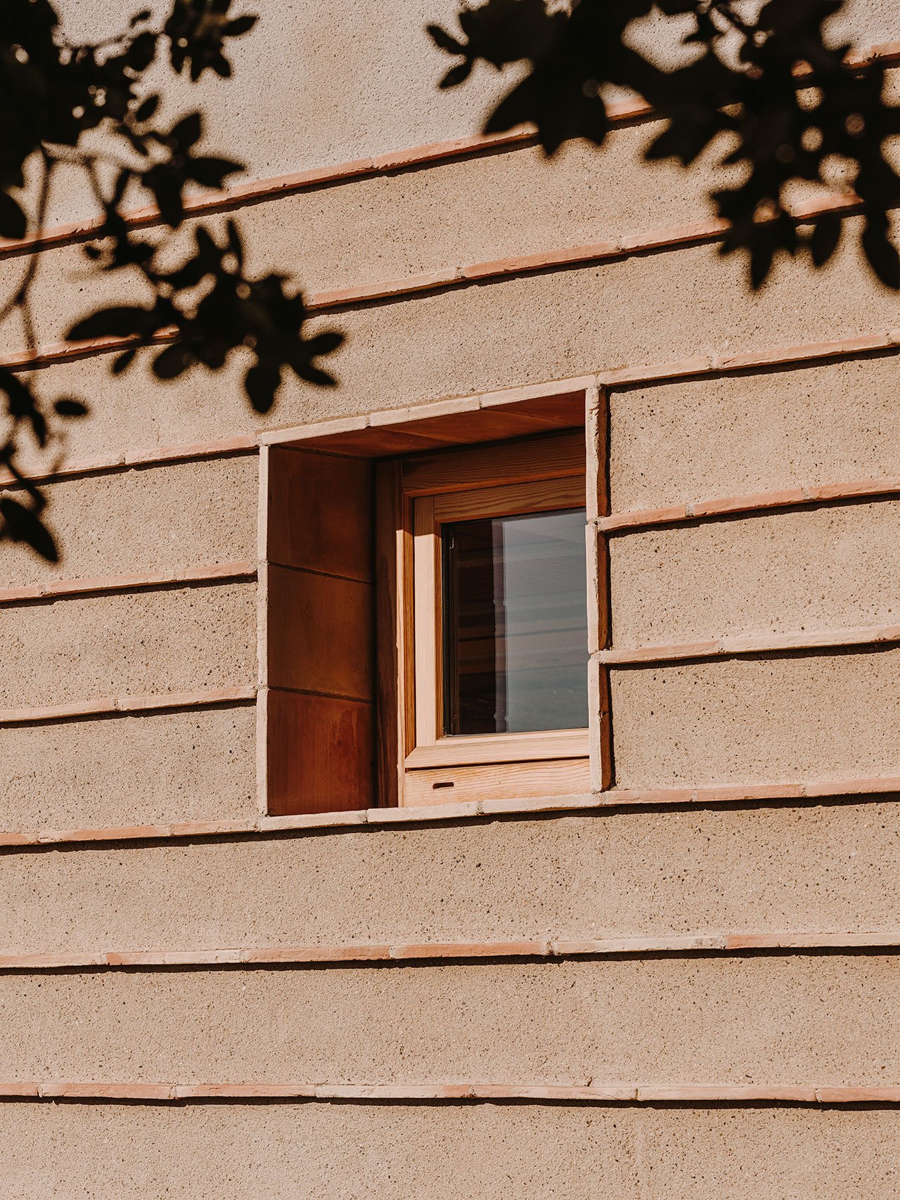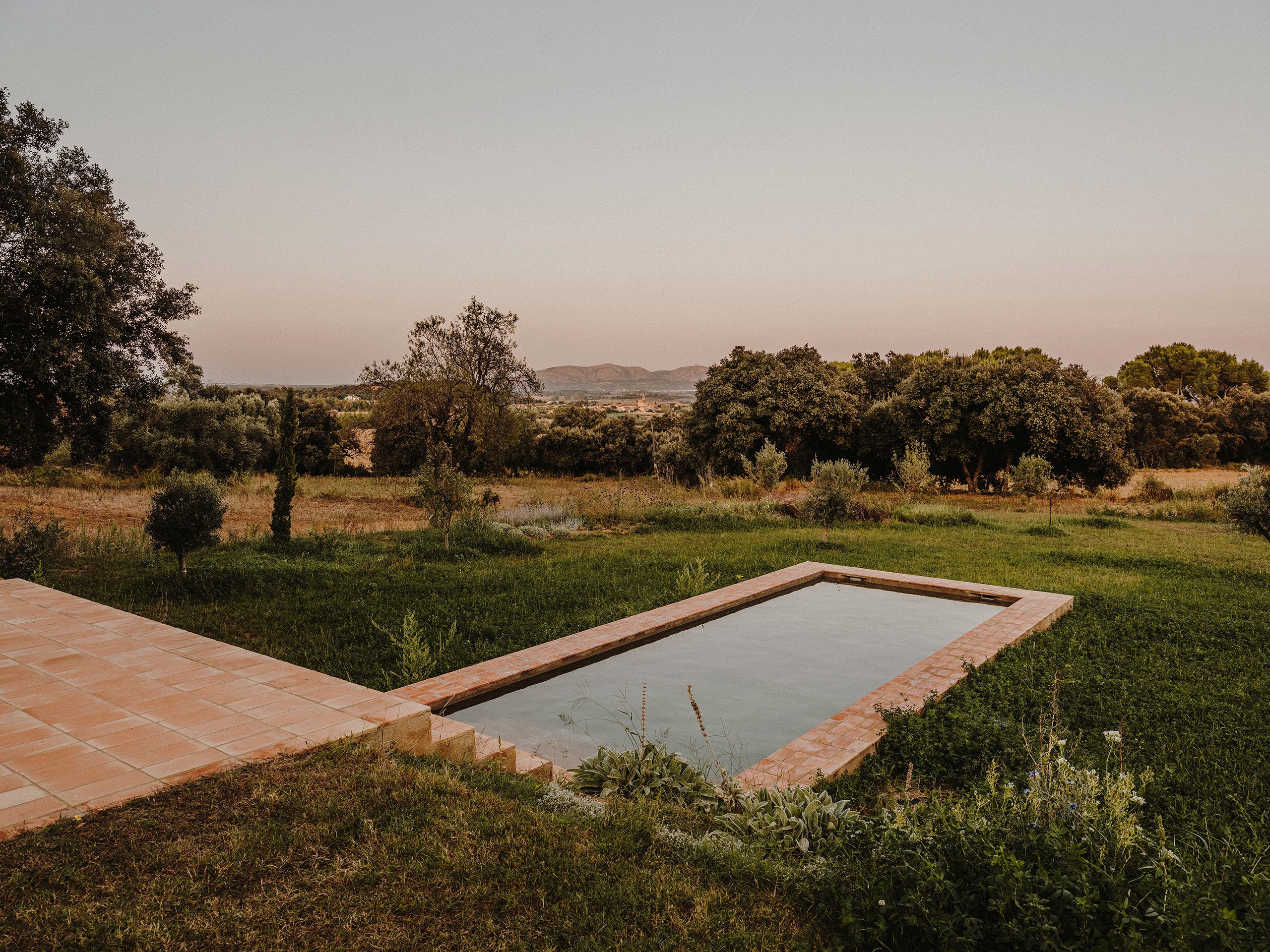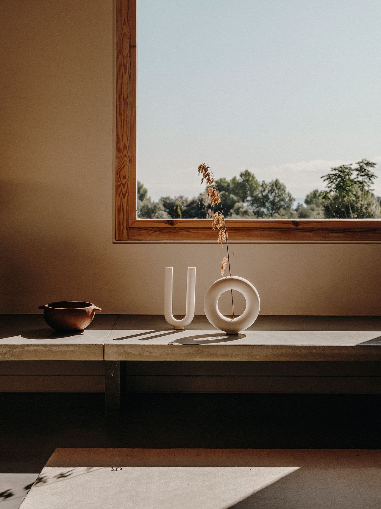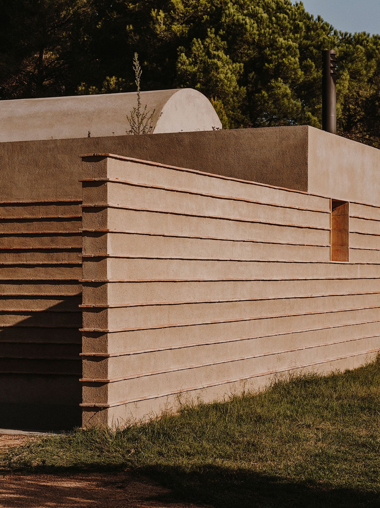 Aiming for a light footprint, the house is comprised of two low-slung rectangular volumes in an L-shaped configuration, one of which is topped by a Catalonian-style barrel vault. Constructed out of sandy-coloured concrete with ceramic insets forming horizontal streaks, the volume’s earthy tones and natural textures echo the surrounding landscape, harmoniously anchoring the house in its natural setting and imbuing the building with a sculptural sense of craftsmanship. Sourced from La Bisbal, one of the leading pottery centres in Catalonia, ceramic tiles have also been used to line the pool terrace which extends out to the fields, as well as the vaulted ceilings that dominate the interiors.