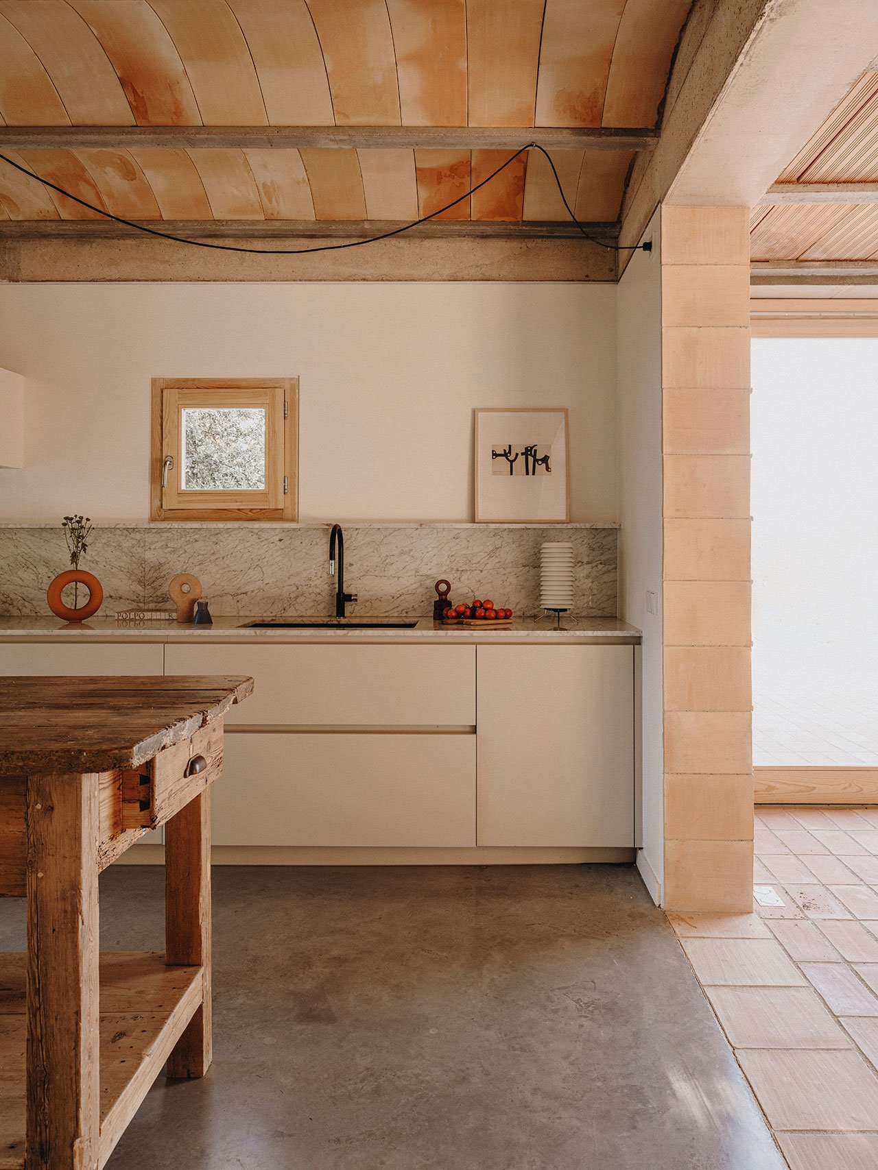MESURA’s vernacular-inflected approach to Casa Ter’s design can also be seen in the pared down interiors where white walls and concrete floors are combined with Catalan vaults, a local traditional ceiling style of smooth low ceiling arches. Handcrafted wooden furniture, stone elements, and natural-toned soft furnishings further add to the interior design’s tactile richness while imbuing the austere aesthetic with warmth.
