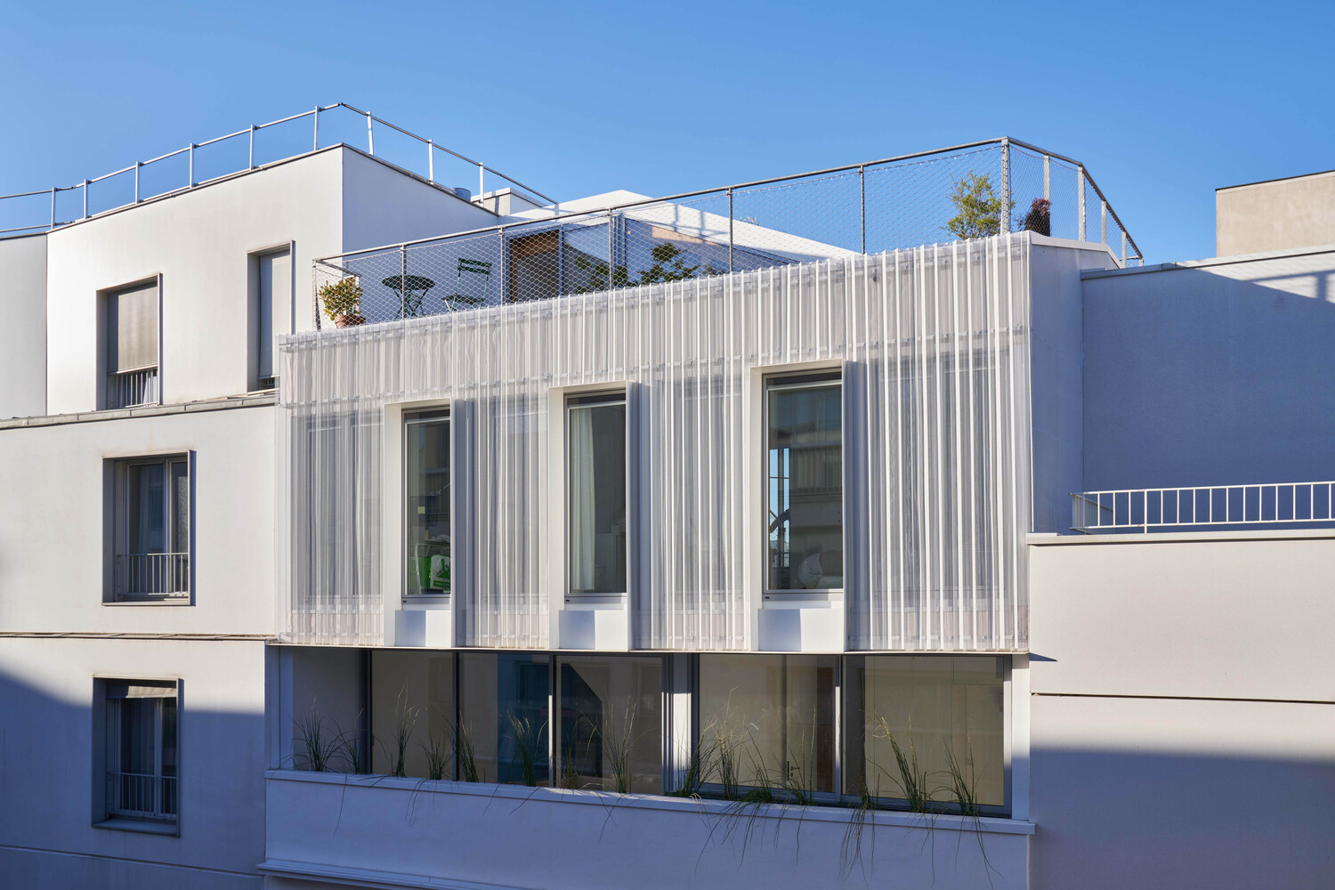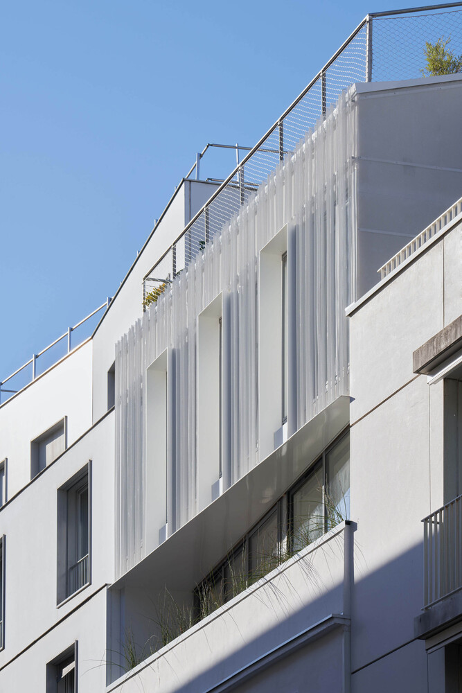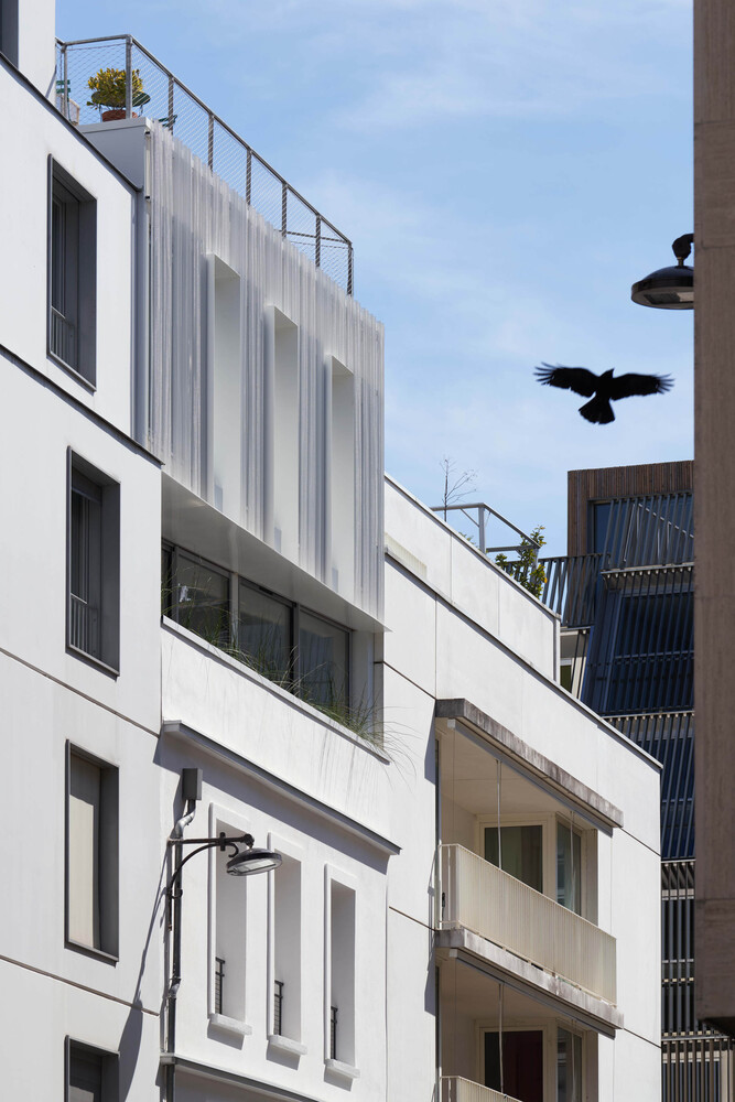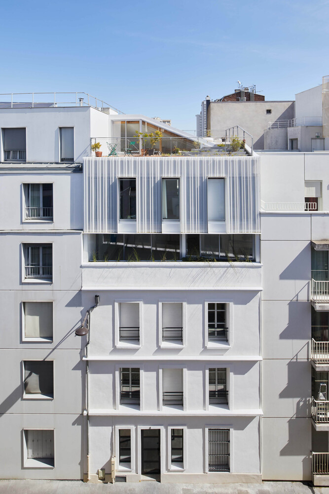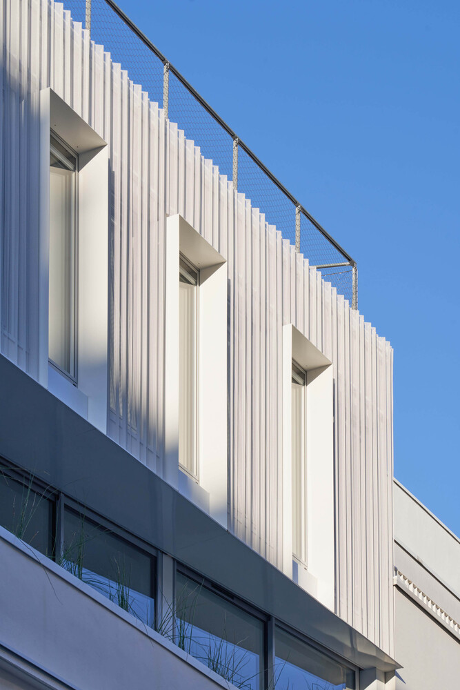 By its volume, the elevation harmonizes smoothly with the lower levels of the building. It embellishes the existing and reinforces the idea of permanence in evolution. Highlighted on the street front by the retreat of the 3rd floor into which sliding balcony slips, it reinterprets with the 4th floor, the Parisian roof, and its brisis. Coming to dress the glass facades, a double skin of perforated and ribbed sheet steel is interrupted to the right of the frames of three bays to evoke in a contemporary way, the theme of the skylight. The perception of this subtle double skin, light and pleated veil, varies according to the time, the moment. This stylish device filters both light and sights.