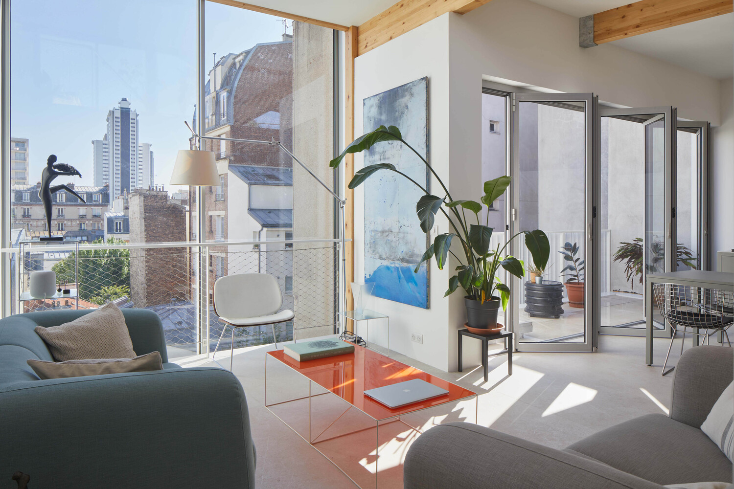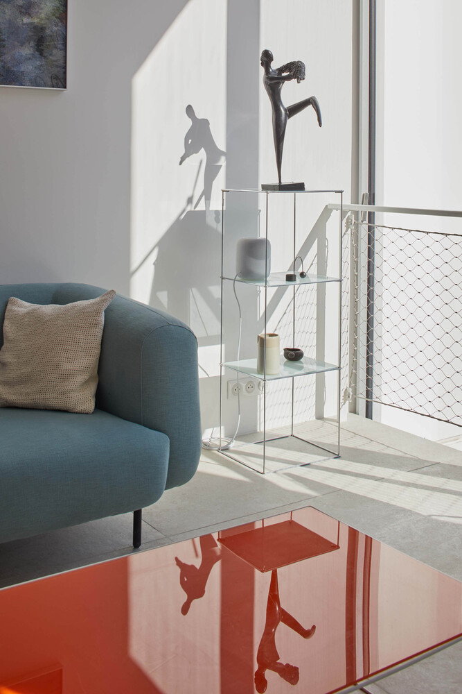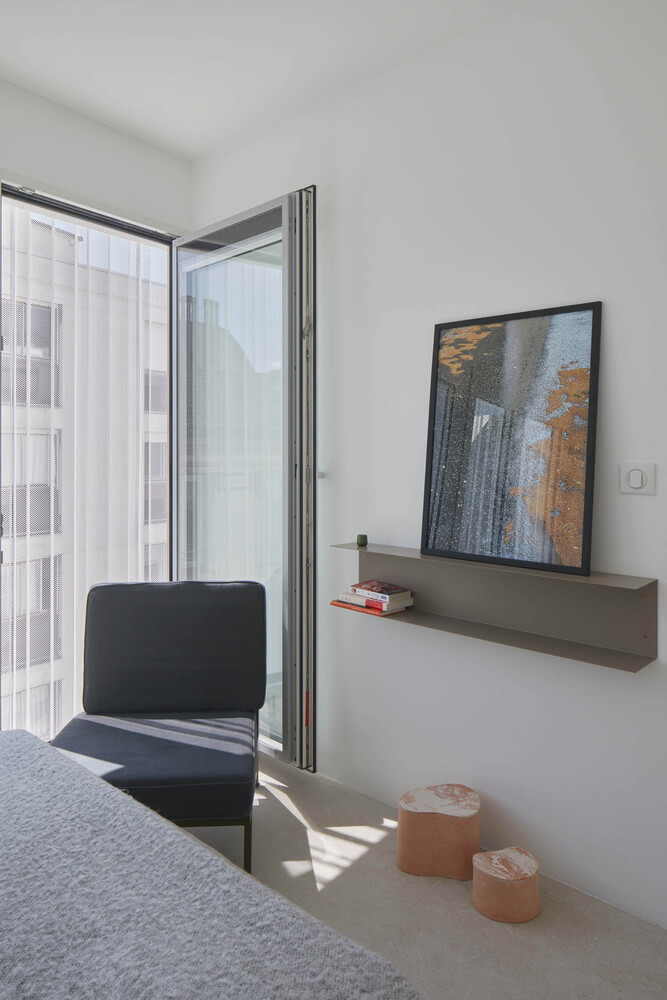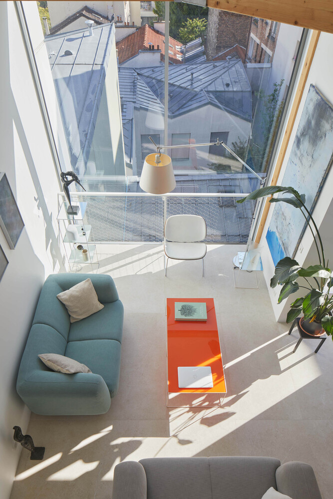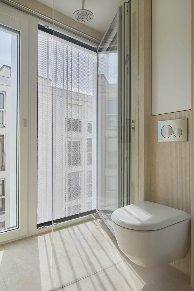By its volume, the elevation harmonizes smoothly with the lower levels of the building. It embellishes the existing and reinforces the idea of permanence in evolution. Highlighted on the street front by the retreat of the 3rd floor into which sliding balcony slips, it reinterprets with the 4th floor, the Parisian roof, and its brisis. Coming to dress the glass facades, a double skin of perforated and ribbed sheet steel is interrupted to the right of the frames of three bays to evoke in a contemporary way, the theme of the skylight. The perception of this subtle double skin, light and pleated veil, varies according to the time, the moment. This stylish device filters both light and sights.
