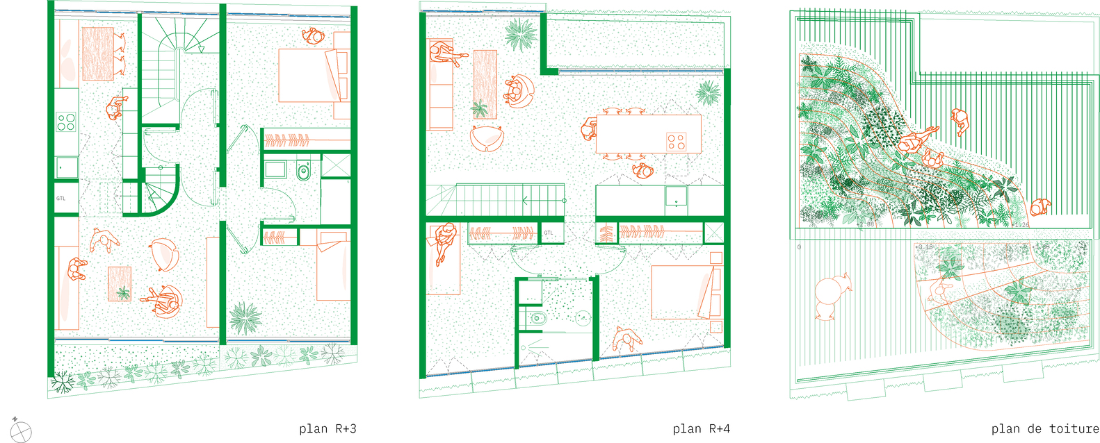 The agency was questioned in 2017 on the possibility of raising a two-storey building located in rue de l’Harmonie. The project is located between two social housing buildings of five and six floors. Built at the end of the 19th century, the existing building was restructured in 1997 with is in good structural condition. The administrative and technical feasibility leads the architects to offer their client an elevation made up of two levels (each of around 60m2) with one accommodation per level. The accommodation on the 4th floor has terraces and a roof with a green hill and the 3rd floor has a planted balcony.
