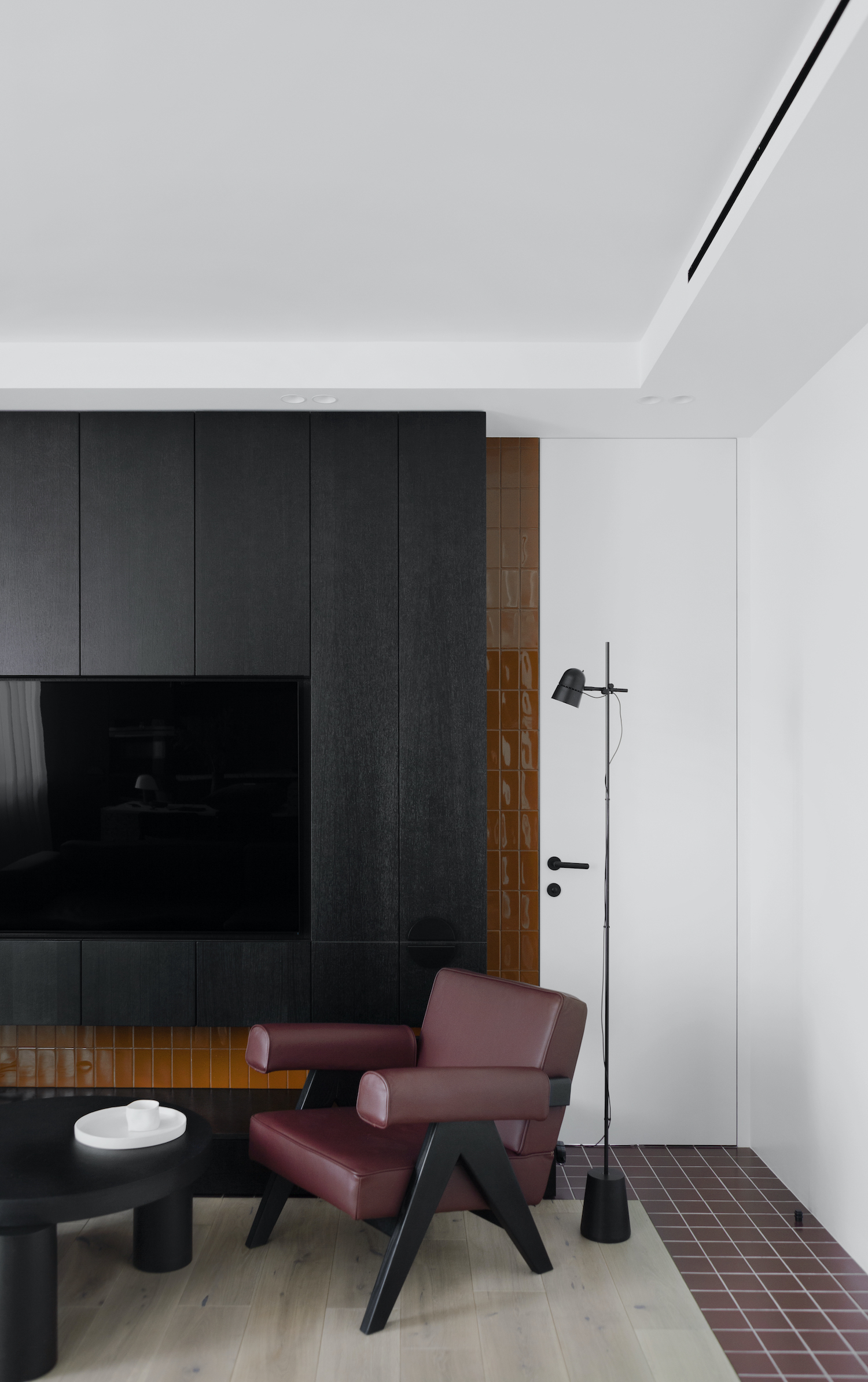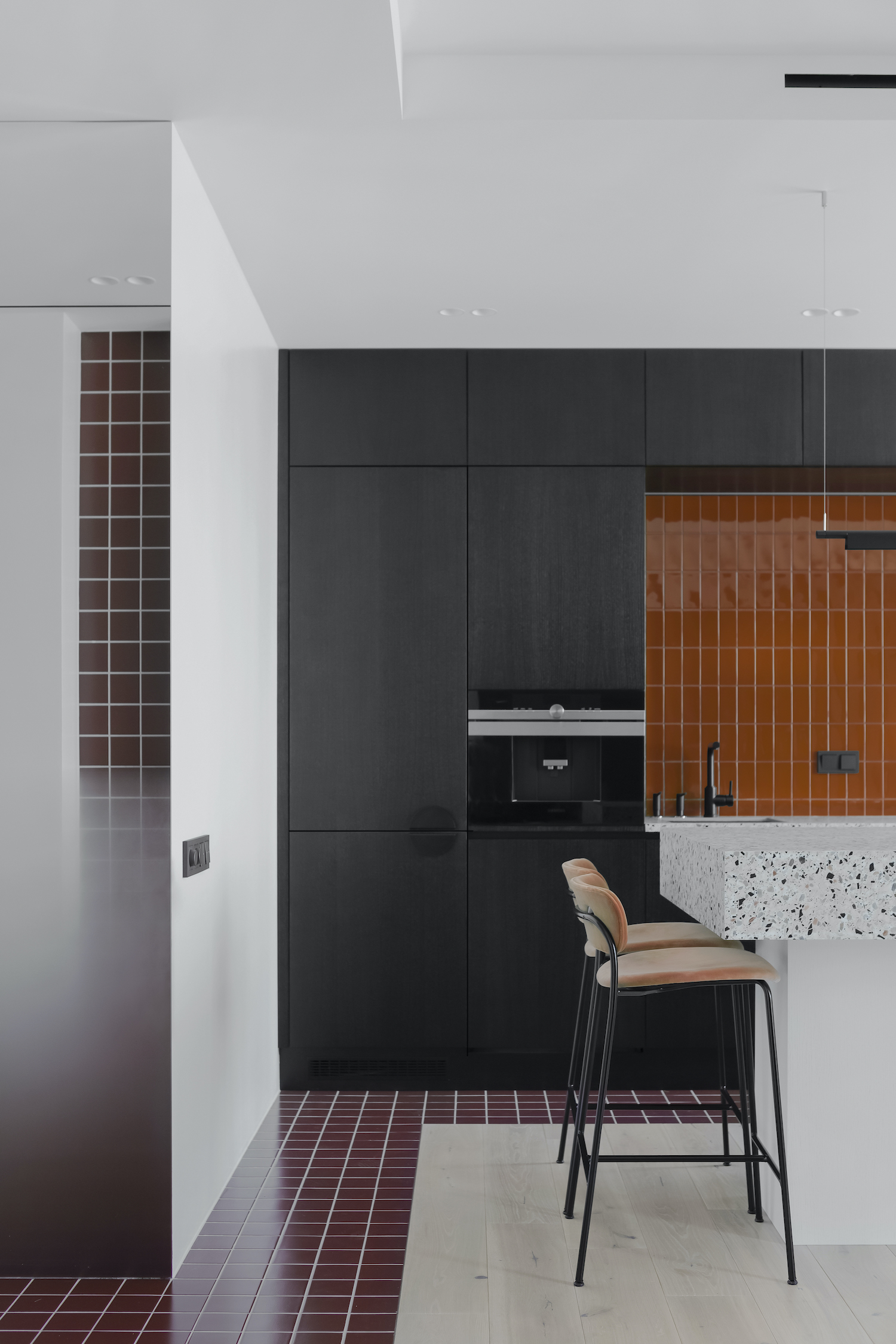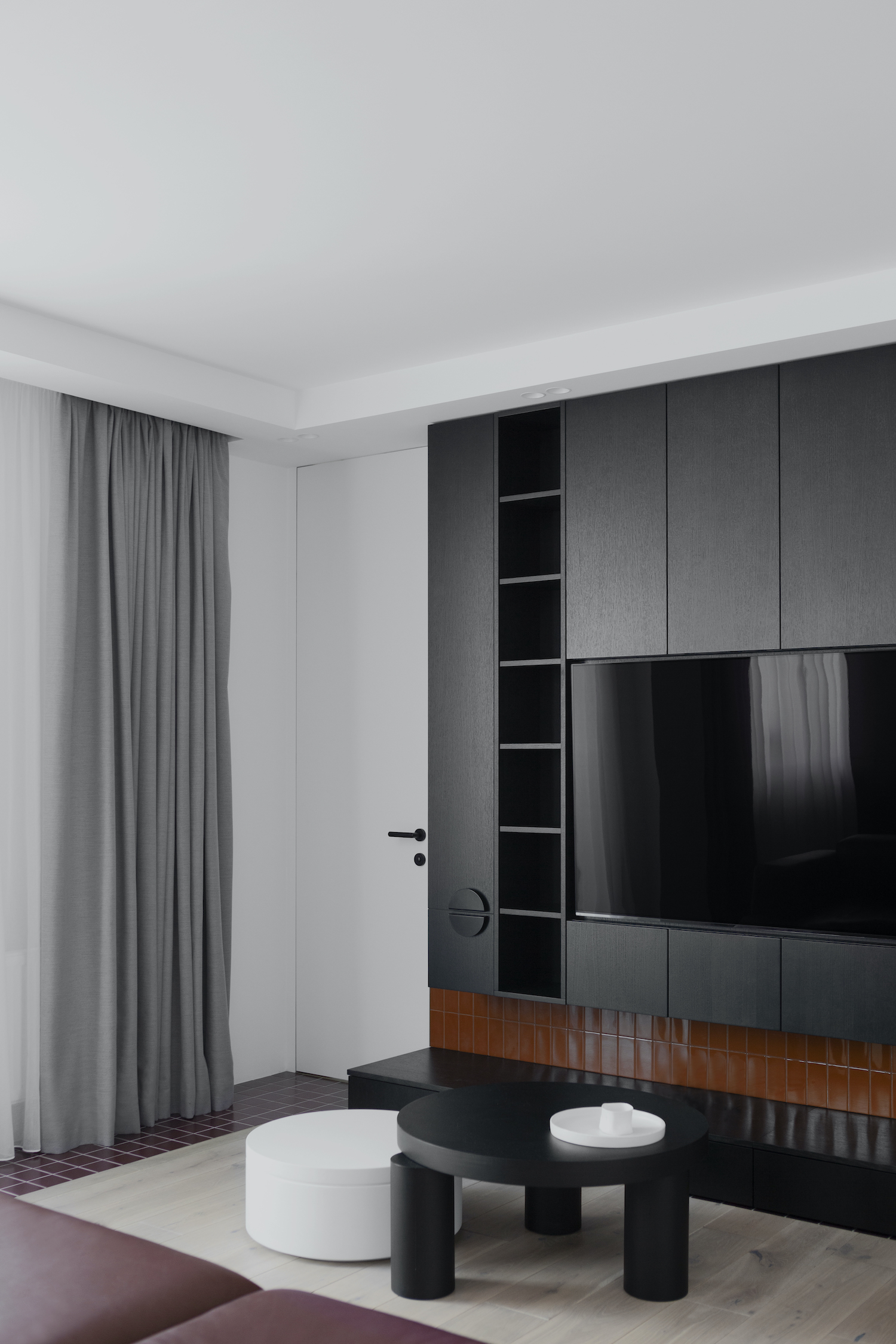 NB11 is a minimal apartment located in Minsk, Belarus, designed by ZROBIM architects. While working on the project, the task was to create not just a functional interior, which is always very important for architects but also to work on the mood and create a unique image –lively and photogenic. The apartment is a mix of architectural elements, clean lines, and composition, which are superimposed on a unique solution in terms of materials and color palette. Together, these techniques create the mood and achieve the desired balance between function and form. When creating the layout of the kitchen – living room – the most important room in which the family will spend the most time, they were guided by the principle of symmetry and linear repetition of space.