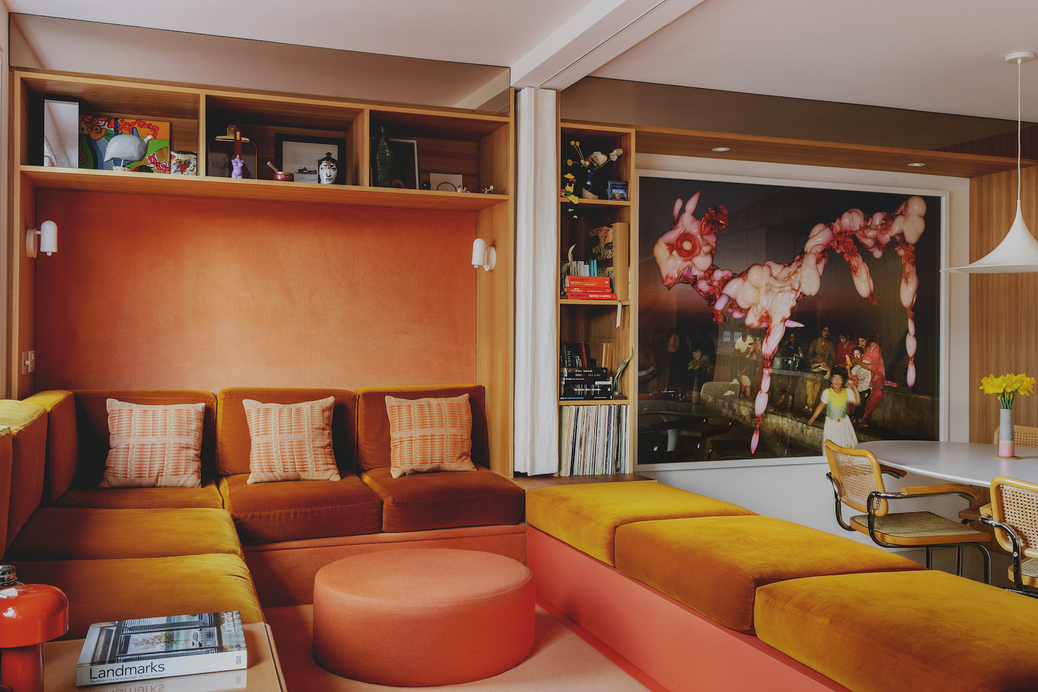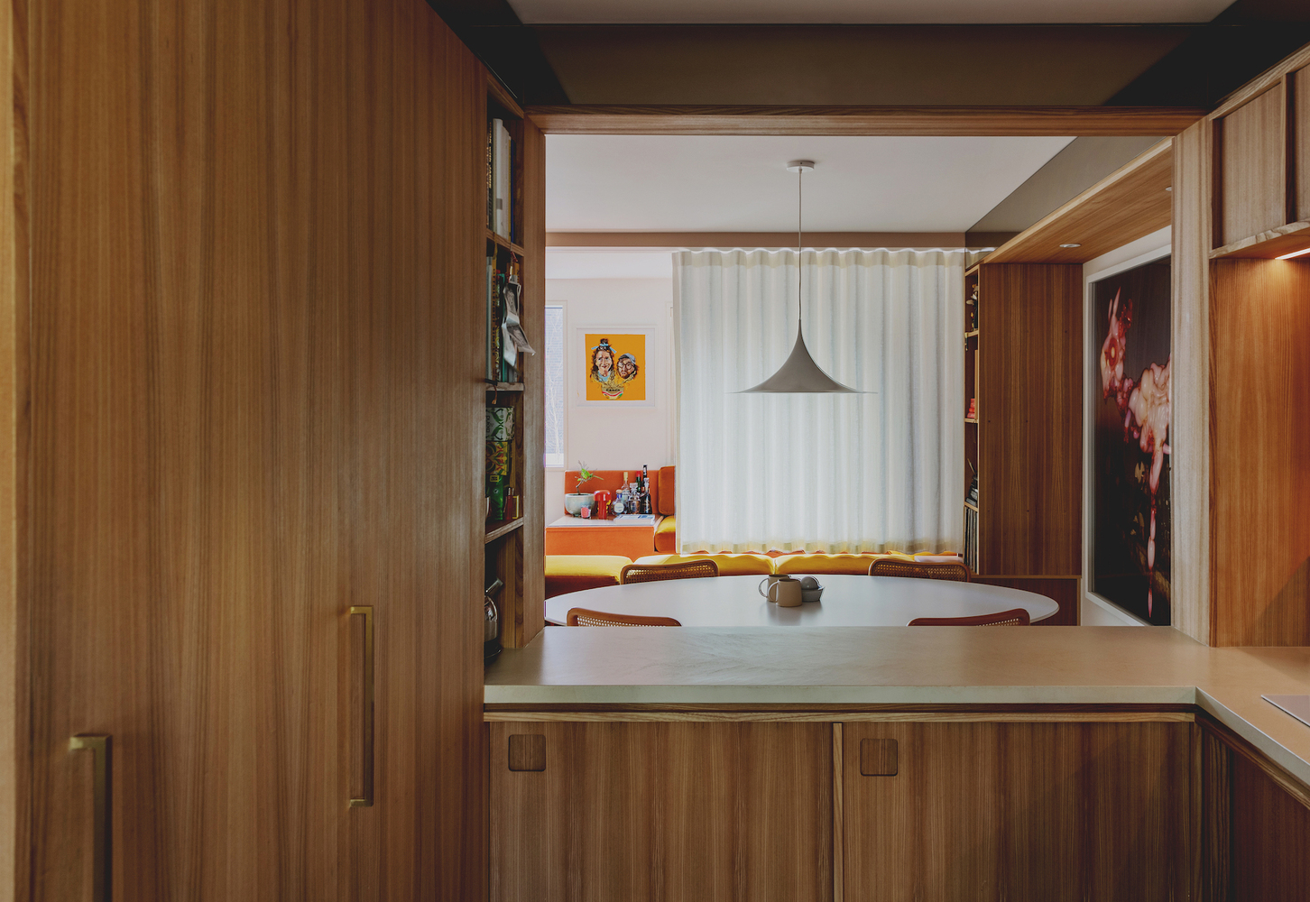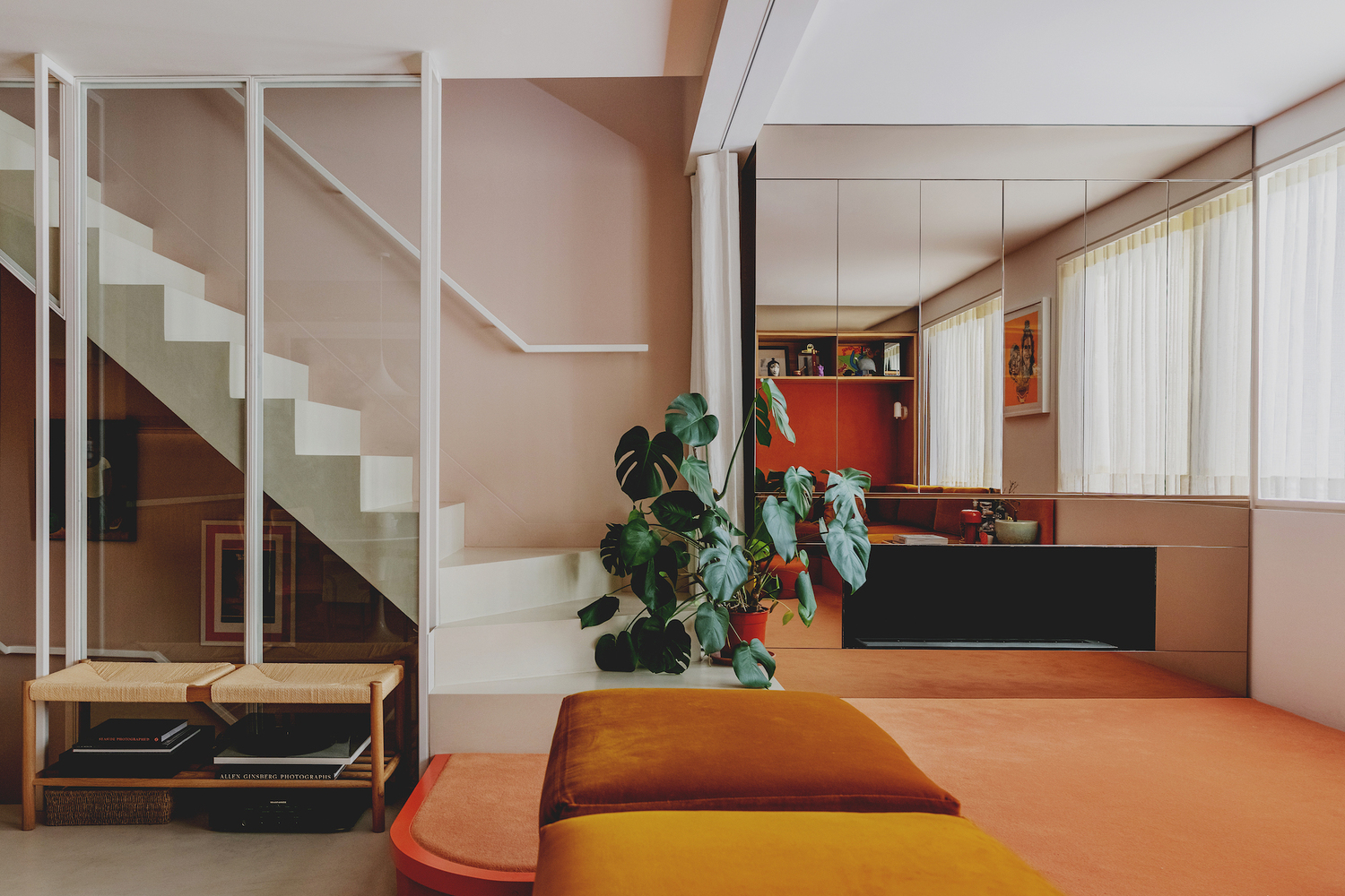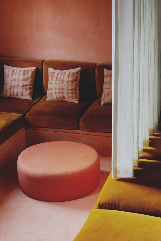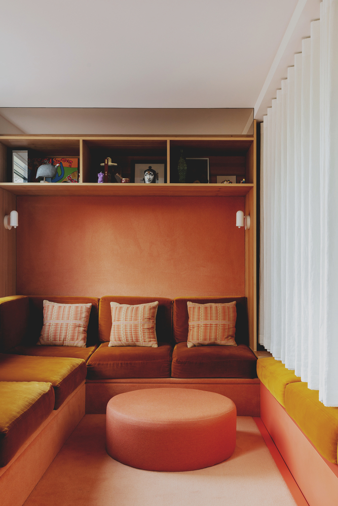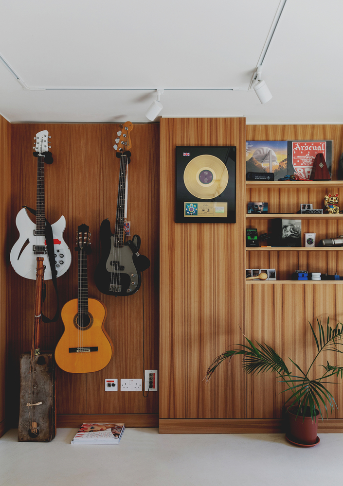 One of the core design interventions was reconfiguring the original stair on the ground floor by creating a level change to unlock a large section of the lounge area. This seemingly simple design idea allowed Studio Hagen Hall to create an elevated conversation platform and snug - fitted with bespoke velvet sofa with hidden storage - that could be connected and removed from the dining space by heavy linen curtains drawn from custom elm recesses. On the lower ground floor, Studio Hagen Hall inserted a professional-grade recording studio and writing room, one of the most challenging spaces to design due to its need to be structurally separate from the rest of the house to achieve acoustic isolation.