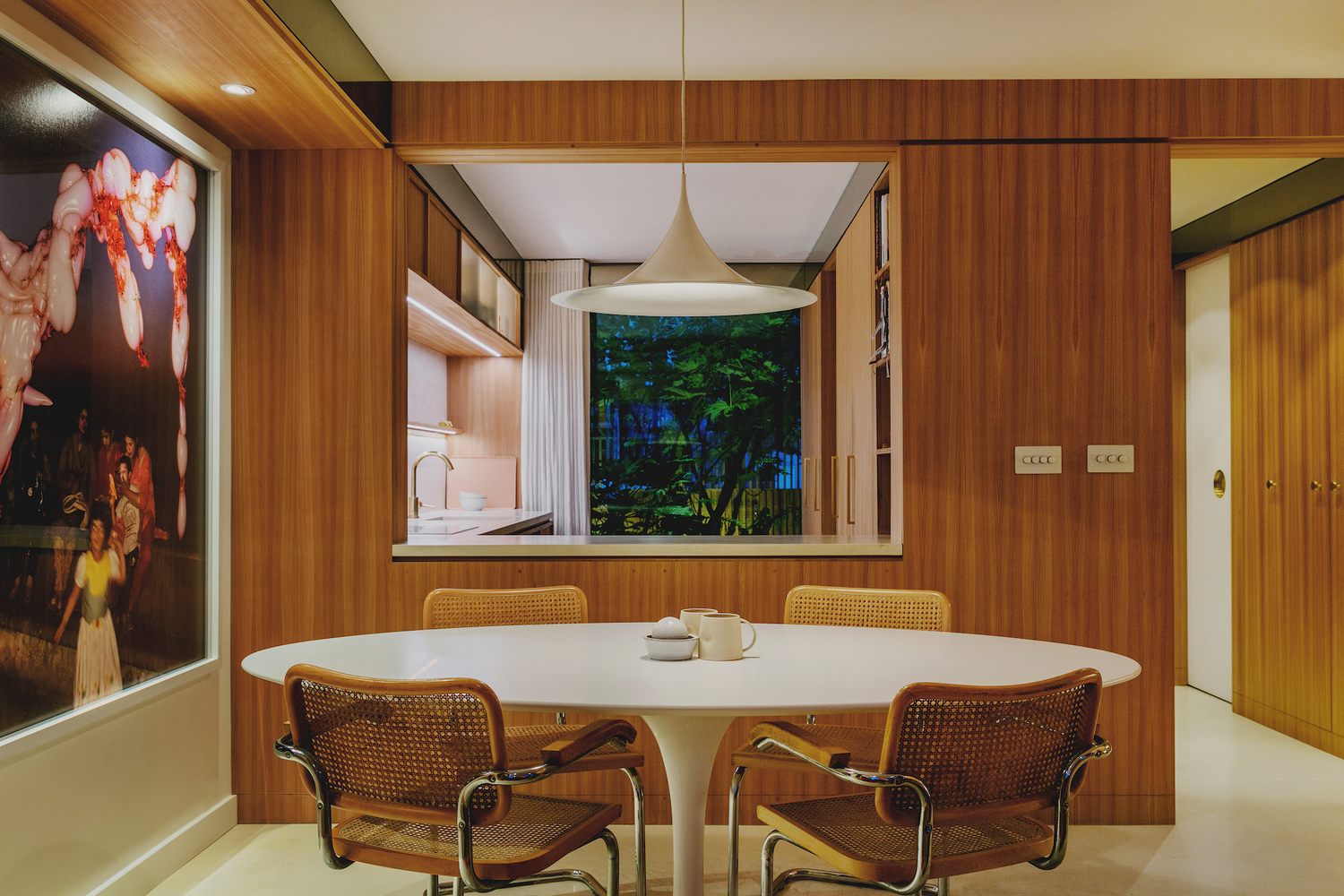 The studio sits as its own room within the lower ground floor, fitted with custom-made acoustically insulated doors and windows, and with a separate ventilation system so recording can take place in the soundproof space with access to fresh air. Studio Hagen Hall carefully selected a combination of materials and textures to create a modern yet Modernist balance. The brass unlacquered hardware will patina beautifully alongside the original vintage mid-century lighting and furniture. The richly textured and warm-toned carpet and upholstery in the lounge creates a cosy, luxurious feel while the brown smoked mirror architraves and cork bathroom flooring and bath façade all nod to the 1970’s style.