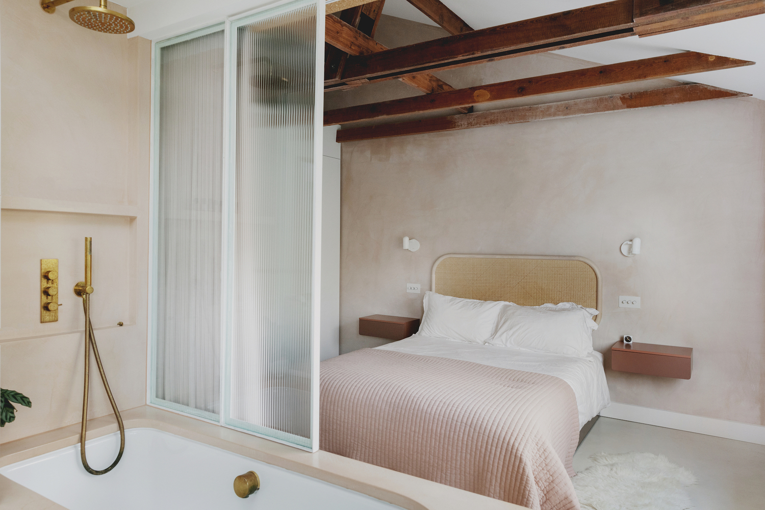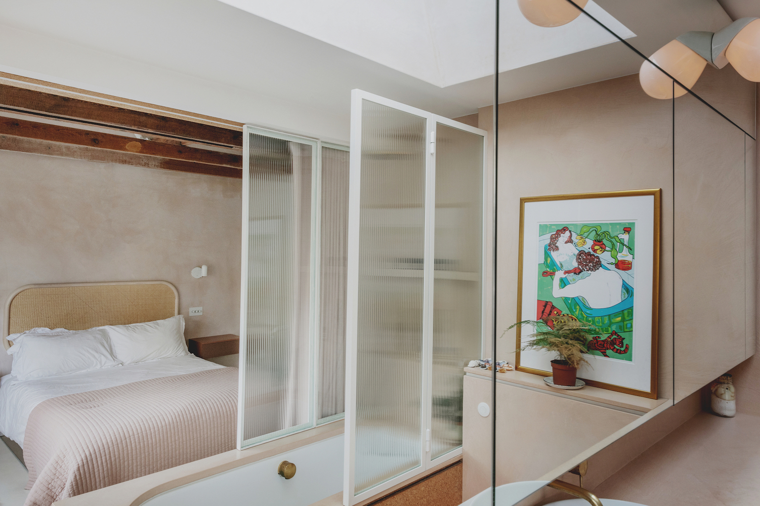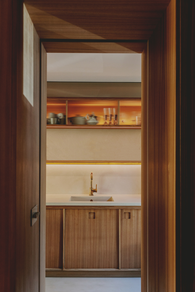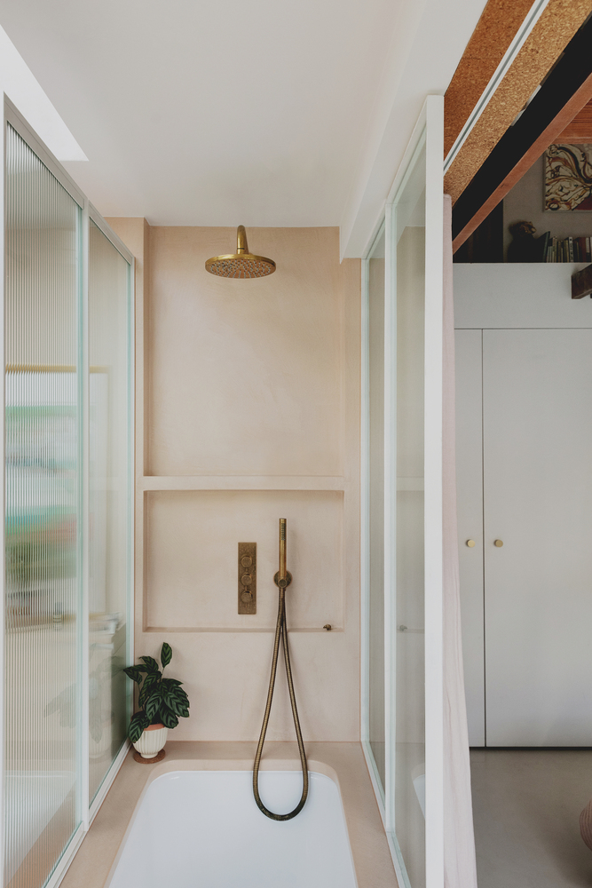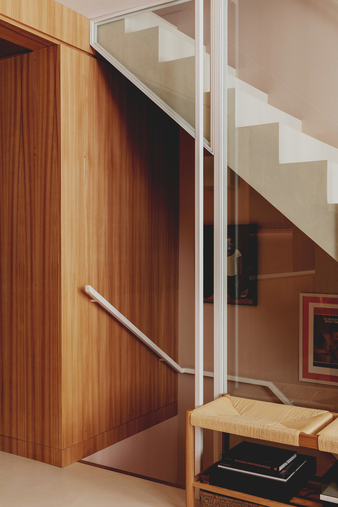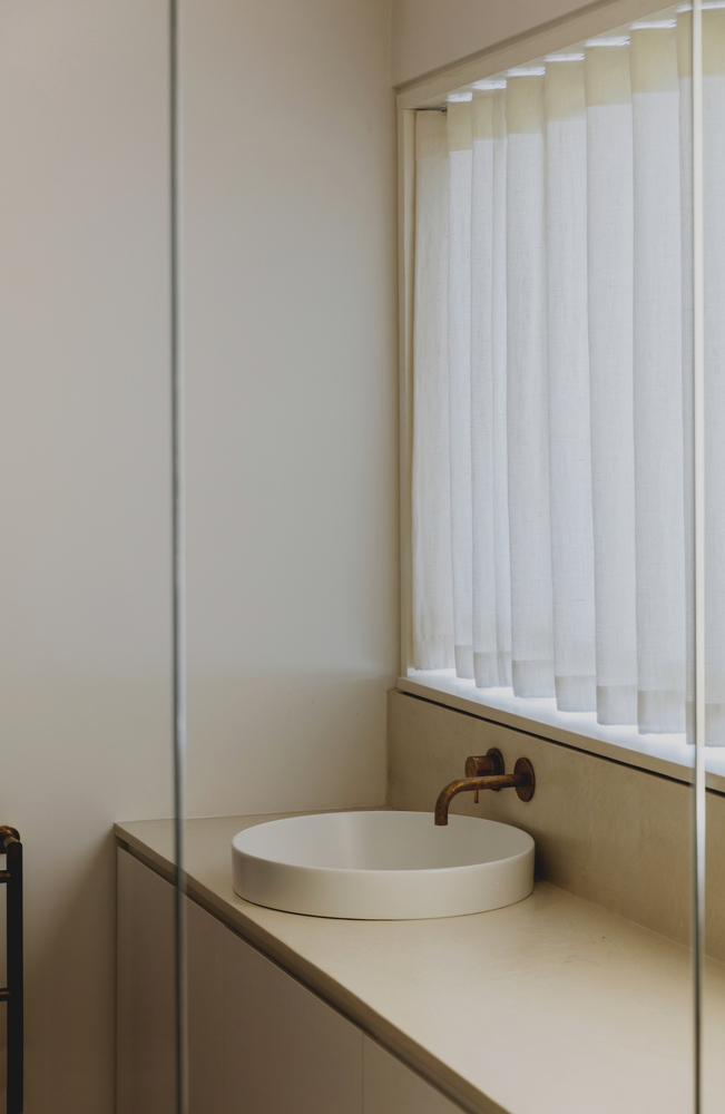 The steel and glass balustrade maintains a modern open-plan feel and seamlessly connects upstairs and downstairs. Consistency and continuity help create the sense of flow, with micro cement used for the flooring, worktops, sinks, and baths. The bespoke elm kitchen looks and feels like a room within a room. The beauty in the craftsmanship comes through in the tactility of the cabinetry, fluted glass, and brass hardware. It was designed by Studio Hagen Hall and built by joiner Tim Gaudin, who will soon be launching their new bespoke kitchen company, Bysse, together. A built-in window seat gives the clients views out onto the established garden and back through the living area.