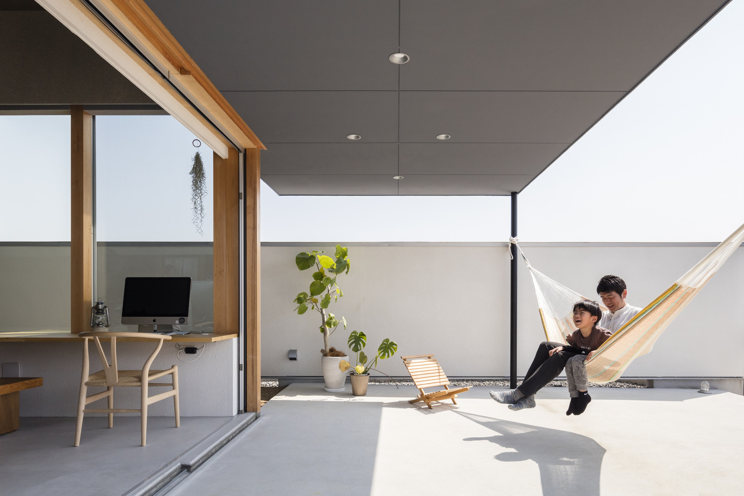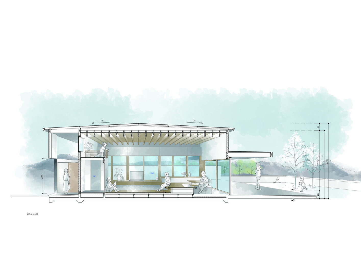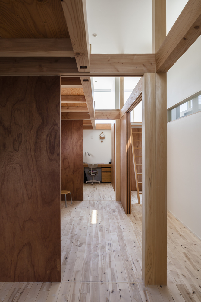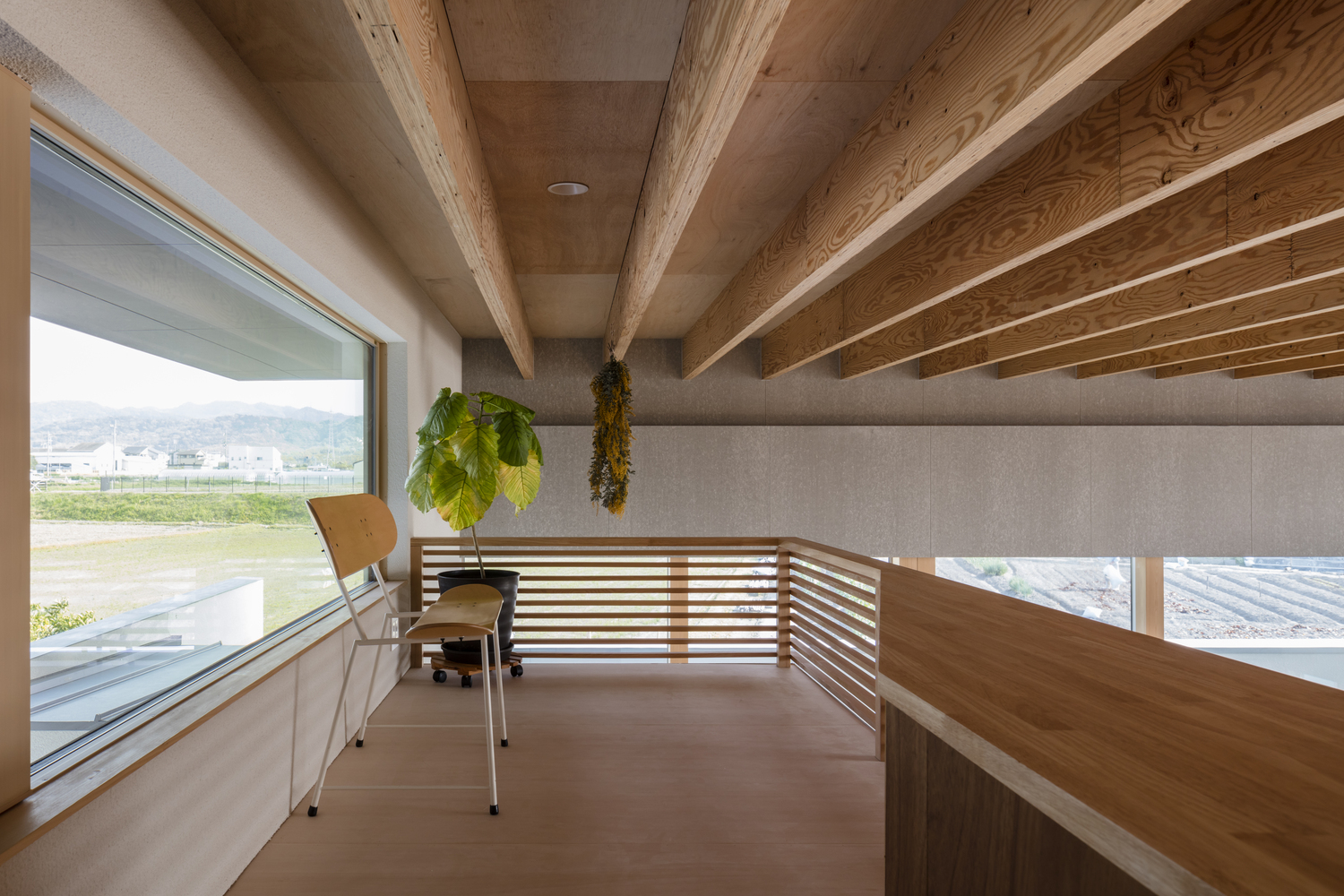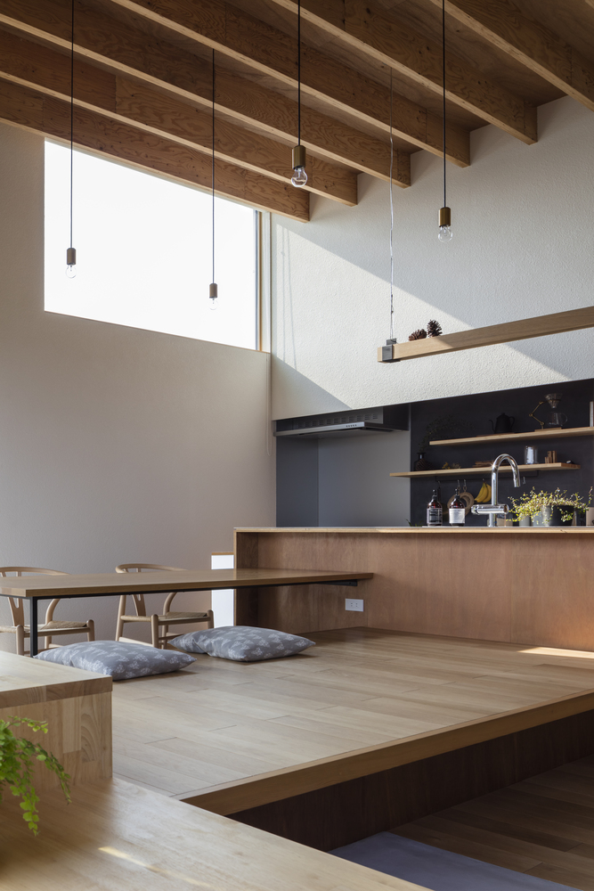 The horizontal roof extends to cover the whole house, inside and out. The maximum height of the floor, calculated from the slenderness ratio according to the specifications, ensures an air volume of 1.5 layers. The roof structure is made of LVL material, which is used for the roof structure.