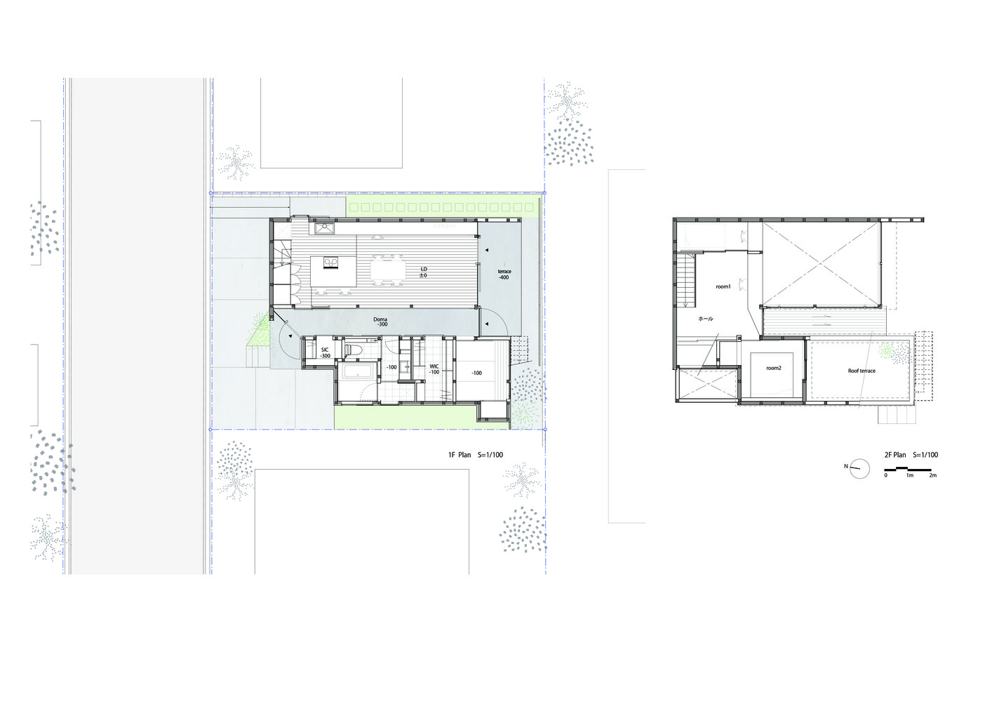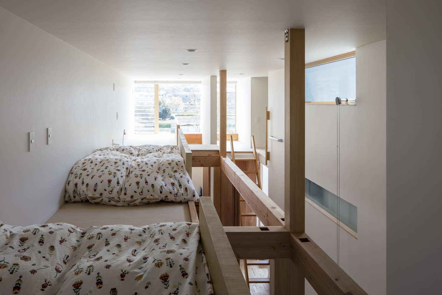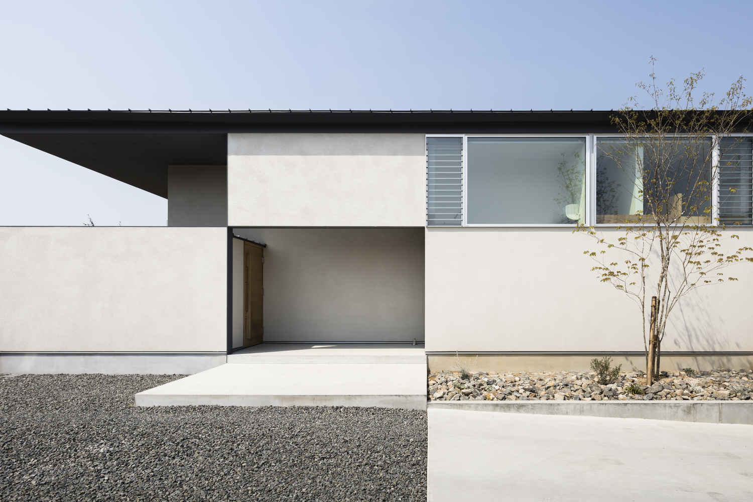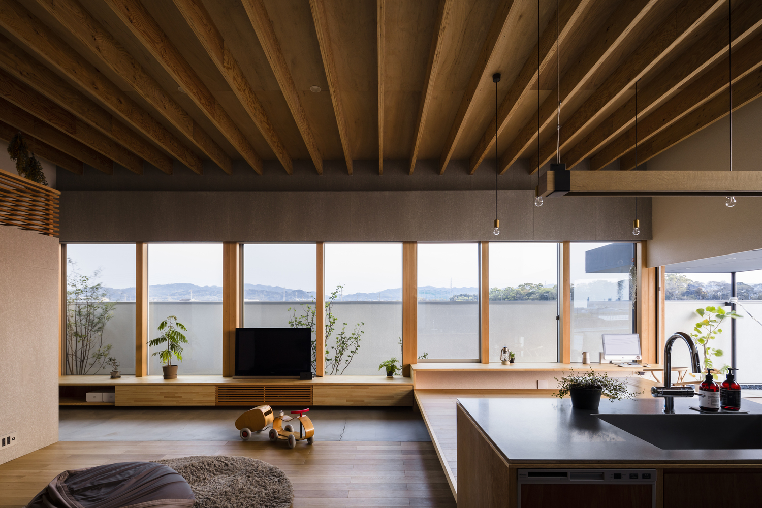 The horizontal roof extends to cover the whole house, inside and out. The maximum height of the floor, calculated from the slenderness ratio according to the specifications, ensures an air volume of 1.5 layers. The roof structure is made of LVL material, which is used for the roof structure.