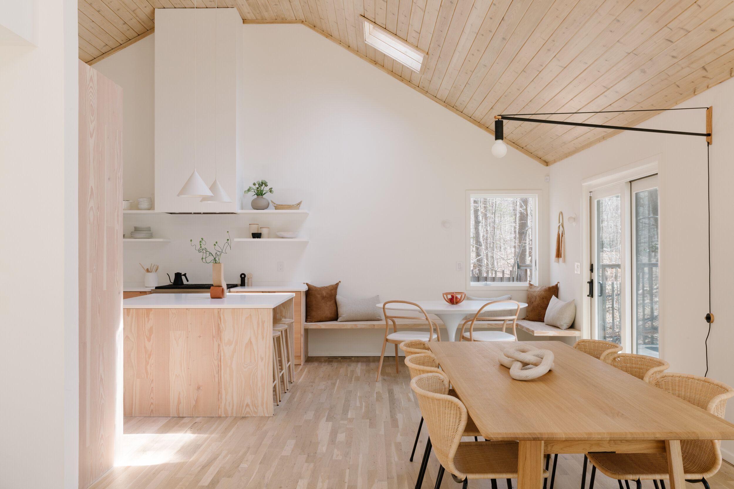 Amagansett Summer Home is a minimalist house located in Amagansett, New York, designed by Studiofauve. The main living area features a open layout with kitchens by Reform adjacent to a custom built-in breakfast nook. Light and warm materials, specifically Douglas Fir, create a warm and airy atmosphere. Classic Scandinavian and Japanese furniture adorn the interiors with a cosy yet sophisticated temperament.