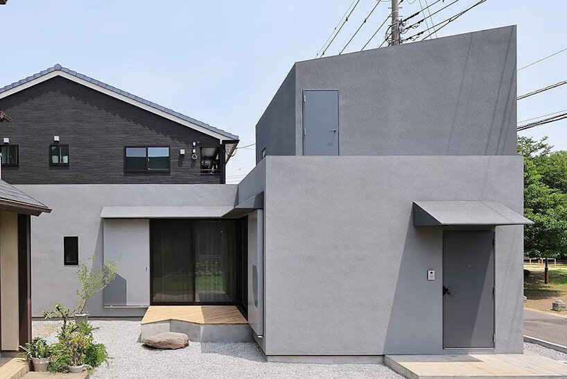 YSLA architects designed the new house around the tatami room — a kids room on the ground floor of the grandparents’ house — creating an outdoor space in between the two houses. this open area serves as a place for the families to meet and interact while keeping independence and privacy.