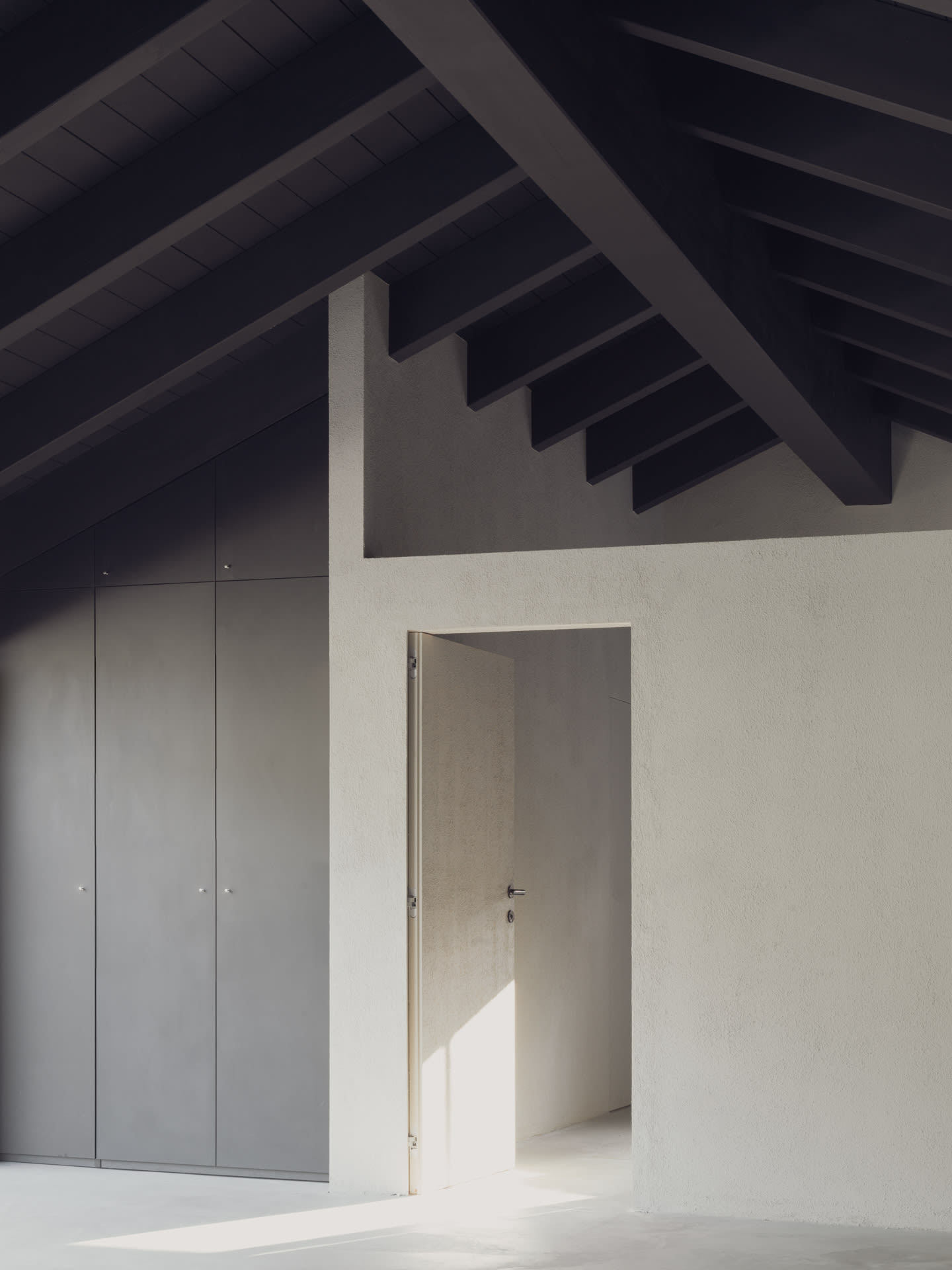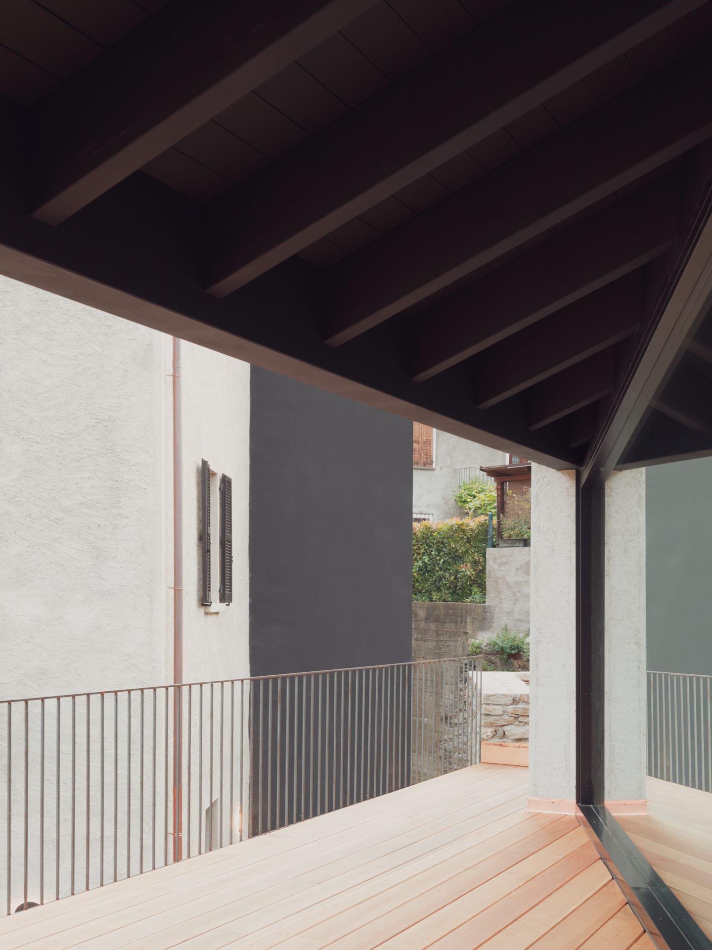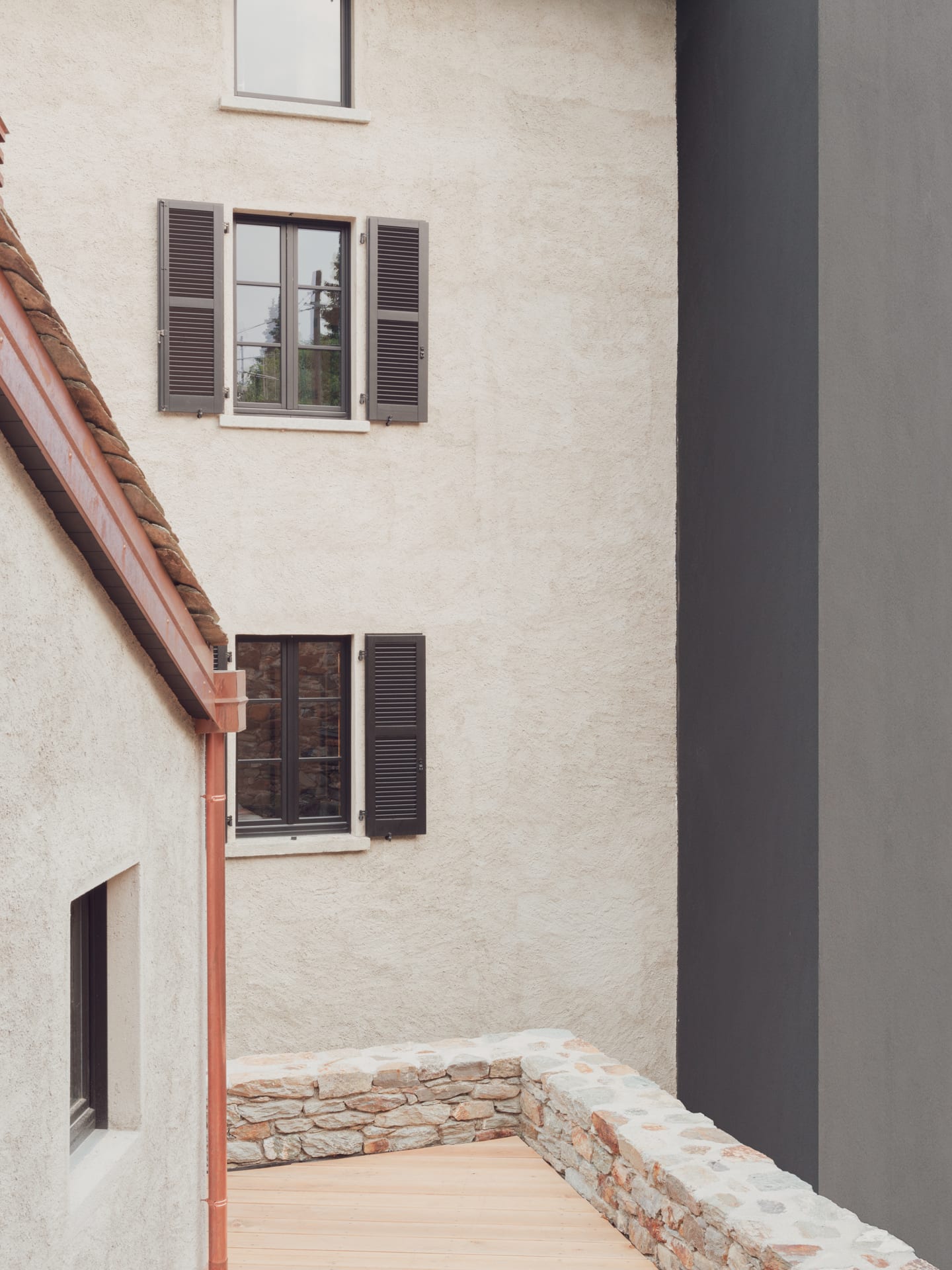 The design form partly follows that of the ruin, redefining the perimeter to better adapt the volume to the spatial and structural needs. On the upper level, the two volumes develop above the underground garage and are connected by the same gable roof. This cover recalls that of traditional wash houses. This roof with two symmetrical pitches and regular scans becomes very articulated in its relationship with the full and empty spaces of the underlying structure. As for the materials, we opted for a black spruce wood roof frame. The exterior is in cement mortar, the roof in stone tiles typical of the area. The large openings create an interesting interaction between the internal and external space.