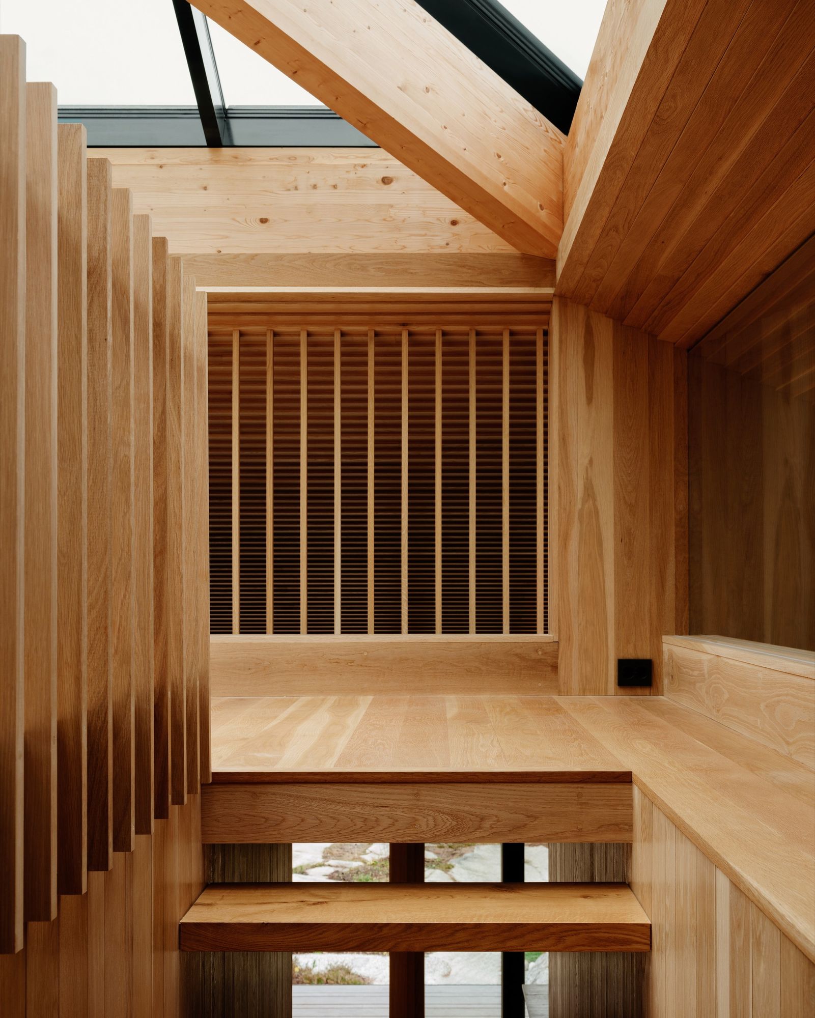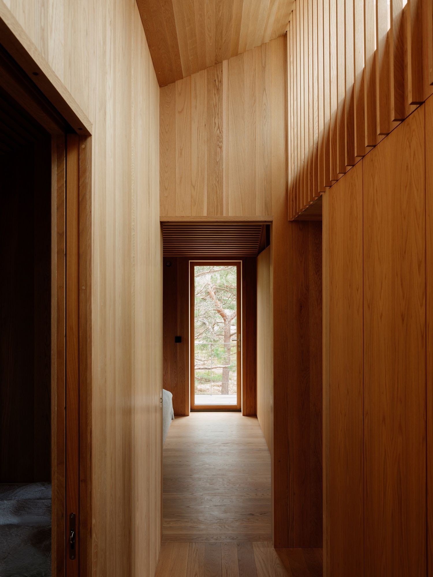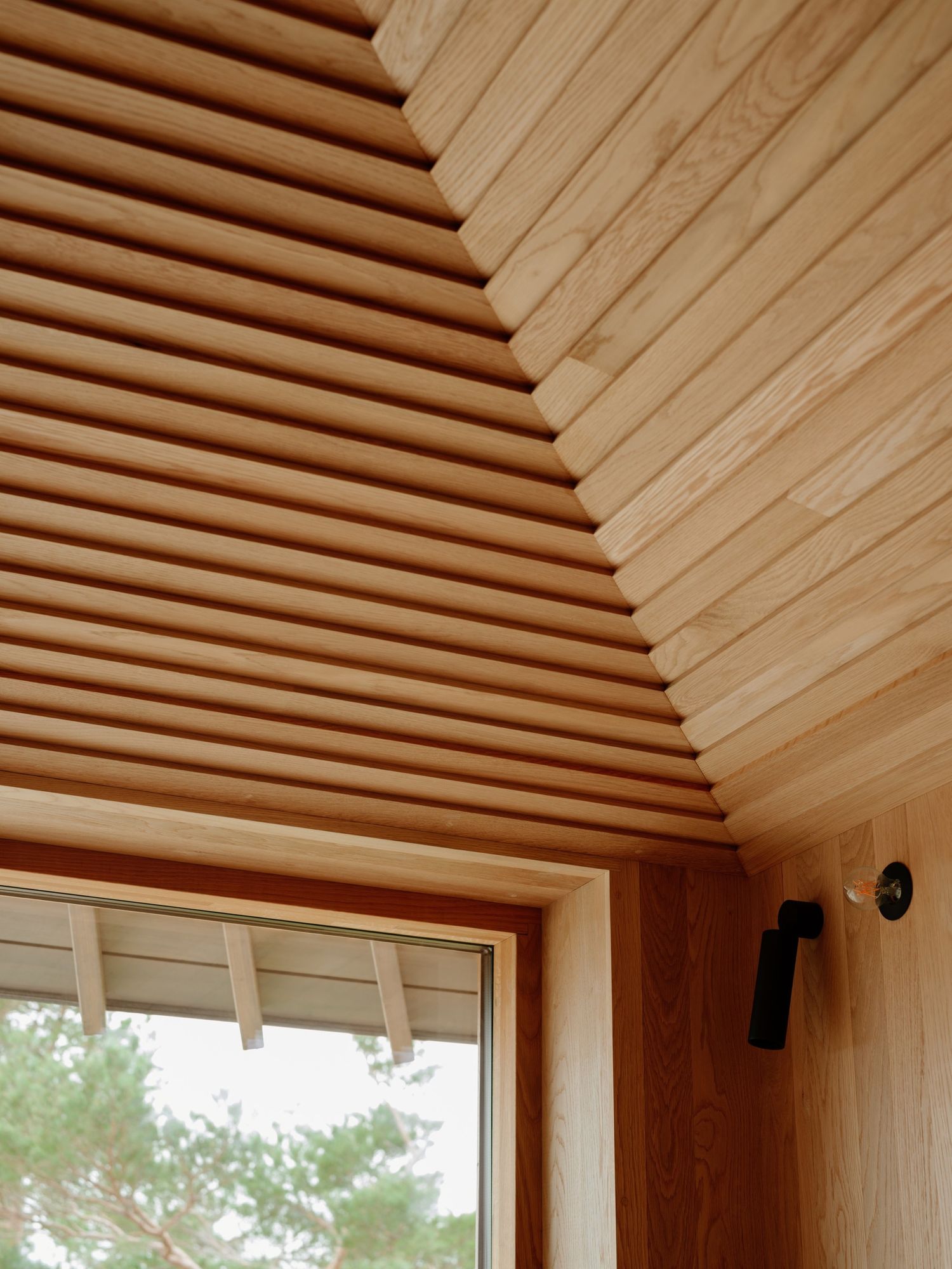 Cladding is in cedar and has different widths. There are also pillars with two different profiles. One is square and the other is deeper and concave. It provides a rich play of light and shadows in the facade. The profiles are designed and specially made at a local sawmill. The outside gallery is clad in burnt cedar to emphasize the envelope of the space within