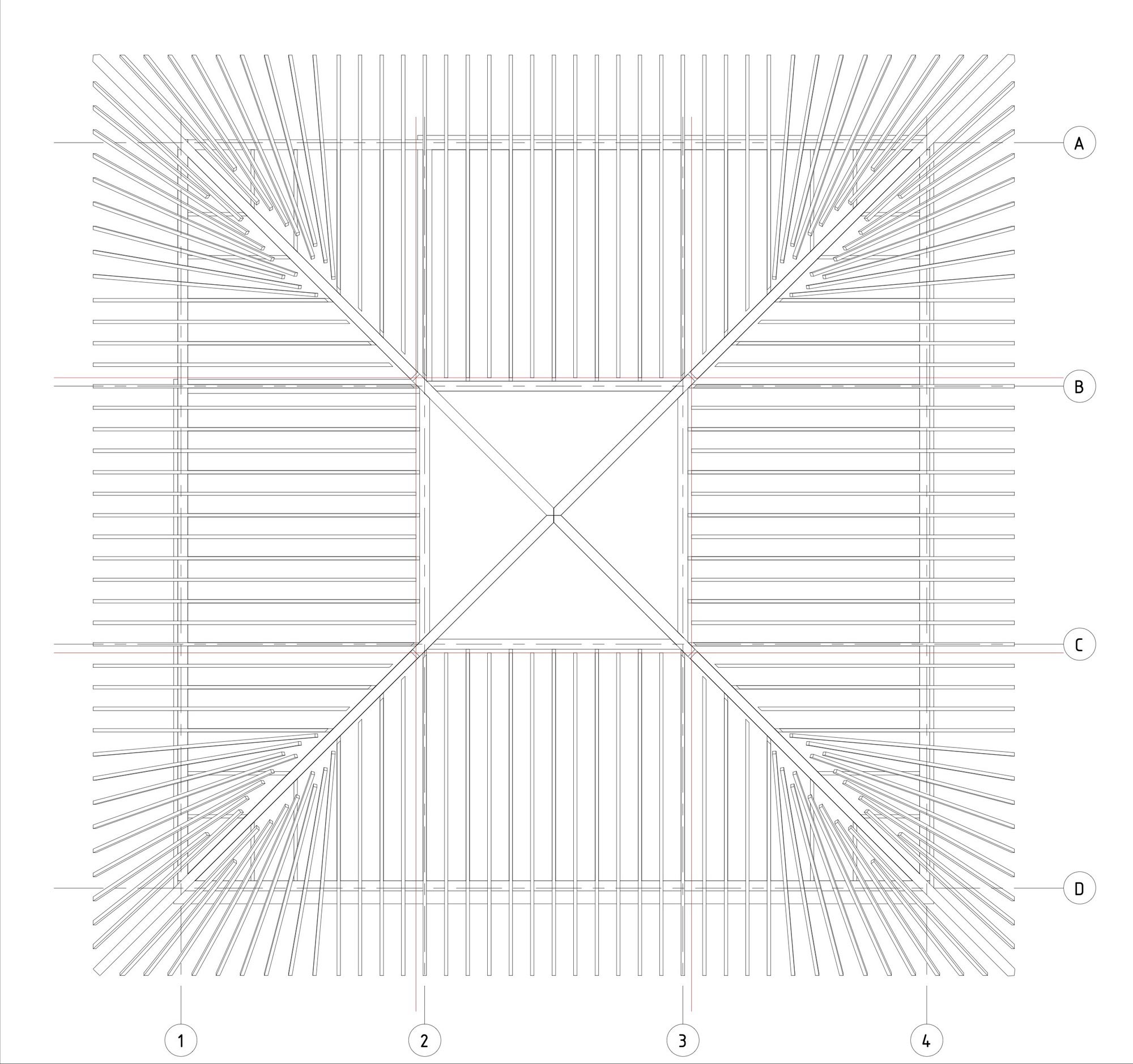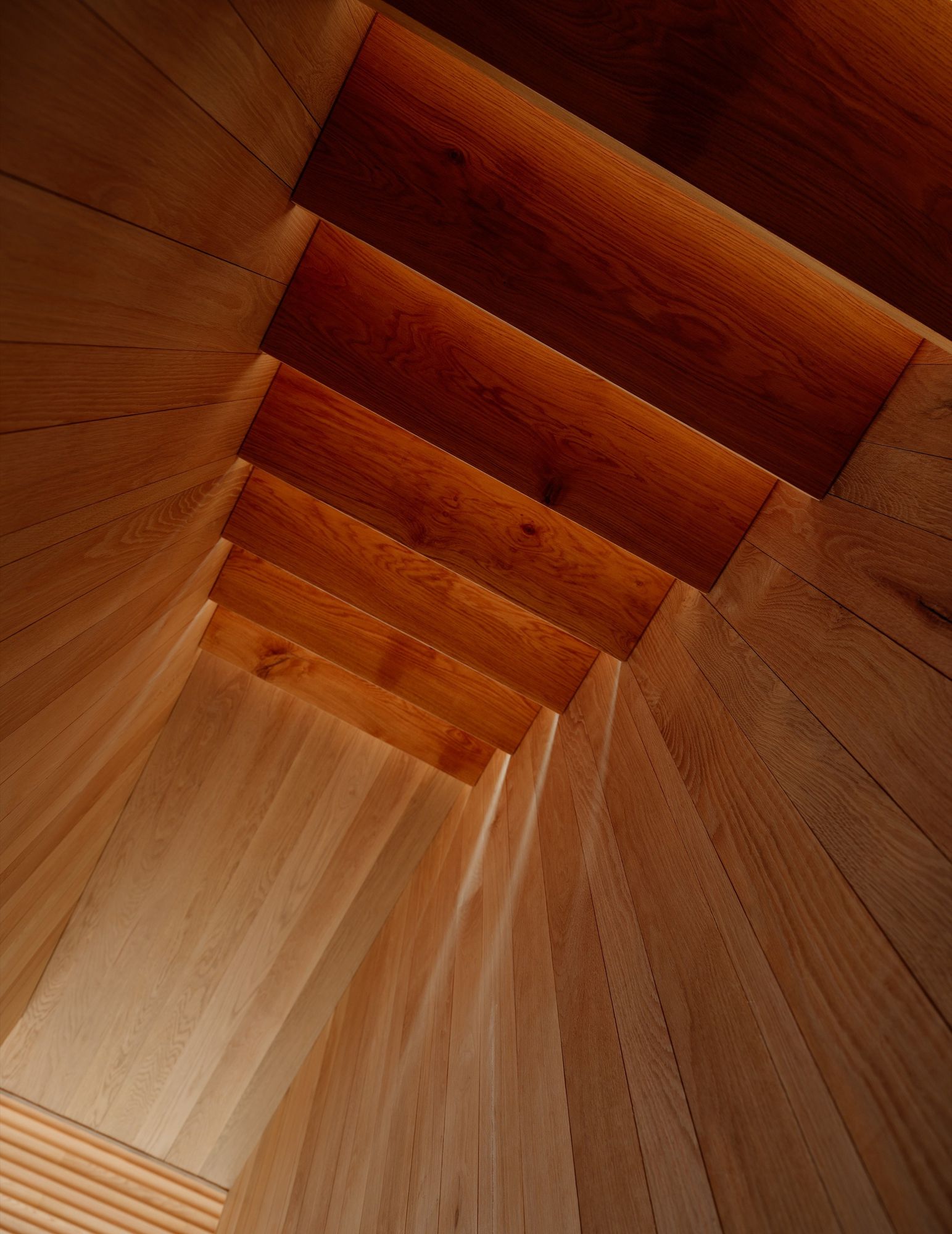 The center of the building has a glass roof, with a sunroof for natural ventilation. The ceiling is made of oak paneling with a custom-made profile. The profile is sloping on one side so that the light is refracted at a different angle than the ceiling. This provides a beautiful play of shadows in the ceiling and the roof is experienced differently at different times of the day. The ceiling is free of lamps or other technical installations in all rooms so that it frames the rooms with its beautiful shape.