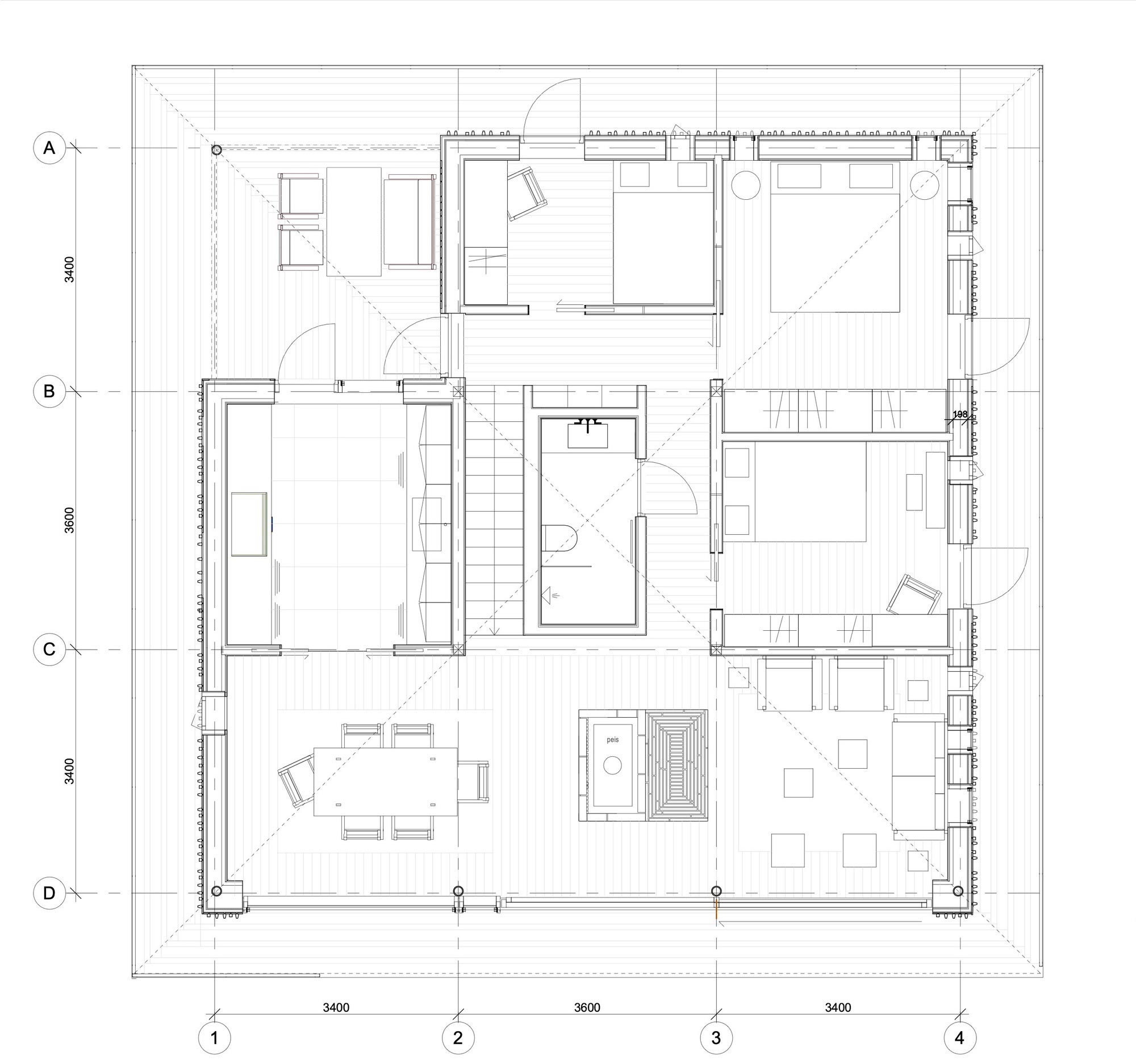 The weekend house is built over a square geometry and is an abstract shape, which in the face of the complexity of nature makes us aware of organic nature and our being in the world. The interior is devoted to focusing on open and dense surfaces that create beautiful views and play of light and shadow on the inner surfaces.