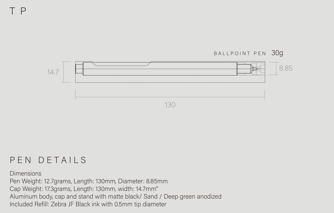 Every part of TP is machined from a solid block of aluminum, its functional cap provides dual-scale measurement and two-way-grip of the pen:one can hold it without the cap–an 8.85mm barrel that is smooth and light, or with the cap on