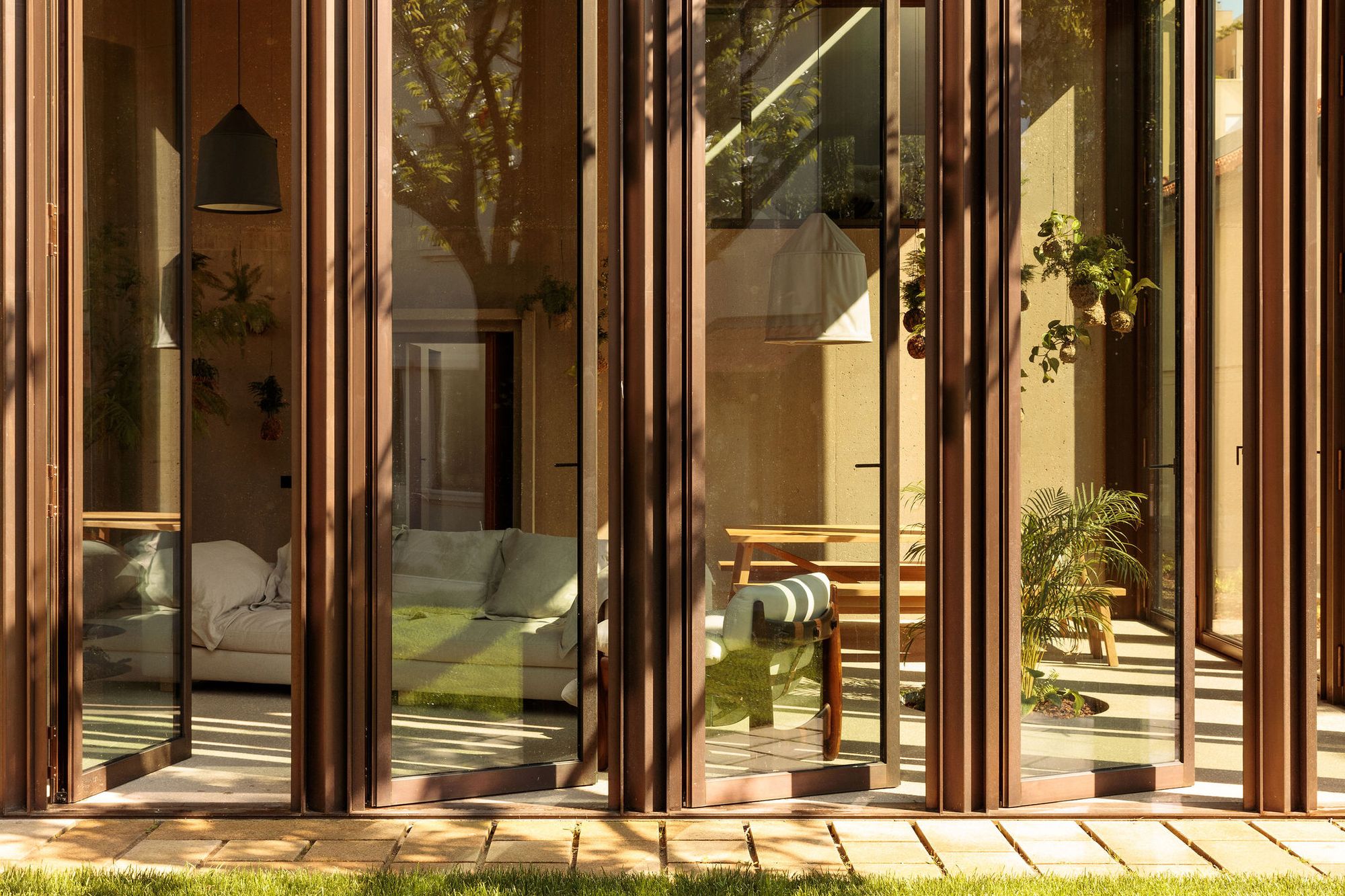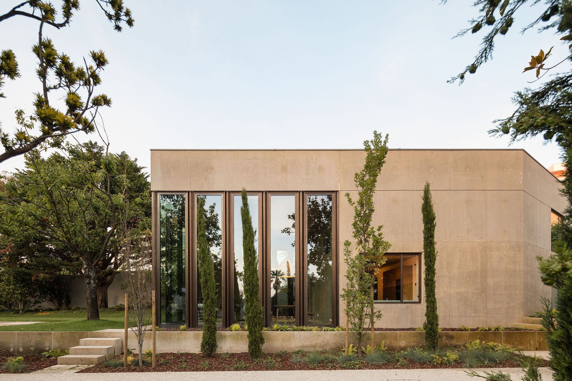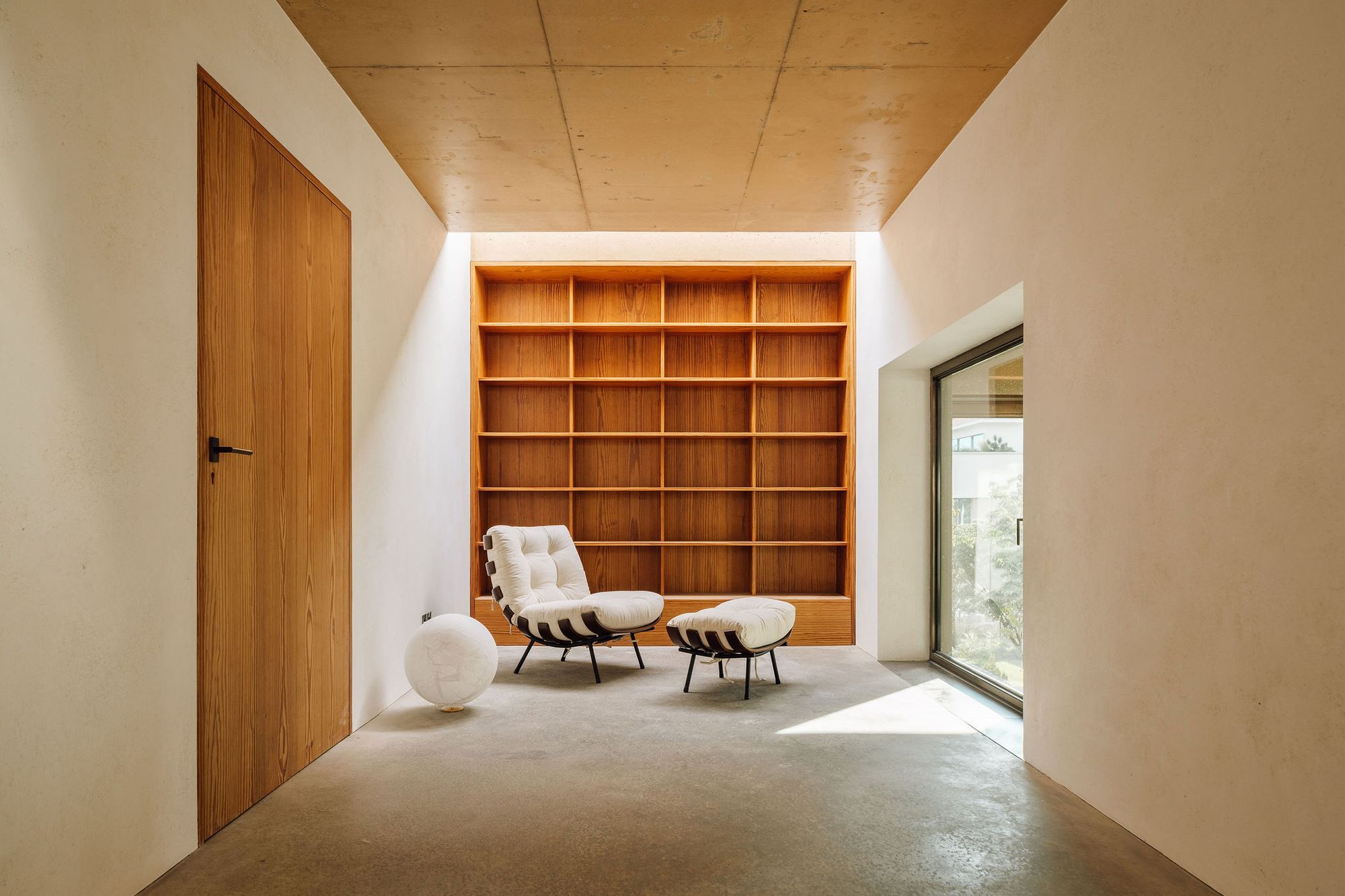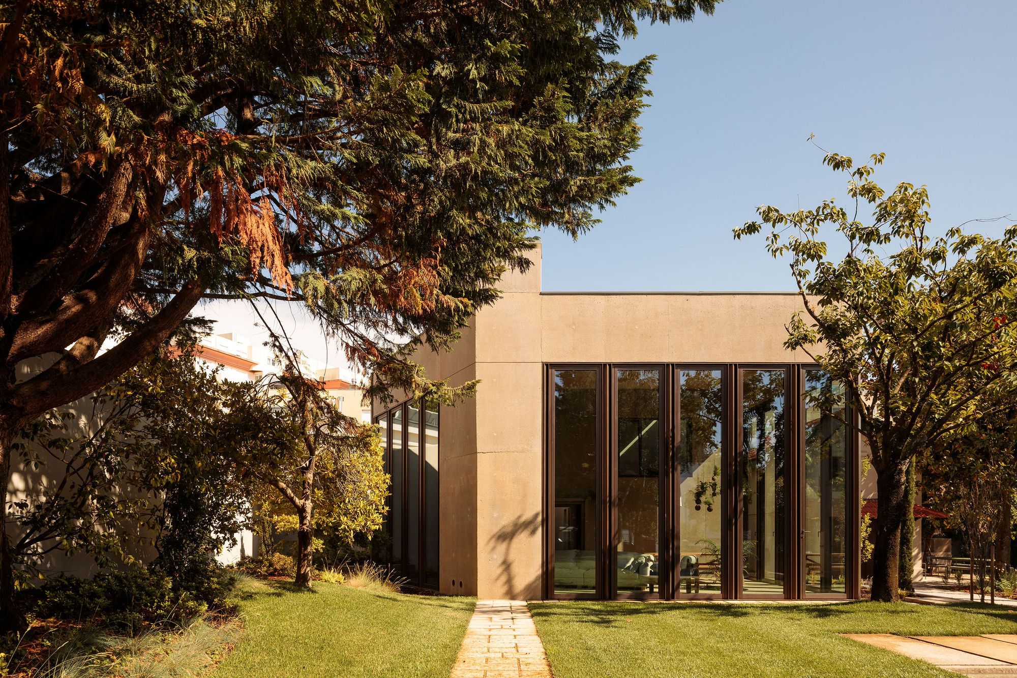 Casa 2 is a minimal home located in Porto, Portugal, designed by Bak Gordon. Casa 2 was built as a complement to an existing house from the end of the 19th century. It works as a kind of annex building or garden pavilion. Located at the far end of the property, it is also a backdrop for the garden. Its communal space is a generous double-height winter garden, which ensures the transition between the intimacy of the rooms and the outdoor space. The bedrooms, with a trapezoidal floor plan, expand to the outside and guarantee maximum comfort though the carpeted floor, walls covered in tadelakt and custom-made venetian terrazzo elements which make up the bathroom spaces. The kitchen and the library are small spaces directly related to the circulation and characterized by their thermally modified wooden cabinets that contrasts with the tadelakt finished walls and the concrete pavement. Built entirely in pigmented deactivated exposed concrete, and with oxidized brass frames, the volume rests on the ground with a specific geometry, committed to the multiple environments that gravitate around it. The flat garden consists on a platform from where the granitic swimming pool was subtracted.
