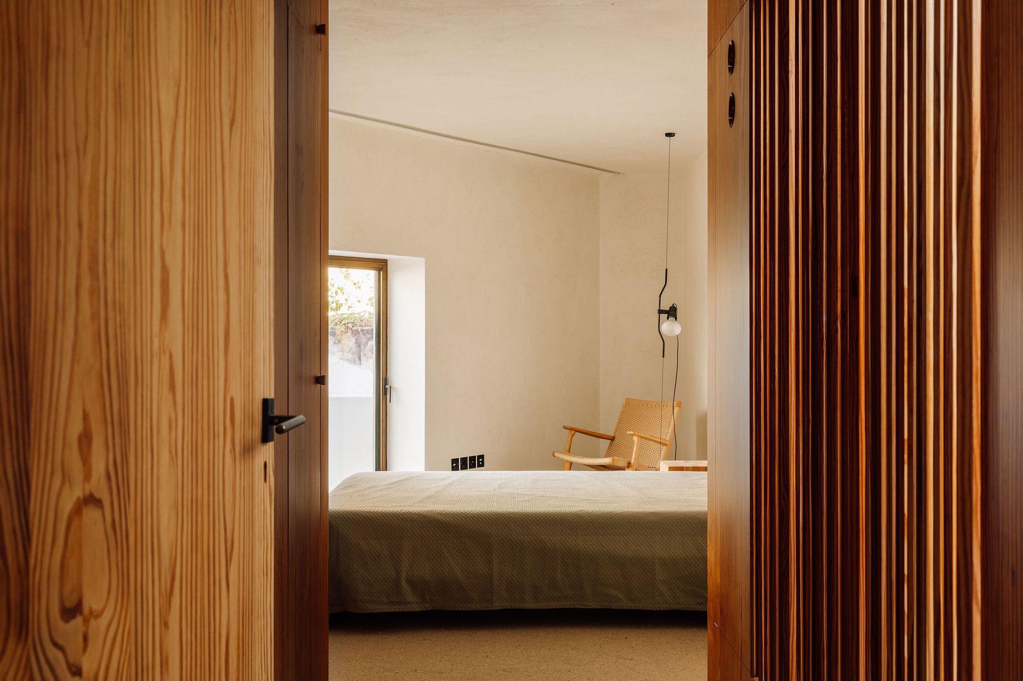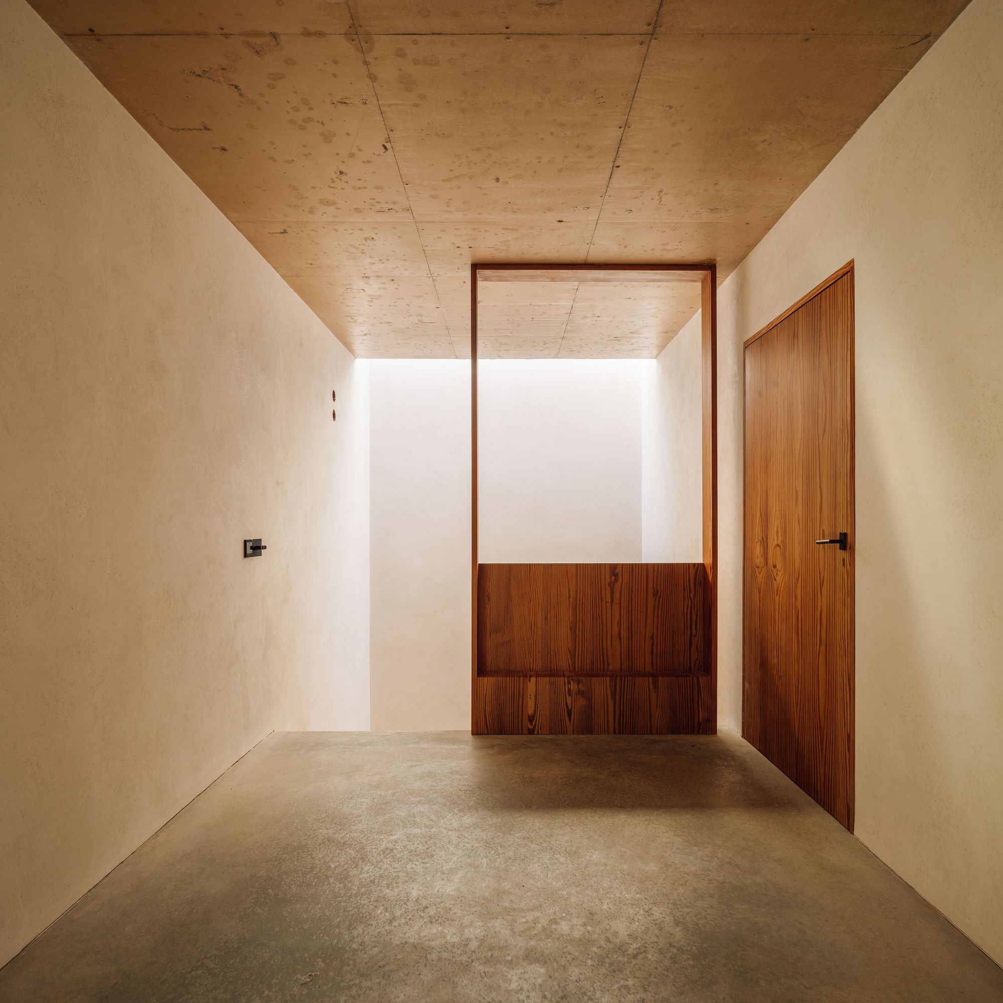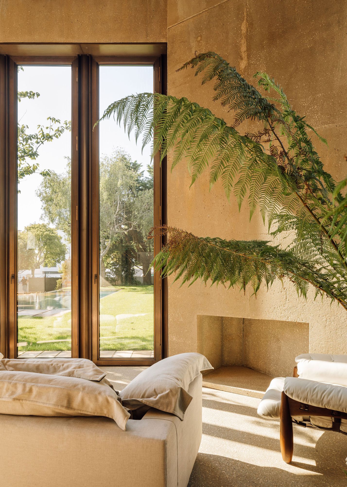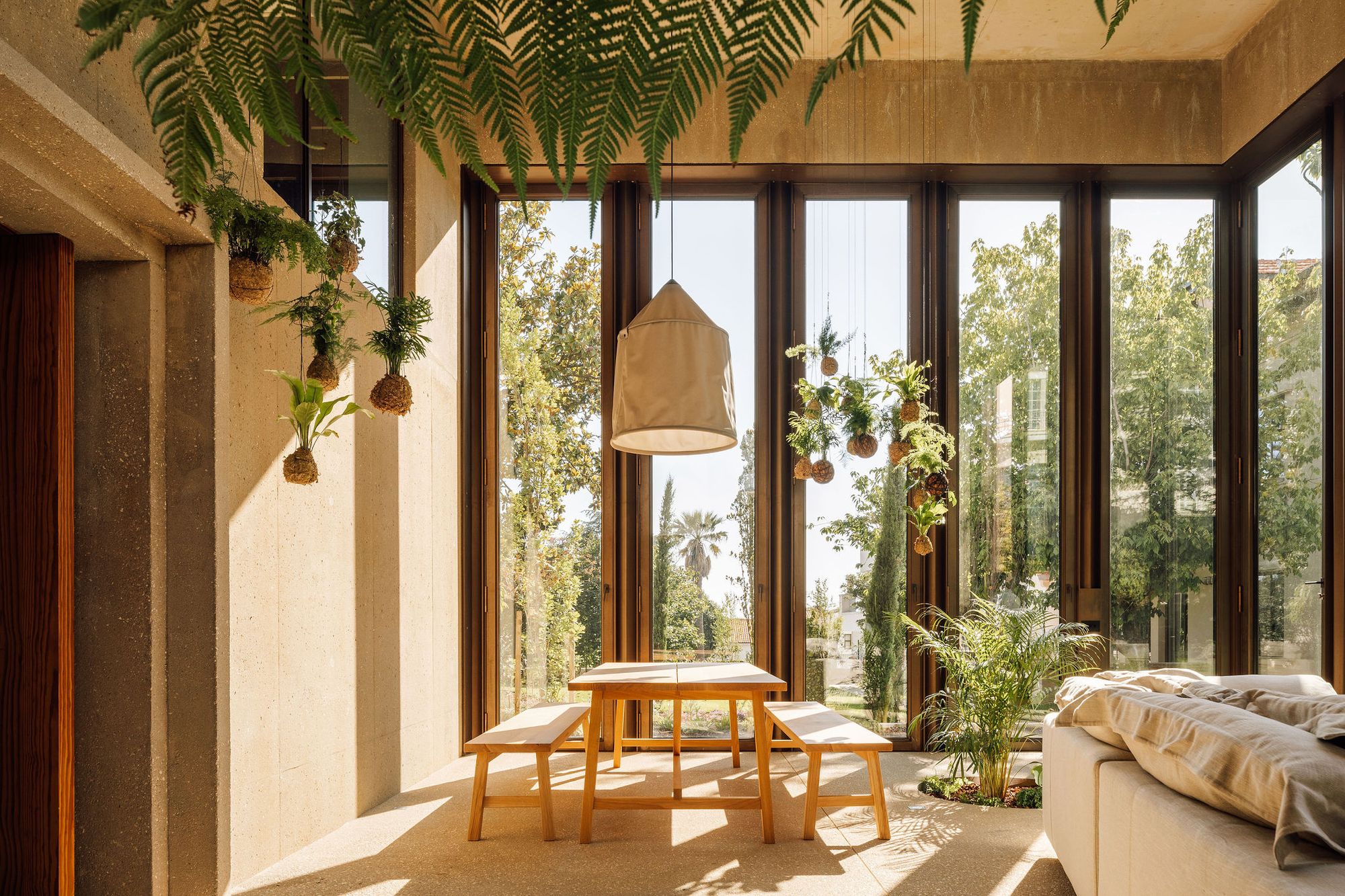 Casa 2 is a minimal home located in Porto, Portugal, designed by Bak Gordon. Casa 2 was built as a complement to an existing house from the end of the 19th century. It works as a kind of annex building or garden pavilion. Located at the far end of the property, it is also a backdrop for the garden. Its communal space is a generous double-height winter garden, which ensures the transition between the intimacy of the rooms and the outdoor space. The bedrooms, with a trapezoidal floor plan, expand to the outside and guarantee maximum comfort though the carpeted floor, walls covered in tadelakt and custom-made venetian terrazzo elements which make up the bathroom spaces. The kitchen and the library are small spaces directly related to the circulation and characterized by their thermally modified wooden cabinets that contrasts with the tadelakt finished walls and the concrete pavement. Built entirely in pigmented deactivated exposed concrete, and with oxidized brass frames, the volume rests on the ground with a specific geometry, committed to the multiple environments that gravitate around it. The flat garden consists on a platform from where the granitic swimming pool was subtracted.