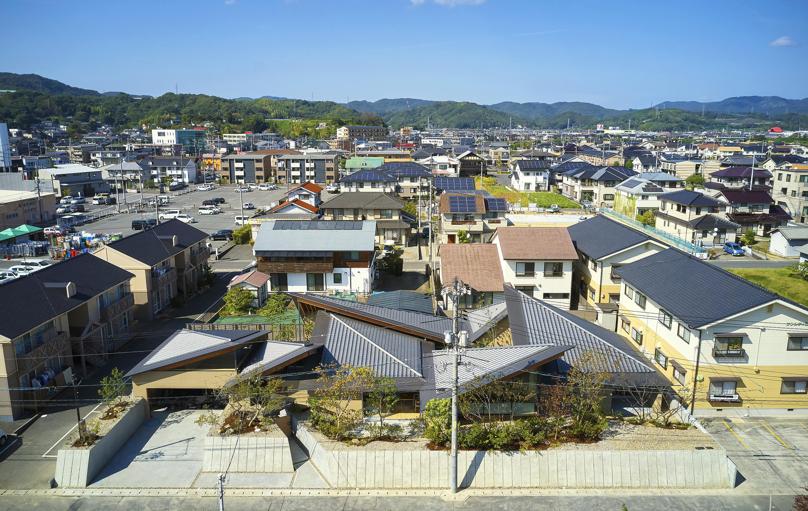 Privacy, light, and ventilation are achieved through variances in the slope, height, and orientation of the roof, and the entire house is arranged to give a sense of cadence to the internal continuity The roof is shaped so that it gives off the impression that the three vertices of the rectangle are fixed and the one remaining vertex has been picked up with a finger. These were connected in a row over the seven buildings and arranged across the entire site in a way that matches the surrounding environment.