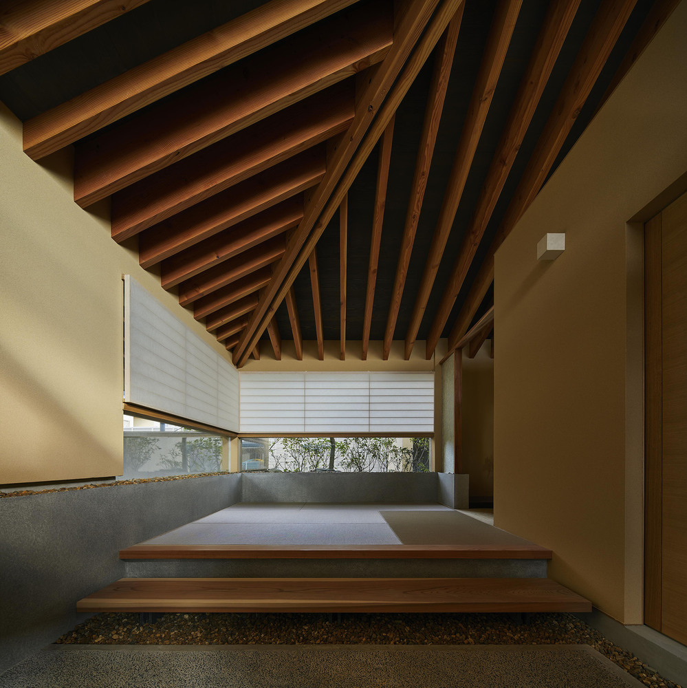 The landscape surrounding the site is made up of traditional gable and hip roof houses. Therefore,we incorporated deep eaves that create shadows and a tiled roof that reflects the changing colors of the sky and designed a wooden Maya(gable roof) that blends into the neighborhood while renewing the existing skyline. While the site is relatively large for a house,by dividing it into seven separate buildings instead of building a single large roof,we created a flowing floor plan and included numerous surfaces that connect with the external environment.
