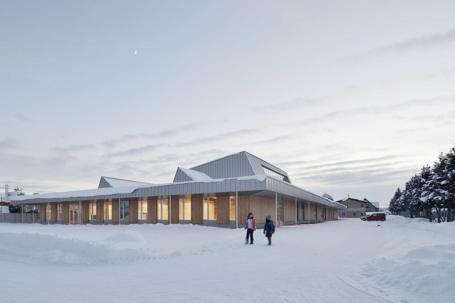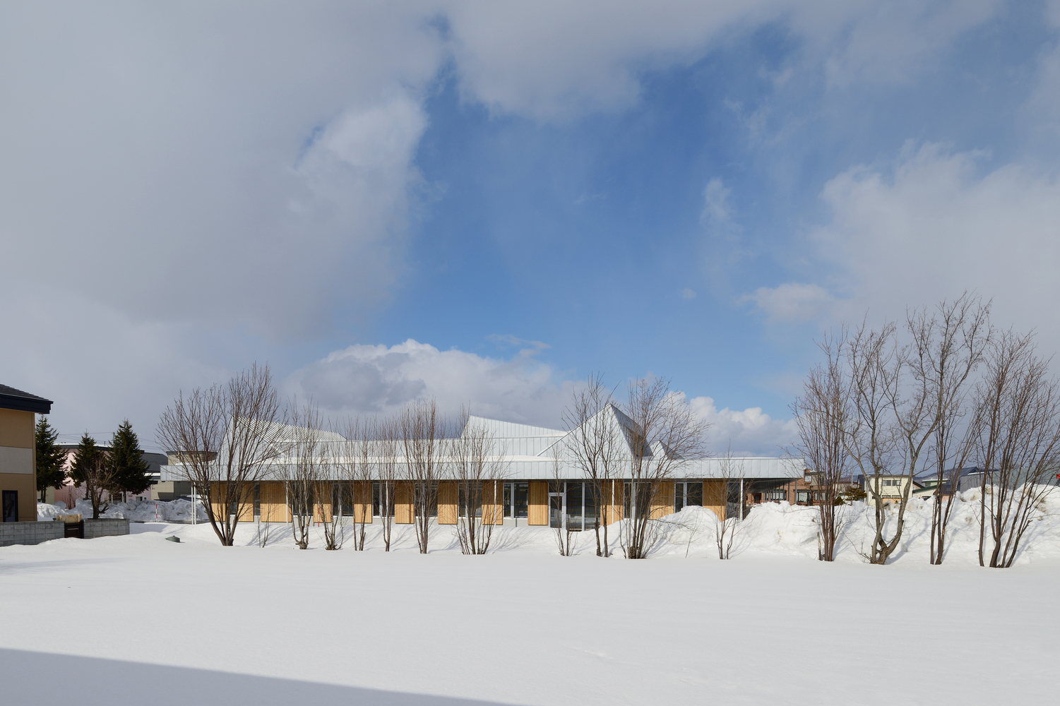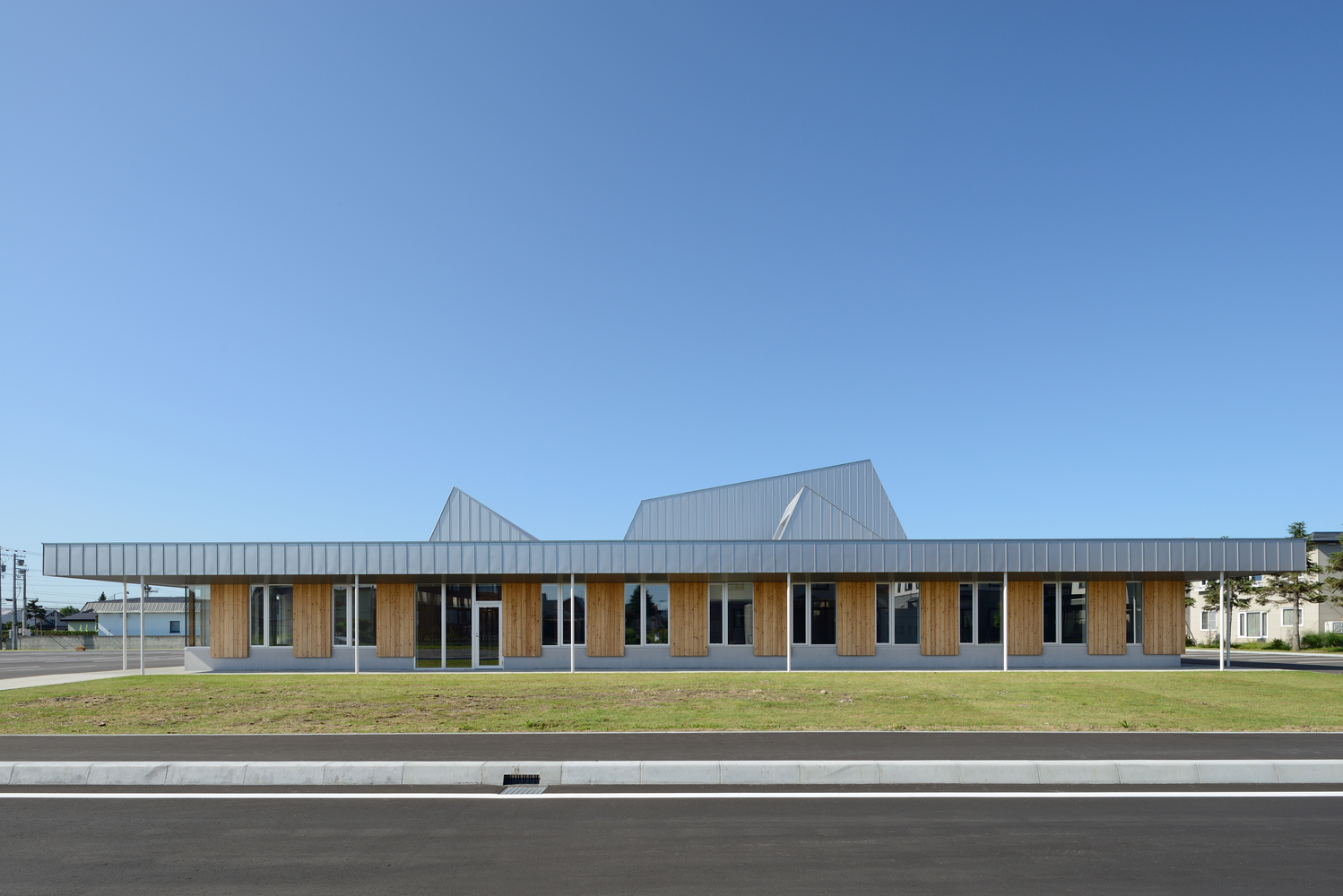 The building is a compact one-story building with a central hall, and the planned layout adapted to the surrounding residential scale. Deep eaves around the four sides protect visitors from the snow and create a welcoming impression from any direction. The sloping roof, designed in consideration of snow accumulation, snow-sliding, and lighting, allows the facility to blend into the adjacent residential area, and the metal sheets reflect the changes of season and time.