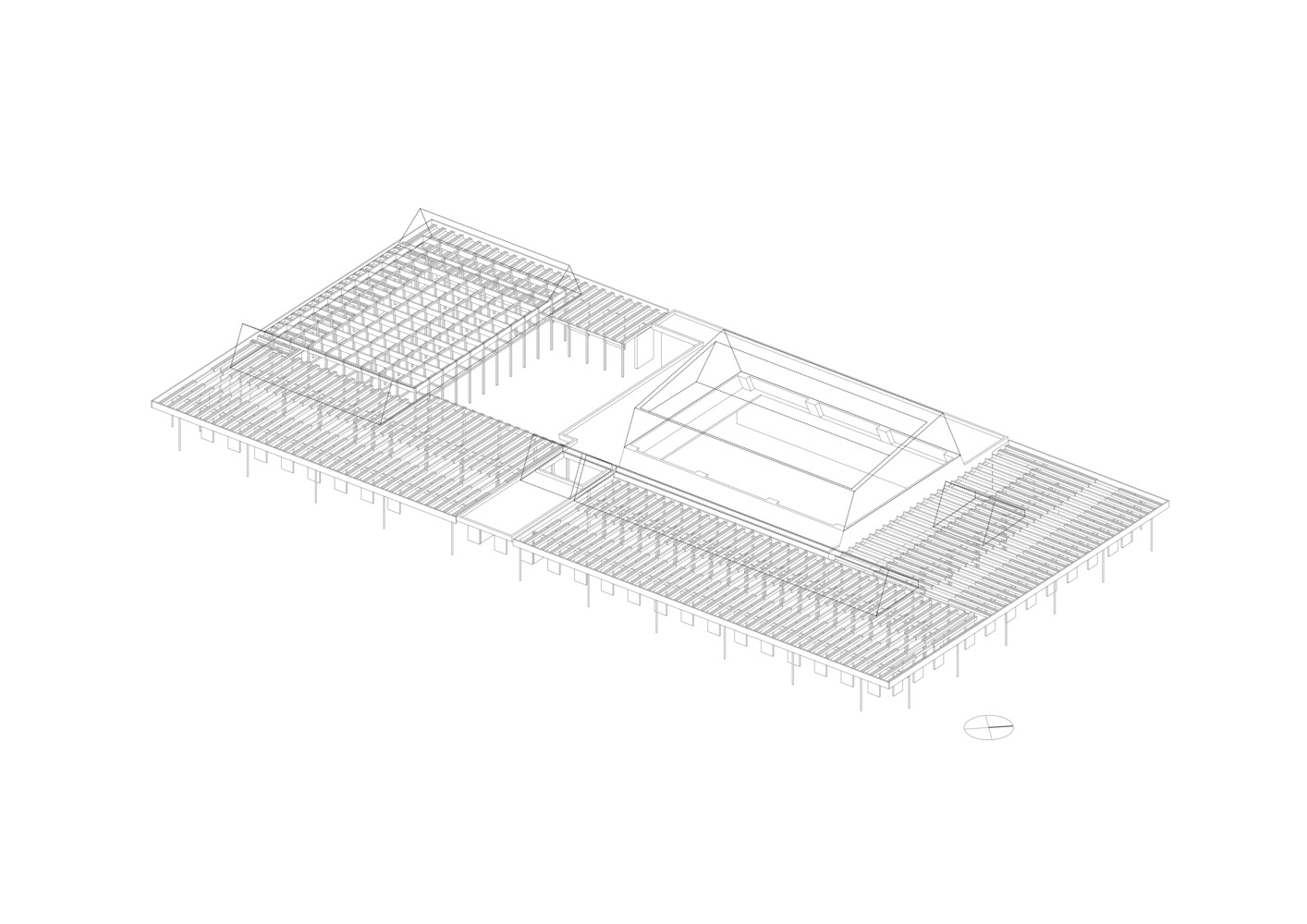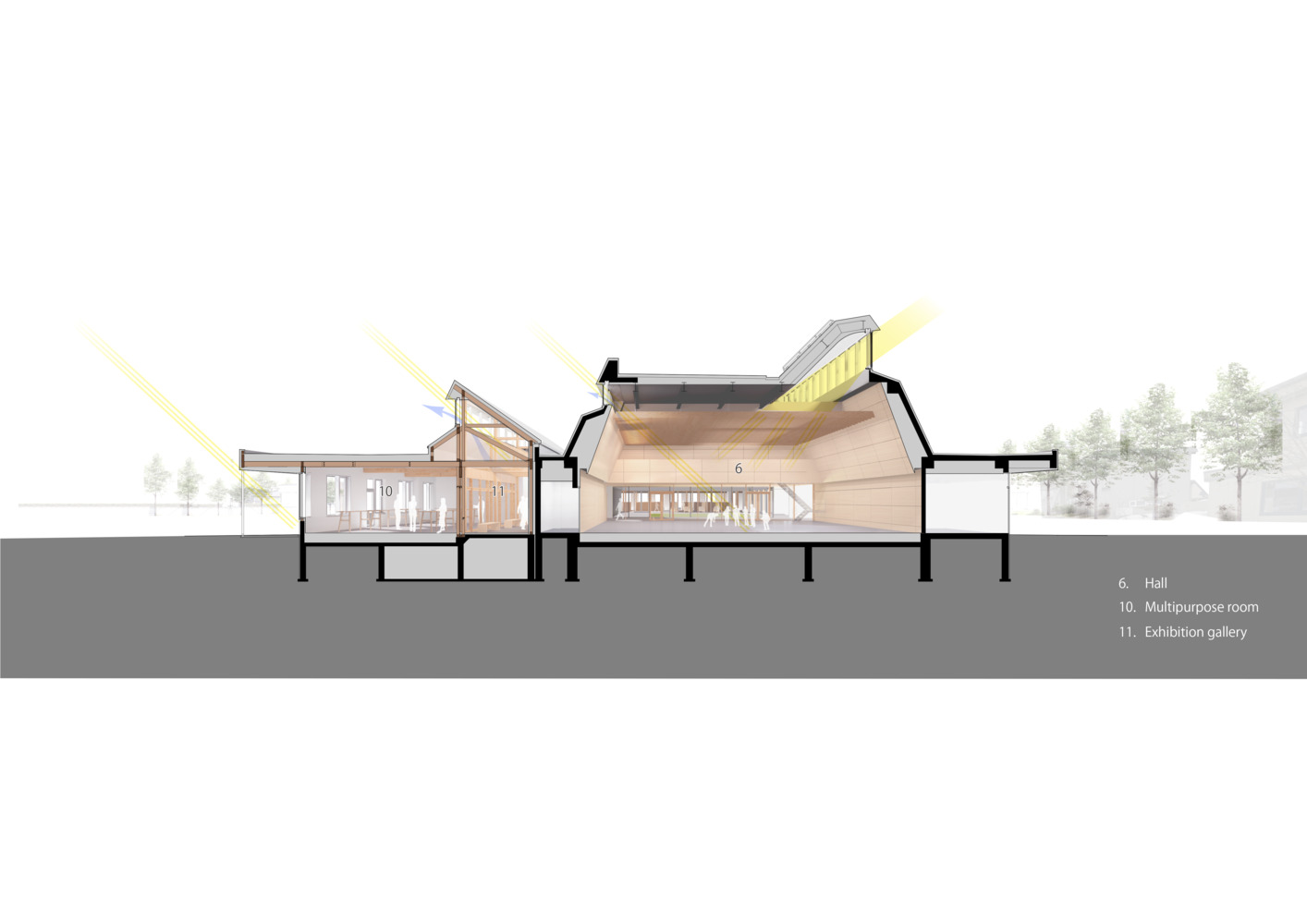 The plan was to hollow out a large courtyard into a simple quadrilateral plane and integrally connect the public hall and library functions via the courtyard. A number of locations scattered around the courtyard allow the natural light to penetrate, and affording the townspeople with areas to pass their time freely.