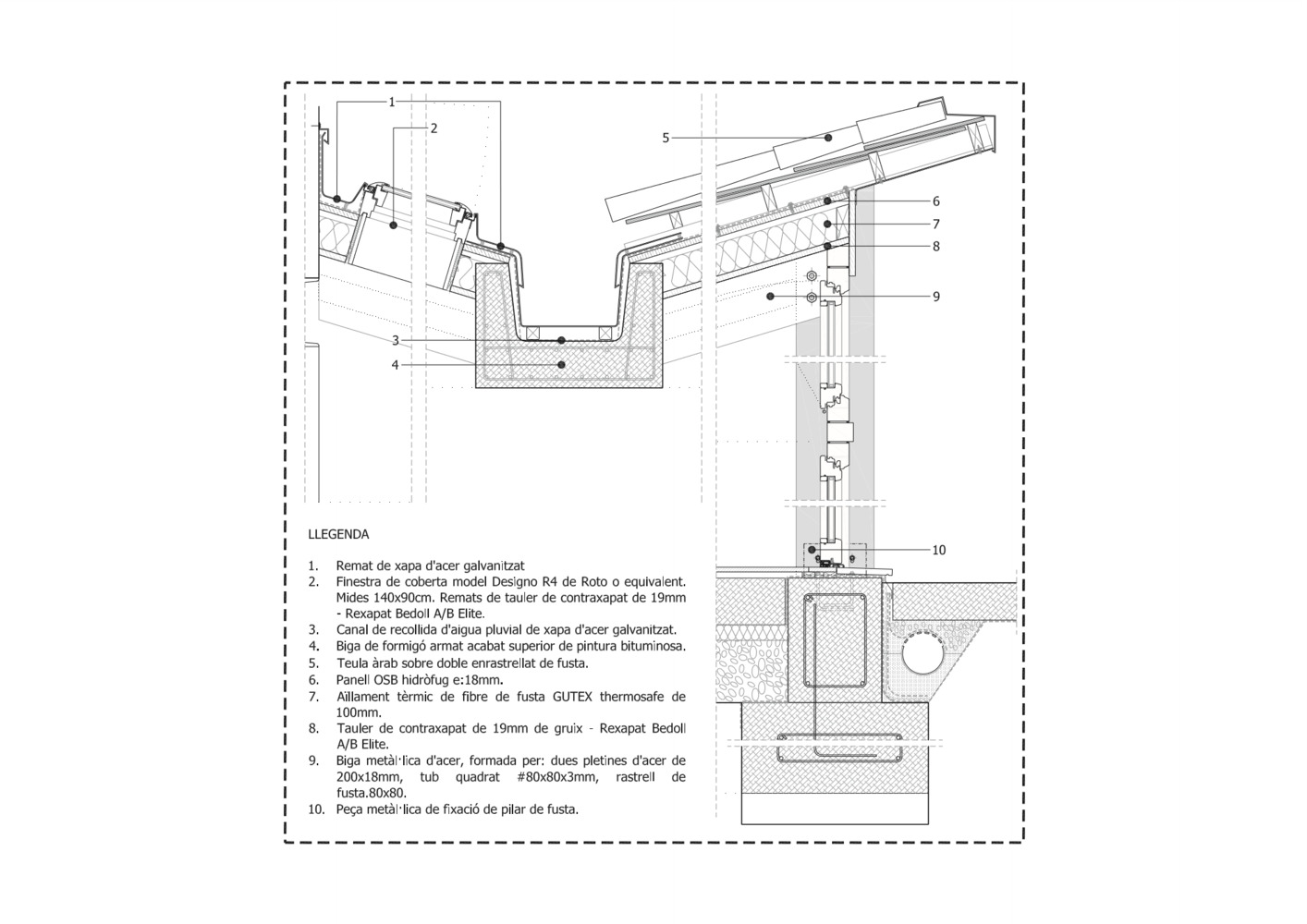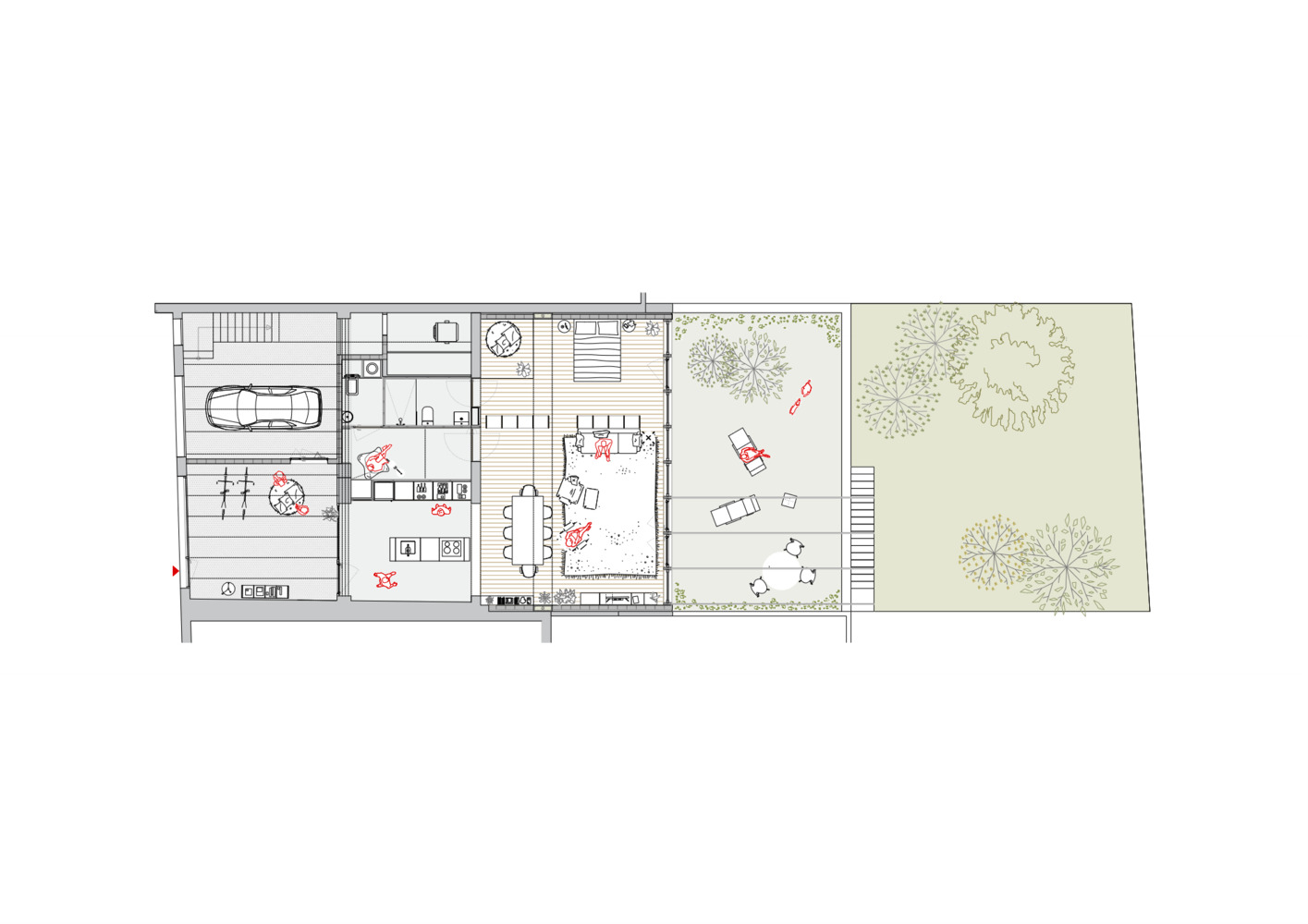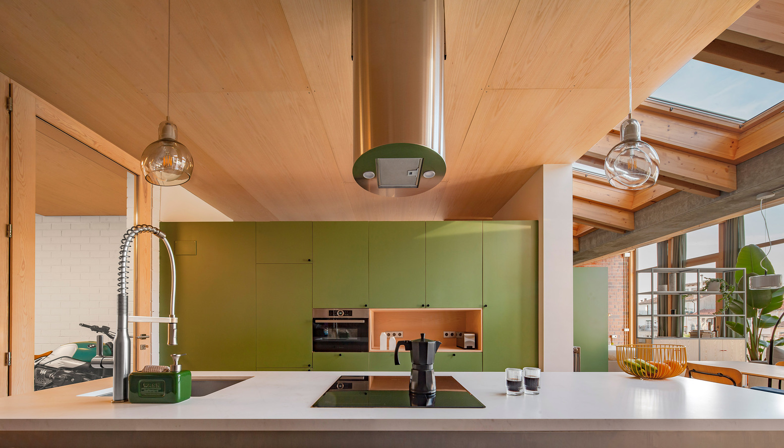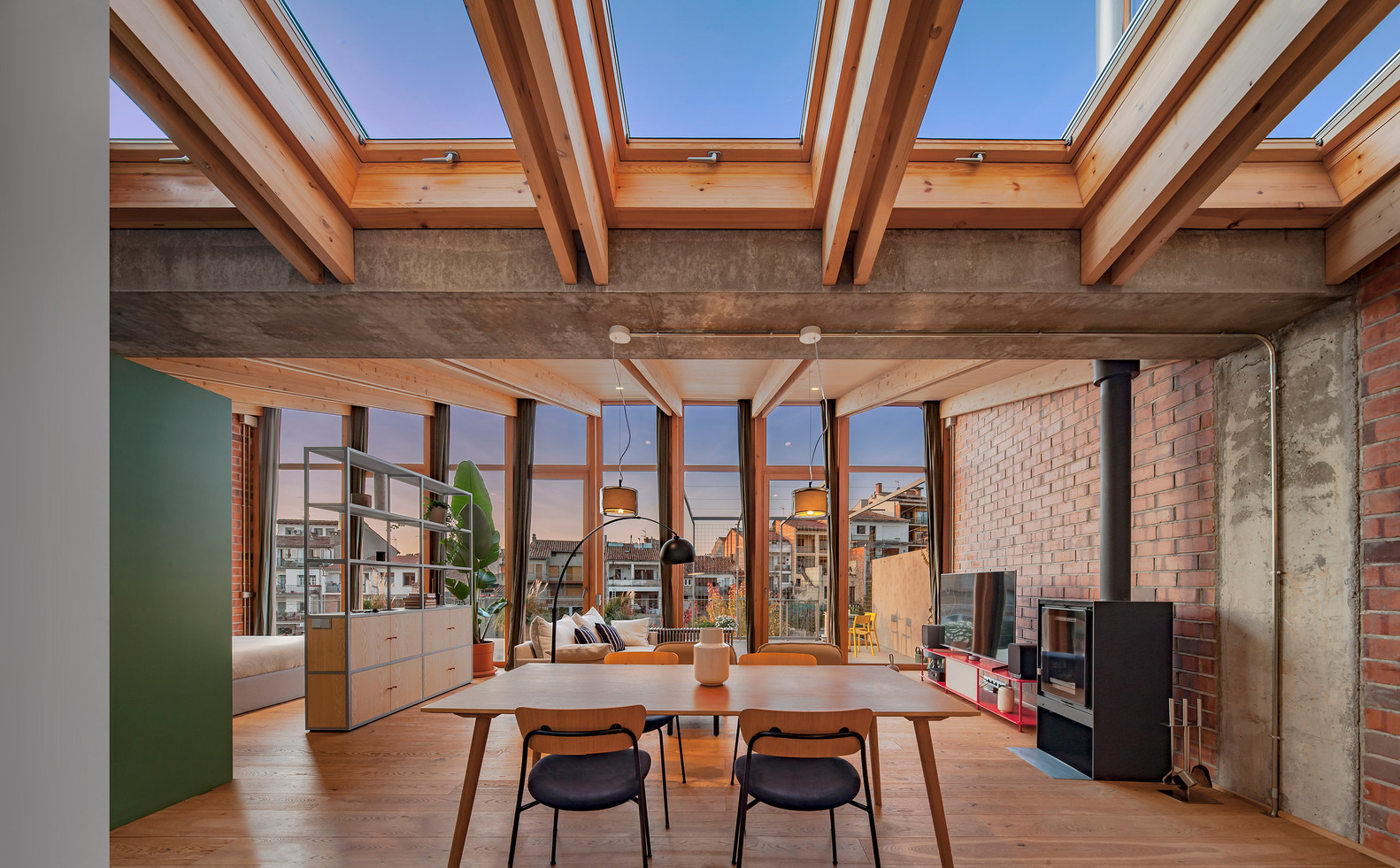 To respond to the needs of the brief, five metres of the courtyard to the rear were incorporated into the dwelling and, in keeping with regulations on sloping roofs, Sau Taller d’Arquitectura proposed a V-shaped roof that gives the dwelling views, as well as limiting the headroom inside and ensuring the resulting volume does not deprive the pre-existing house on the first floor of views, light, and ventilation. The chosen solution also generates a linear opening right across the rear façade, facing southwest and overlooking the market garden plots in the area, which guarantees light and ventilation in the central space. This V-shaped roof, however, involves some technical complications, especially for shedding water. To solve these issues, a large reinforced concrete beam channel was built between the two-party walls to collect rainwater from both slopes and serve as a support for the roof beams, while organizing the indoor space. In terms of layout, the floor space is divided into interrelated bays, three inside and two outside. The first is a filter between the outside and the dwelling, containing the entrance and a parking space. The kitchen, bathrooms, and studio are situated at the centre of the floorplan, where they receive daylight and natural ventilation through the opening in the roof.
