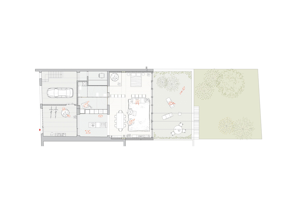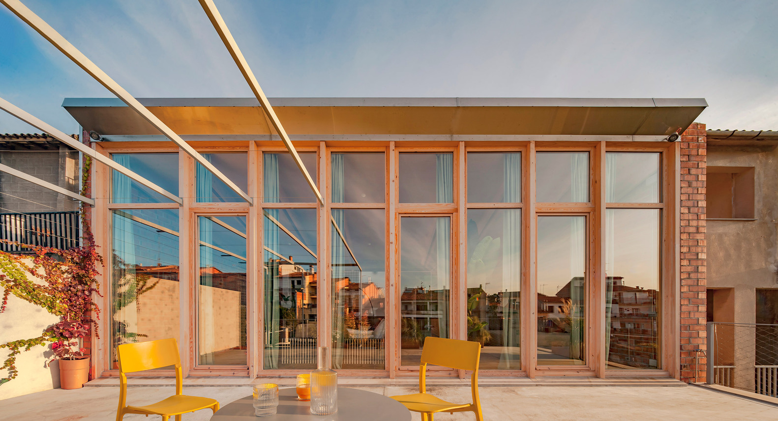 To respond to the needs of the brief, five metres of the courtyard to the rear were incorporated into the dwelling and, in keeping with regulations on sloping roofs, Sau Taller d’Arquitectura proposed a V-shaped roof that gives the dwelling views, as well as limiting the headroom inside and ensuring the resulting volume does not deprive the pre-existing house on the first floor of views, light, and ventilation. The chosen solution also generates a linear opening right across the rear façade, facing southwest and overlooking the market garden plots in the area, which guarantees light and ventilation in the central space. This V-shaped roof, however, involves some technical complications, especially for shedding water. To solve these issues, a large reinforced concrete beam channel was built between the two-party walls to collect rainwater from both slopes and serve as a support for the roof beams, while organizing the indoor space. In terms of layout, the floor space is divided into interrelated bays, three inside and two outside. The first is a filter between the outside and the dwelling, containing the entrance and a parking space. The kitchen, bathrooms, and studio are situated at the centre of the floorplan, where they receive daylight and natural ventilation through the opening in the roof.