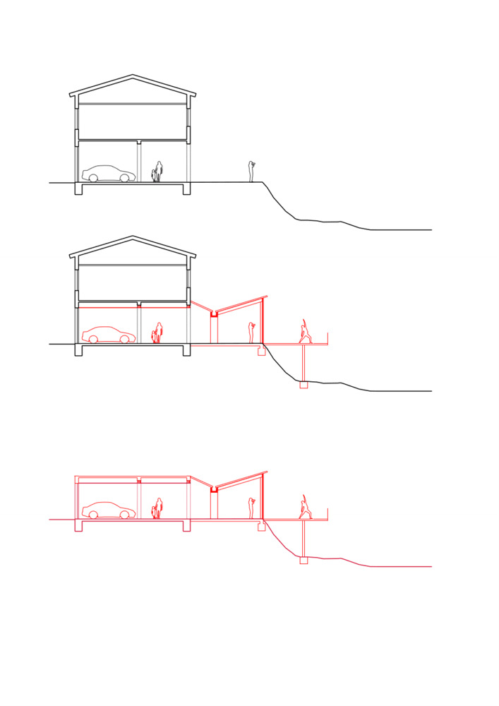 기존 주거공간으로 부터 확장된 공간은 자연채광과 전망을 최대한 유지 또는 확장하기 위한 작업을 바탕으로 합니다. 남서측으로 확장계획을 진행합니다. 기존과 확장공간의 구분점에는 역전지붕, v자 형태의 지붕을 계획합니다. 기존 주거공간에 안정적인 채광을 확보하는 동시에 연속된 단면공간을 보장하기 위한 건축어휘로 적용됩니다.
