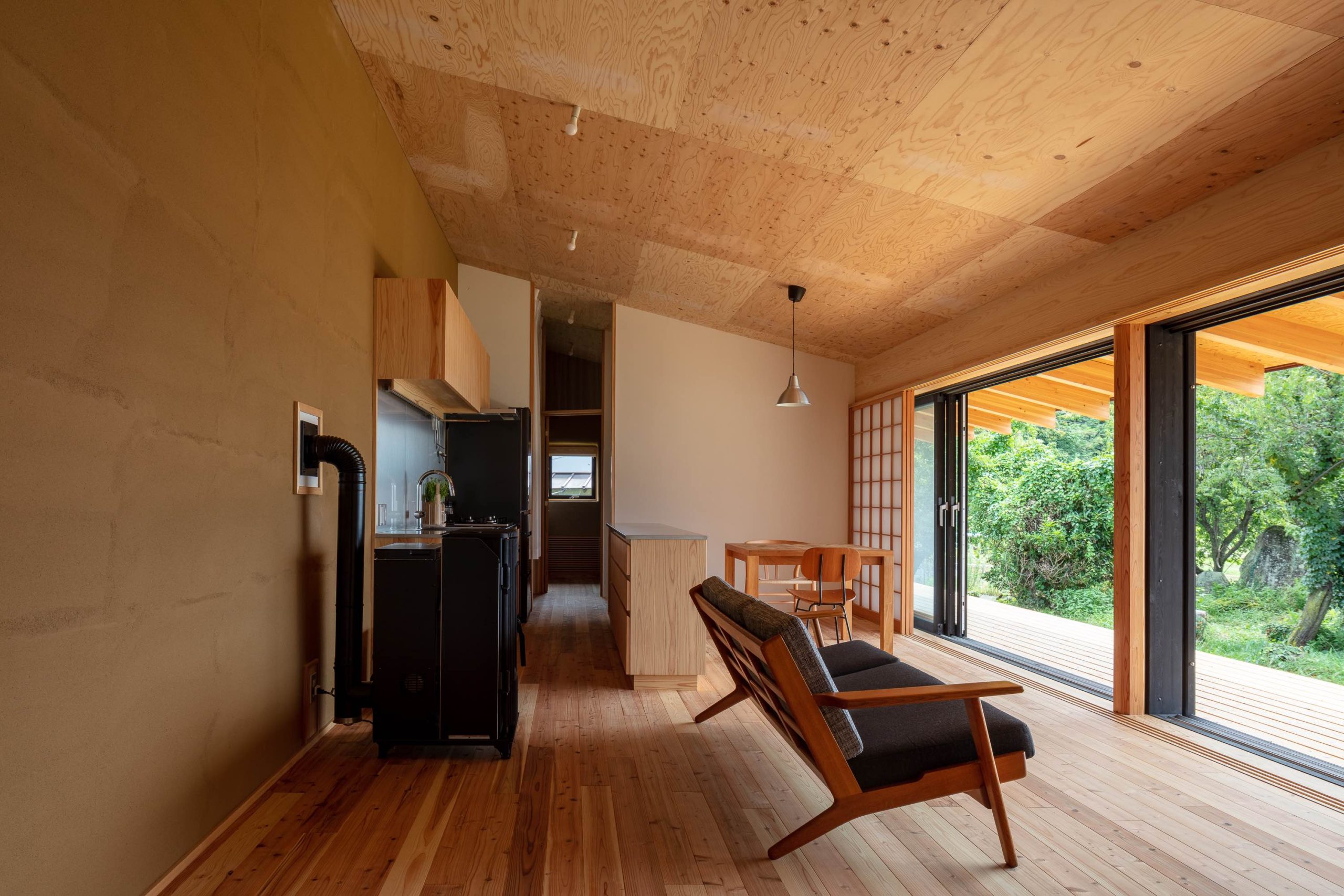In addition, in order to cope with off-the-grid, a large single-flow roof sloping to the south was installed to maximize sunlight. By minimizing the foundation in contact with the ground so as not to affect the soil environment and using it as the foundation for recyclable iron plates, concrete becomes unnecessary. By setting the floor at a height of 1 m from the ground surface, guests can see Mt. Fuji from inside the house and keep the floor in a dry state. Using the “Straw Bale House” construction method, straw blocks, which are both wall materials and heat insulating materials, are piled up in a workshop and coated with soil, and all the heat insulating materials on the floor and ceiling are made of wood fiber, which is a biodegradable material for the building.