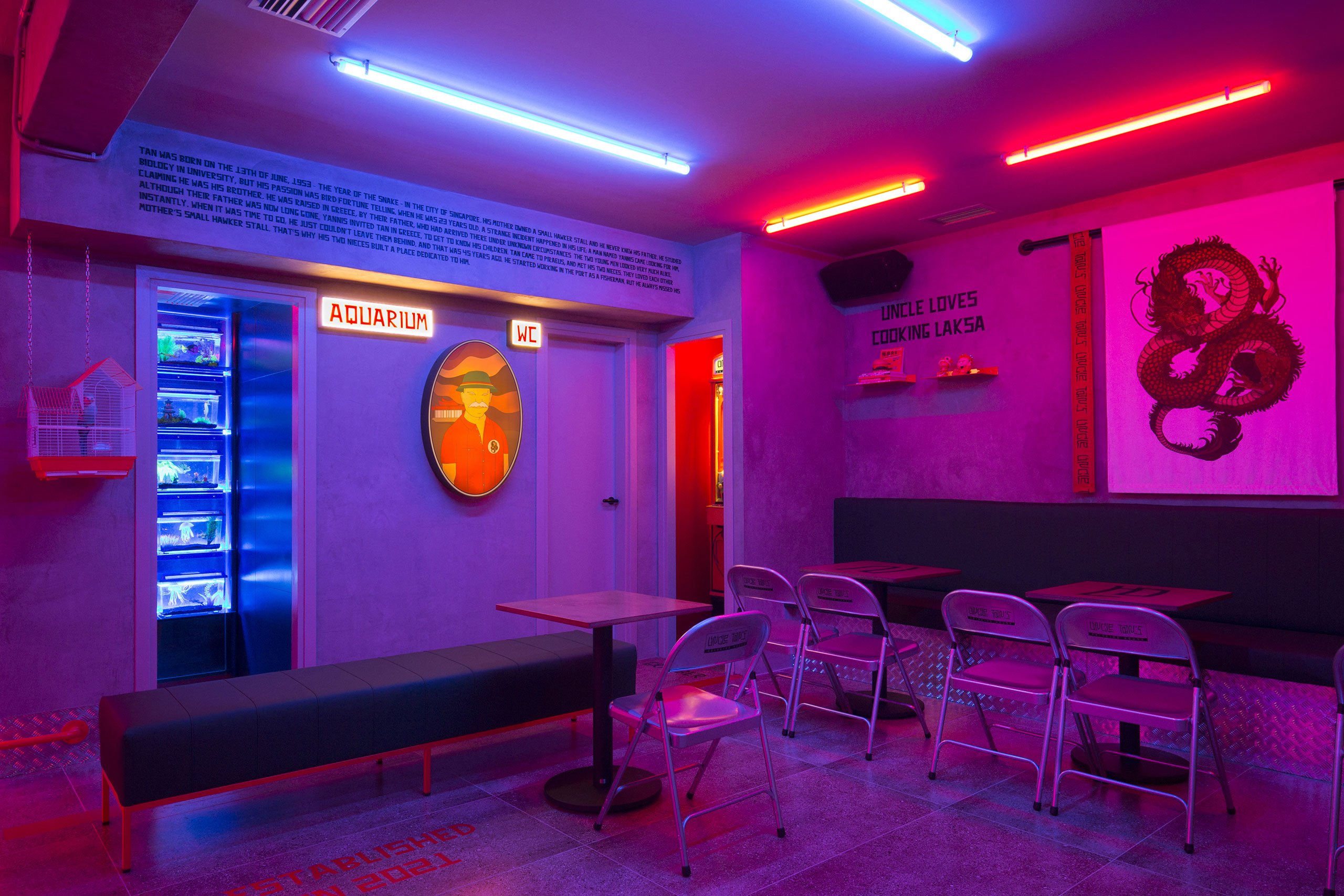 The bar’s bittersweet story is reflected in the idiosyncratic interior design which combines an industrial aesthetic of concrete and steel finishes that echoes Piraeus’ urban character with a kaleidoscopic profusion of red, blue, green and purple neon lights that allude to Tokyo and Singapore’s nightlife. Clues about Uncle Tan’s life abound; from a prominently displayed illustrated portrait, to memorabilia such as a lantern, a fishing rod, and numerous Asian cooking books - a wall inscription informs patrons that Tan’s favourite dish was laksa, a spicy noodle soup - to two quirky rooms, one filled with mini aquariums, and another featuring an arcade claw machine with toys like Picatsu and Hello Kitty. Larger and smaller dragon illustrations, part of studiomateriality’s branding, further enhance the Asian theme as well as function as health and luck symbols.