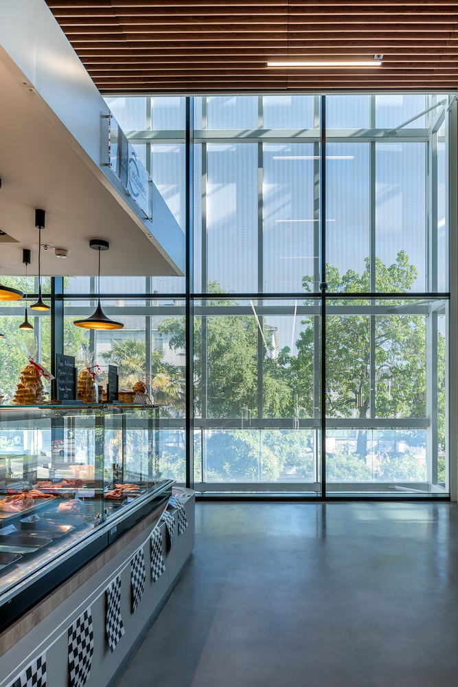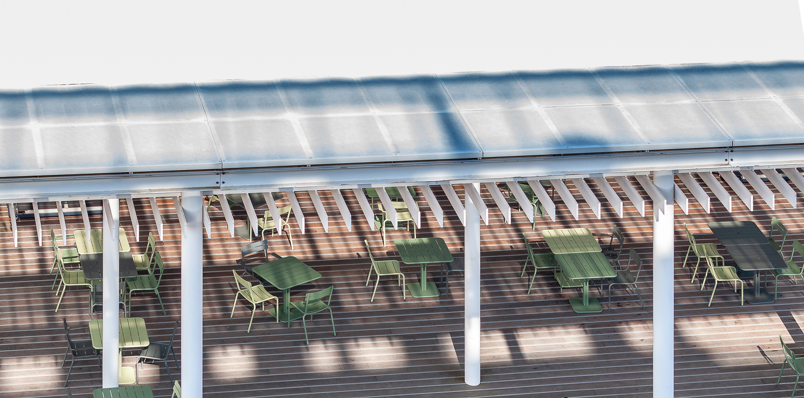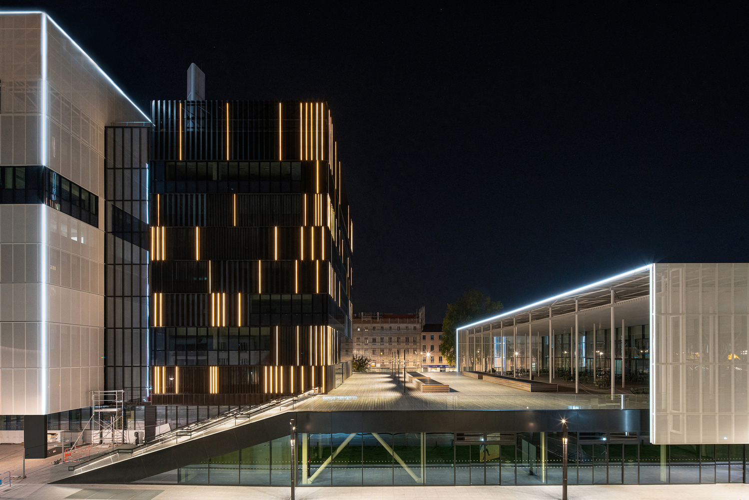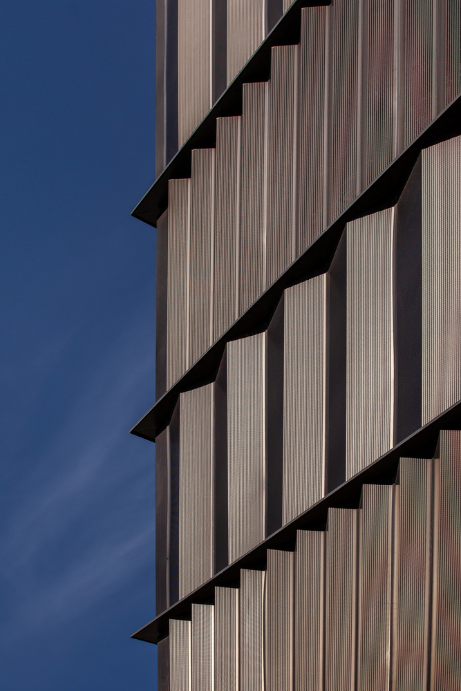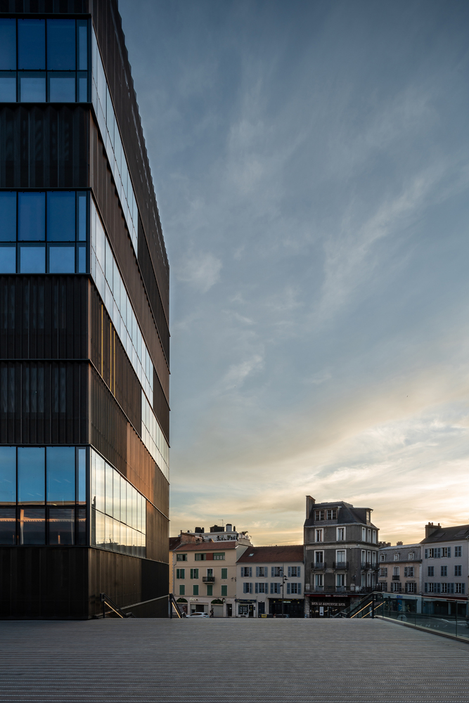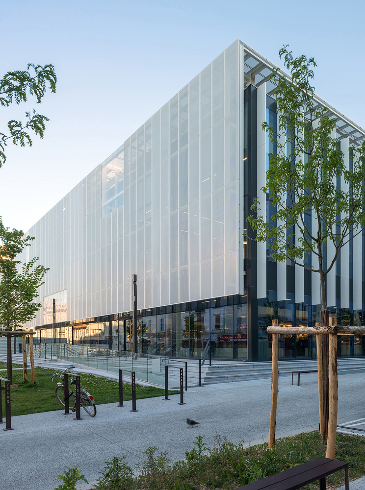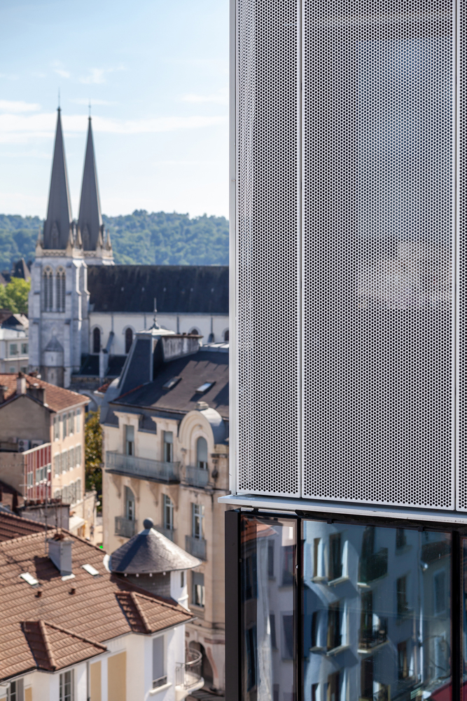 The rehabilitated office tower retains its civic vocation (Municipal Police/City services). The architectural treatment of its two parts is deliberately differentiated but complementary. Raised by 8 and 4 meters, the new silhouettes of the towers are slimmer. The eastern part is clad in the same white cladding as the market hall so that the envelopes meet at both ends of the complex. In contrast, the part on the terrace side is clad with folded and perforated bronze-colored vertical panels that vibrate with movement.